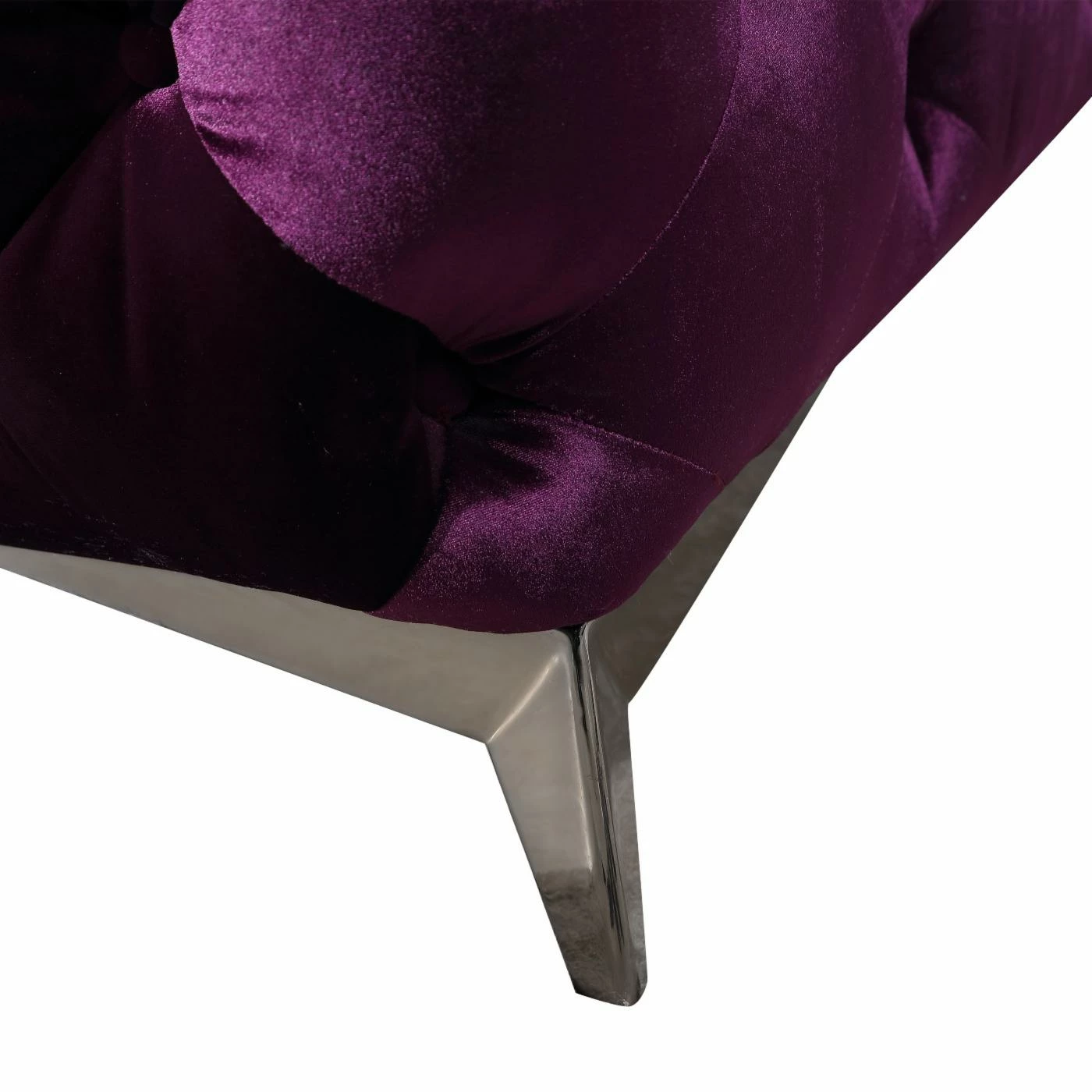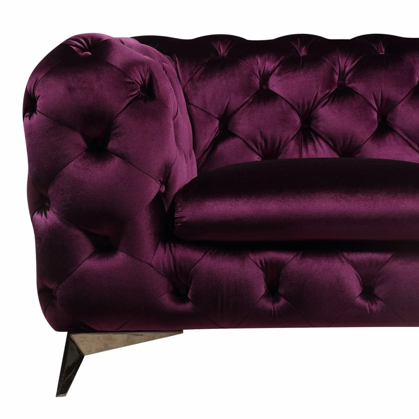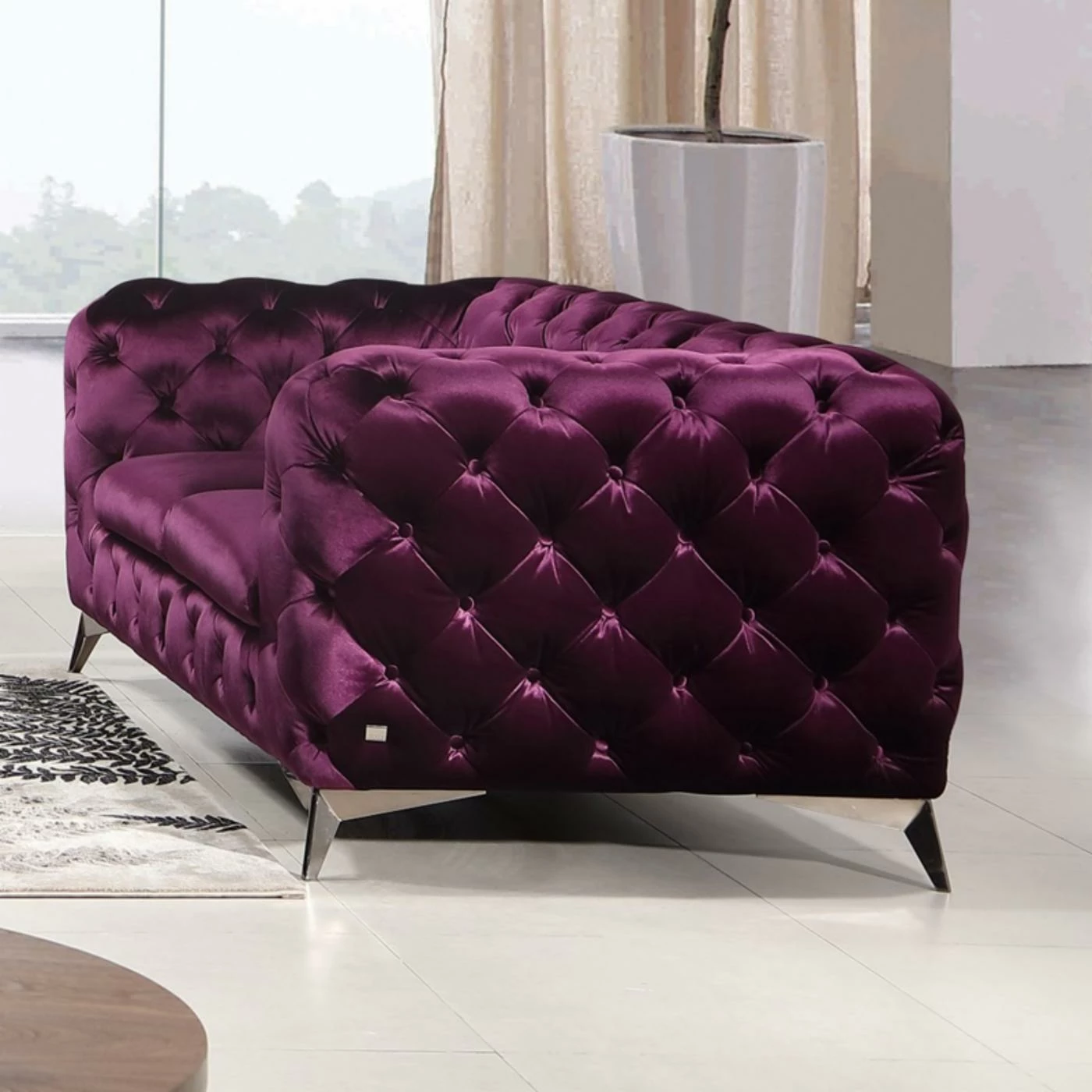 Hand-sewn velour upholstery gives the J&M Furniture Glitz Loveseat its vintage Hollywood glamour. Your choice of available color story makes it yours. This two-seater is perfect for your smaller living space or as an addition to your larger living room set-up. The loveseat is deeply button tufted and sits on flared, angular metal legs.