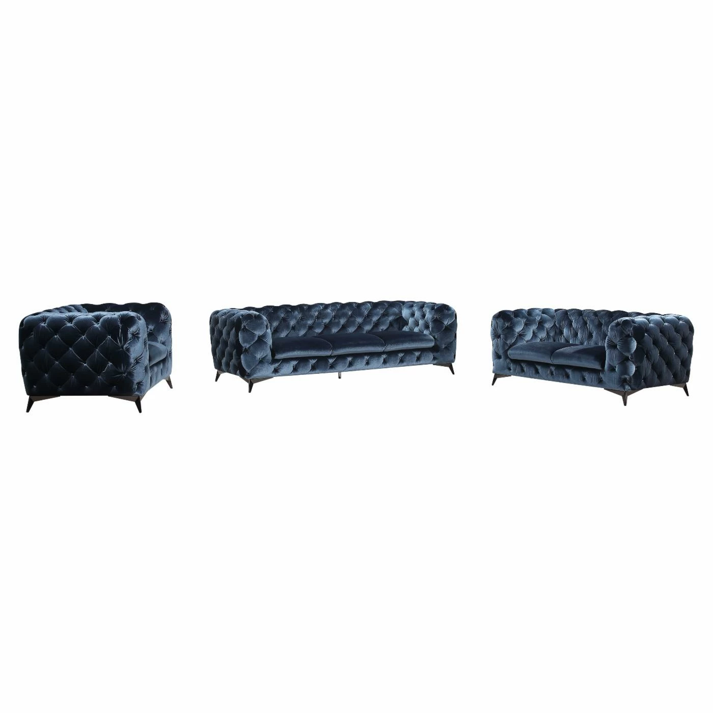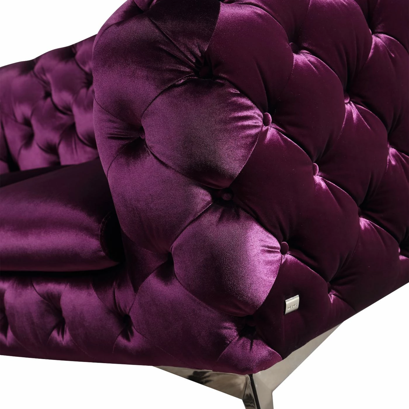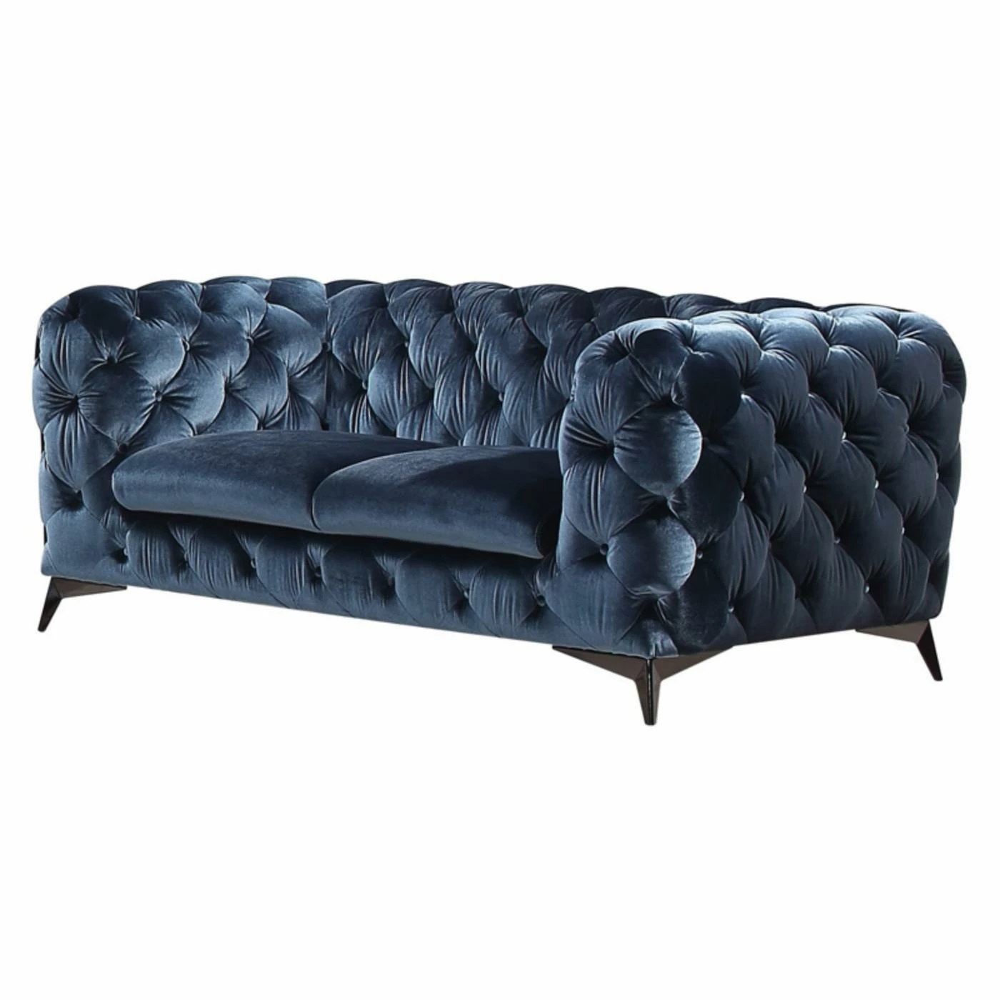 Hand-sewn velour upholstery gives the J&M Furniture Glitz Loveseat its vintage Hollywood glamour. Your choice of available color story makes it yours. This two-seater is perfect for your smaller living space or as an addition to your larger living room set-up. The loveseat is deeply button tufted and sits on flared, angular metal legs.