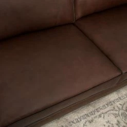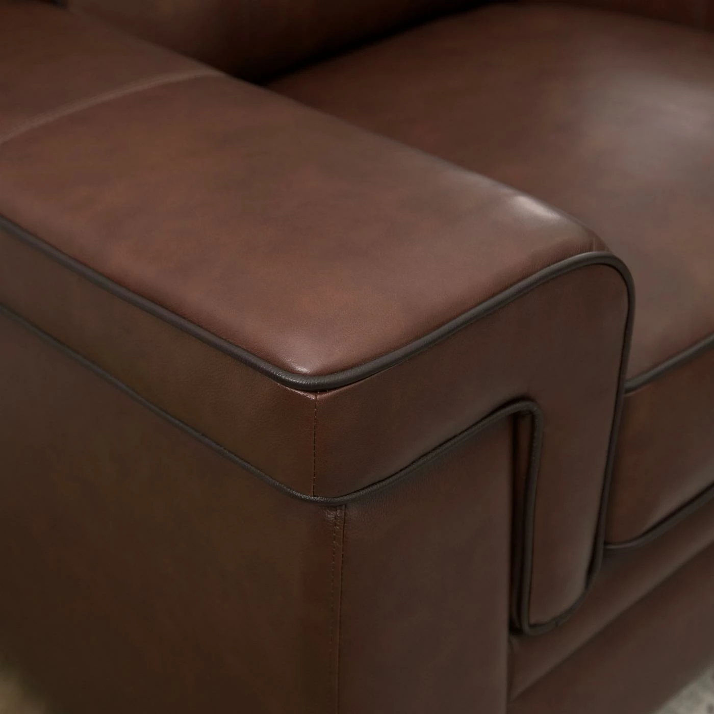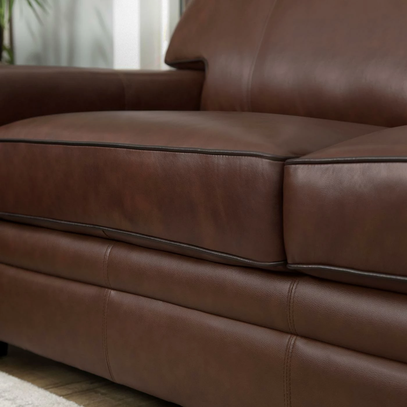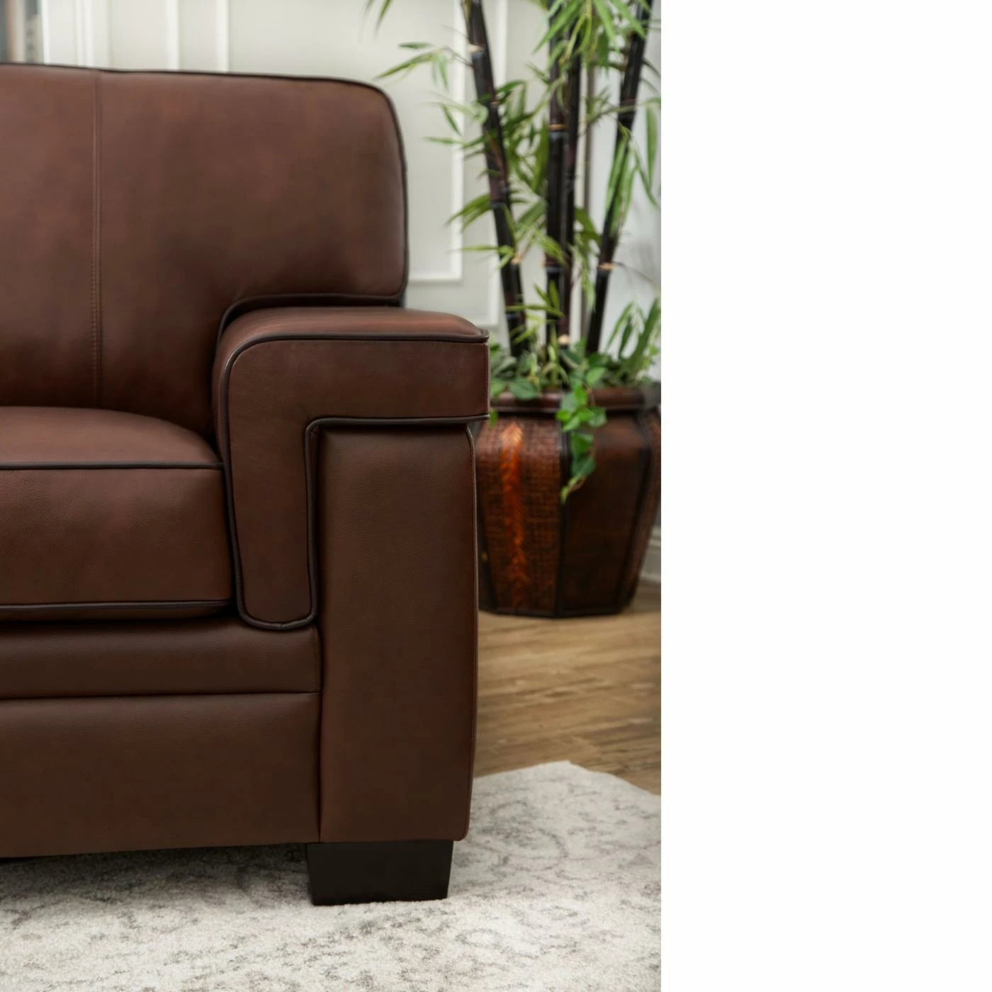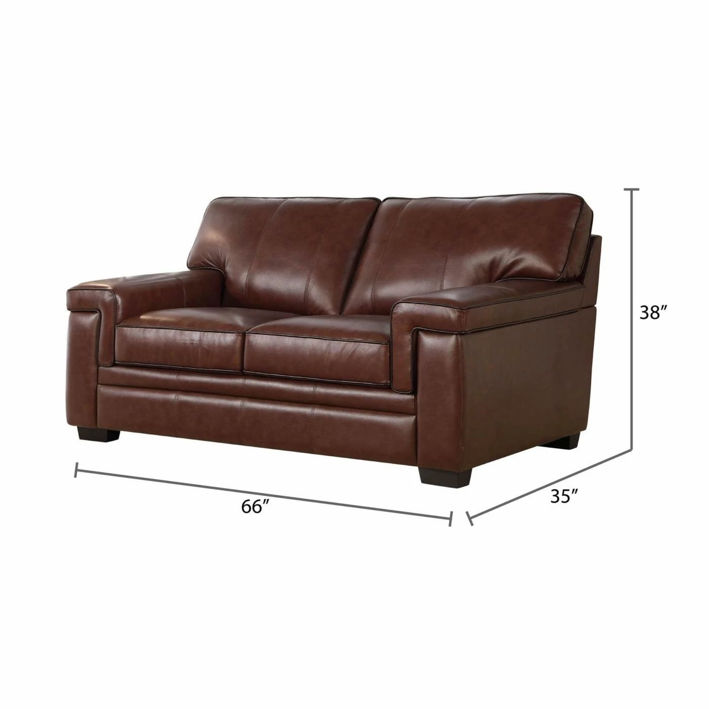 Provide your new living room or dining room with a comfortable spot for up to two with the Abbyson Leo Top Grain Leather Loveseat. This love seat has a wide frame that’s padded thoroughly with dense foam. Handsome top-grain leather upholsters the piece, accented with welted seams. Kiln-dried hardwoods construct the piece, perched on dark brown block feet. The leather has an alluring brown tone to match. Assembly required.