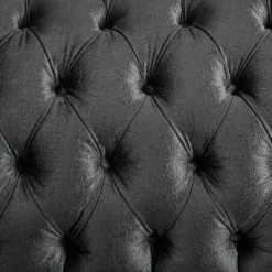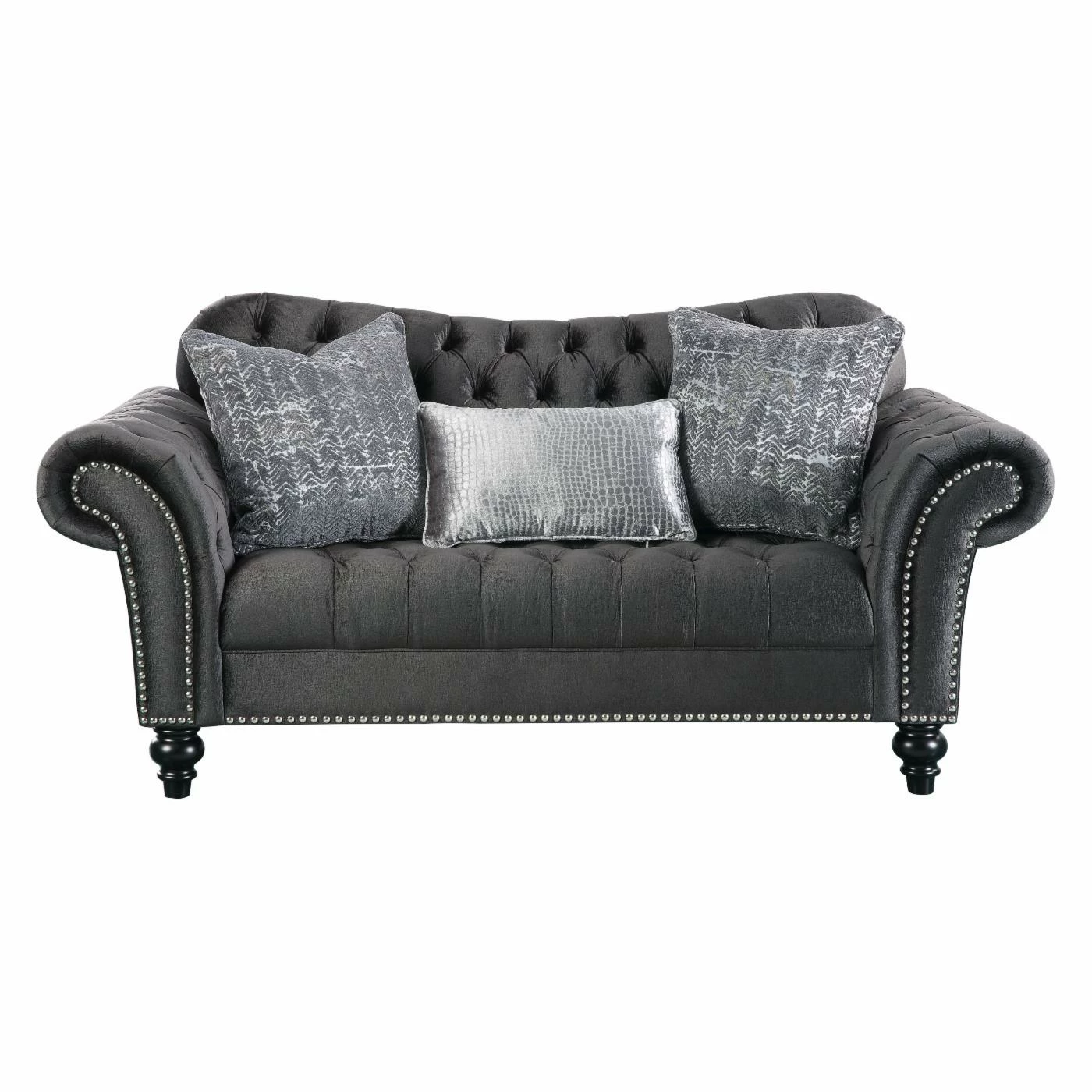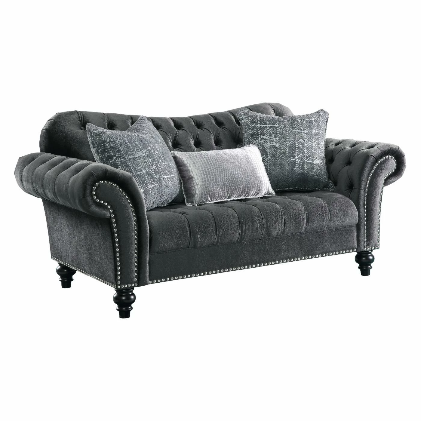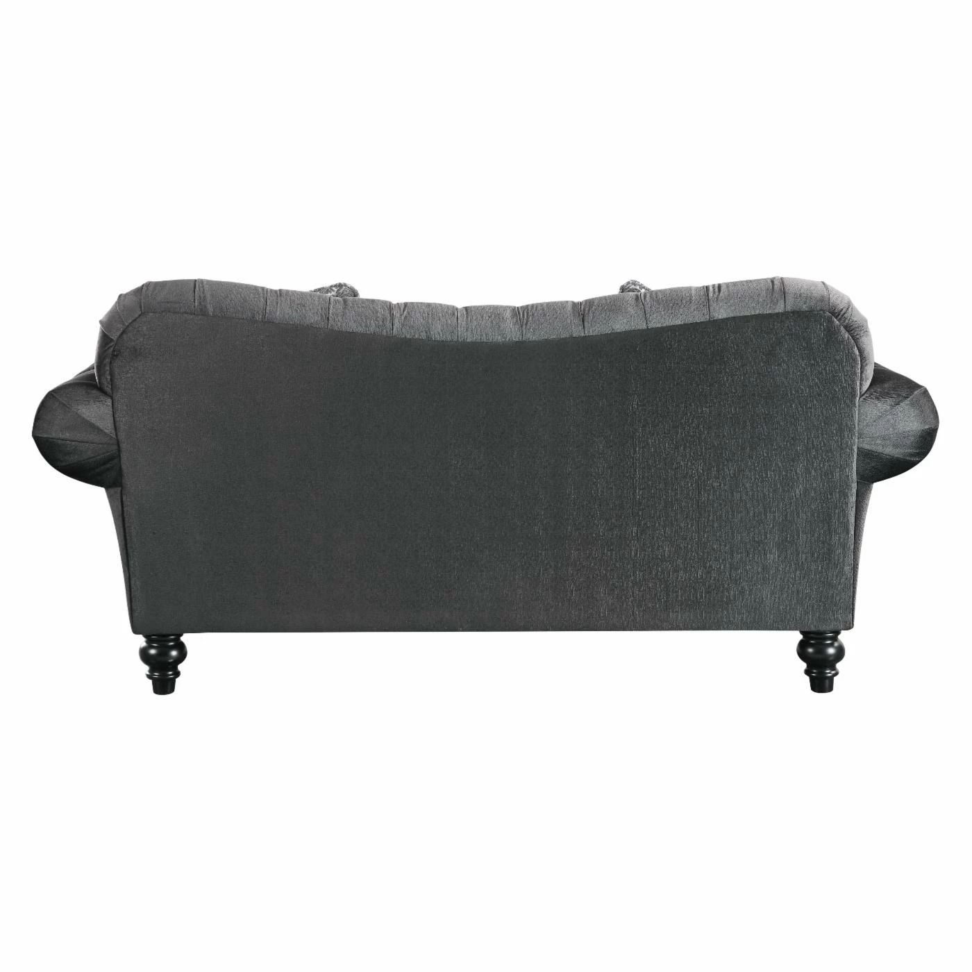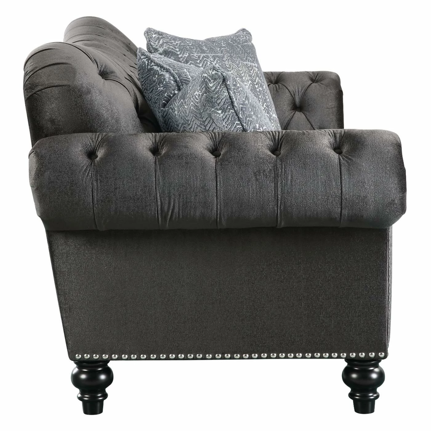 A subtle sheen adds glamour to dark gray fabric upholstery on the Acme Furniture Gaura Loveseat. A trio of coordinating throw pillows make it sumptuously comfortable. The tight, curved backrest, flared, rolled arms, and tight seat of this loveseat are enriched by deep button tufting. Nail head trim and turned bun feet add an edge.