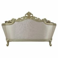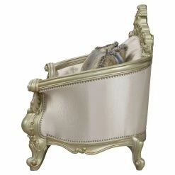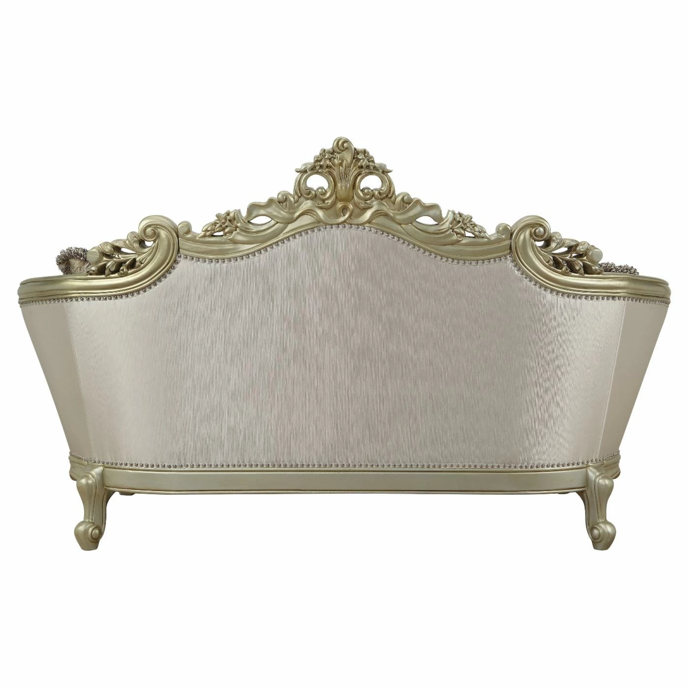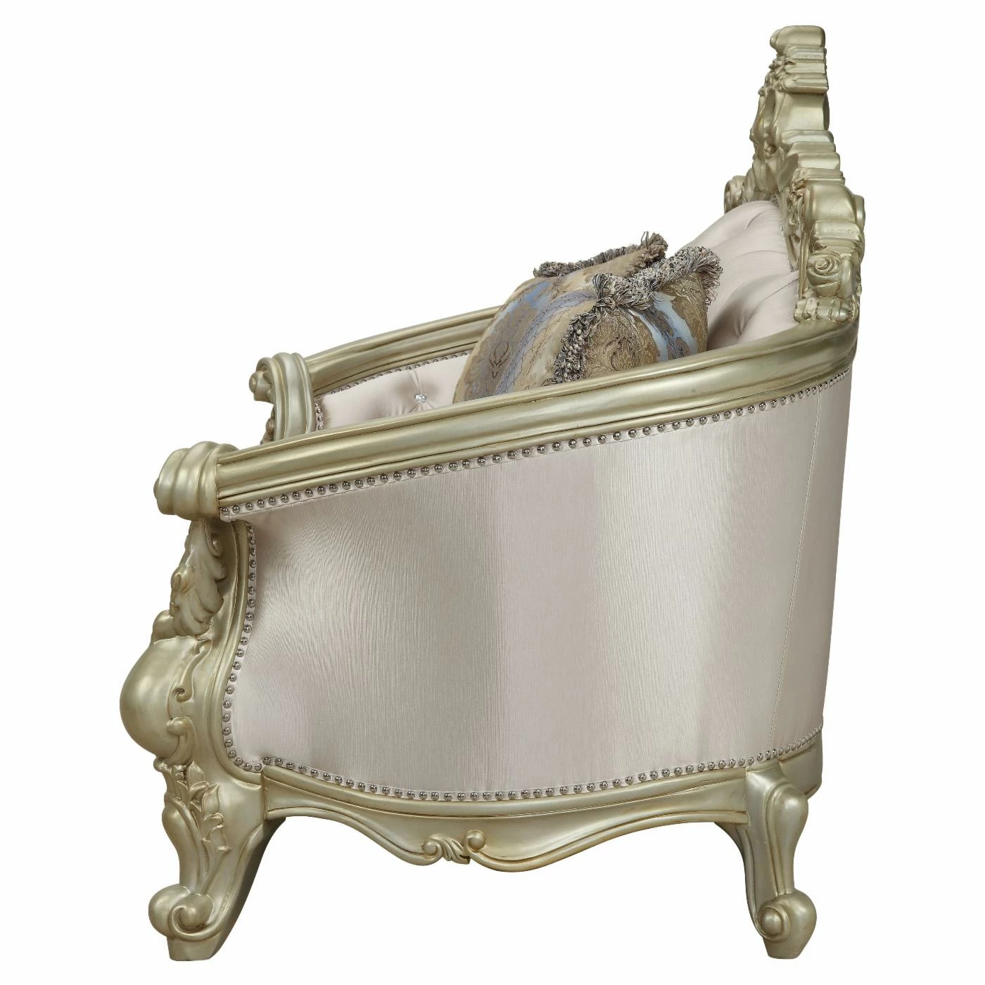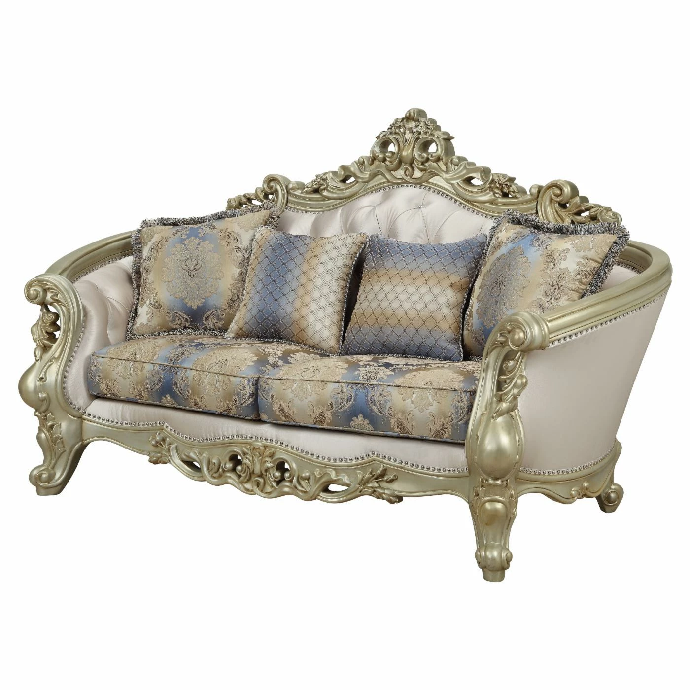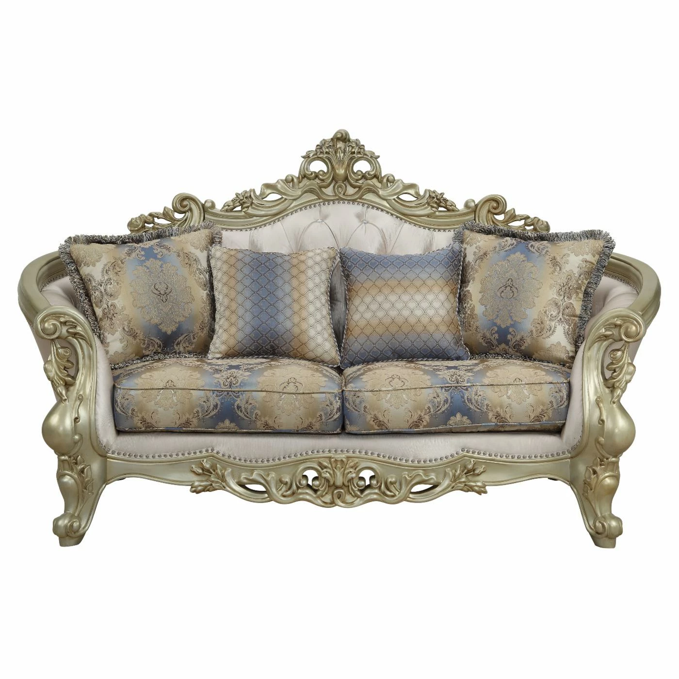The baroque-inspired Acme Furniture Gorsedd Loveseat With 4 Pillows is elaborately carved and graced by sumptuous upholstery. This majestic loveseat is crowned by a carved backrest, inspired by intricately carved arm fronts, and perches on Queen Anne legs. Its antique champagne finish is complemented by solid cream colored fabric with coordinating blue and beige damask seat cushions and accent pillows to match. Designer details include nail head trim and crystal button tufts. Search out other pieces in the Gorsedd collection for a cohesive living space.