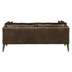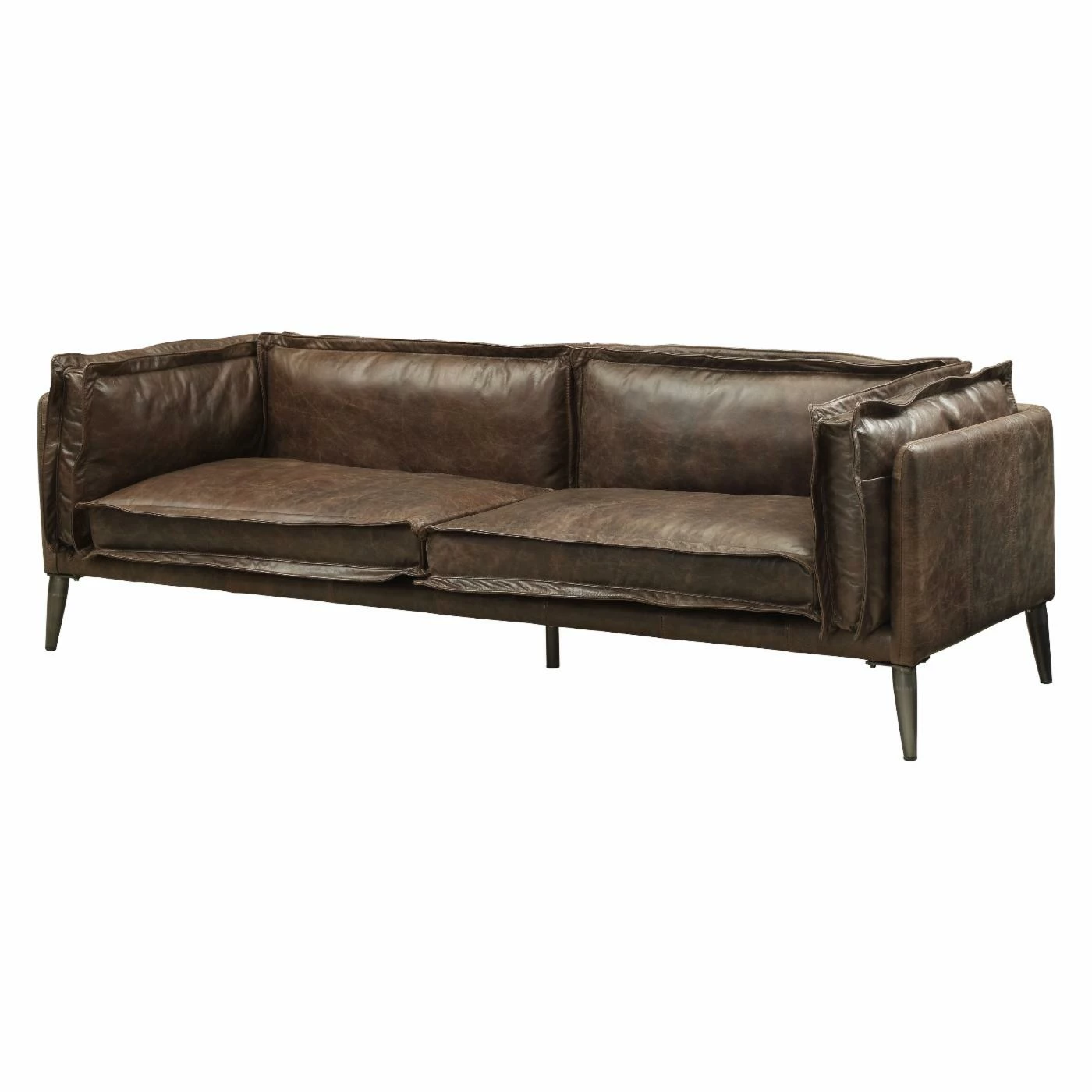 Distressed chocolate top grain leather and premium down feather fill cushions make the Acme Furniture Porchester Loveseat a luxurious addition to your sitting room. This shelter loveseat’s cushions boast double flange trim for added detail. To lend a mid-mod silhouette, it sits on tapering metal dowel legs in dark bronze.