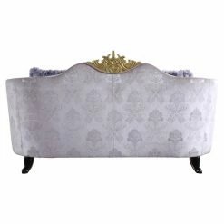 Adorn your living room with a charming place to hold conversation or catch a quick nap with the Acme Furniture Sheridan Loveseat with 5 Pillows. This loveseat has a rising, curved back and armrest that comes to a peak with a molded crown medallion. Durable wood constructs the frame, outfitted with cabriole feet (finished in black). Elegant cream fabric upholsters the loveseat, pattern with medallion-embroidered embroidery. Four matching toss pillows are provided.