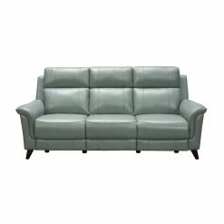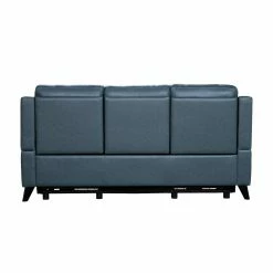 The Barcalounger Kester Leather Power Reclining Sofa is a mid-century modern elevated reclining sofa with power recline and power headrests. This sofa features box seat style pad over chaise seating with pocketed coil springs, tucked pillow arms, and clean line pub backs. Power buttons have USB ports to keep your devices charged. Choose from optional leather color with dark teak finished legs.