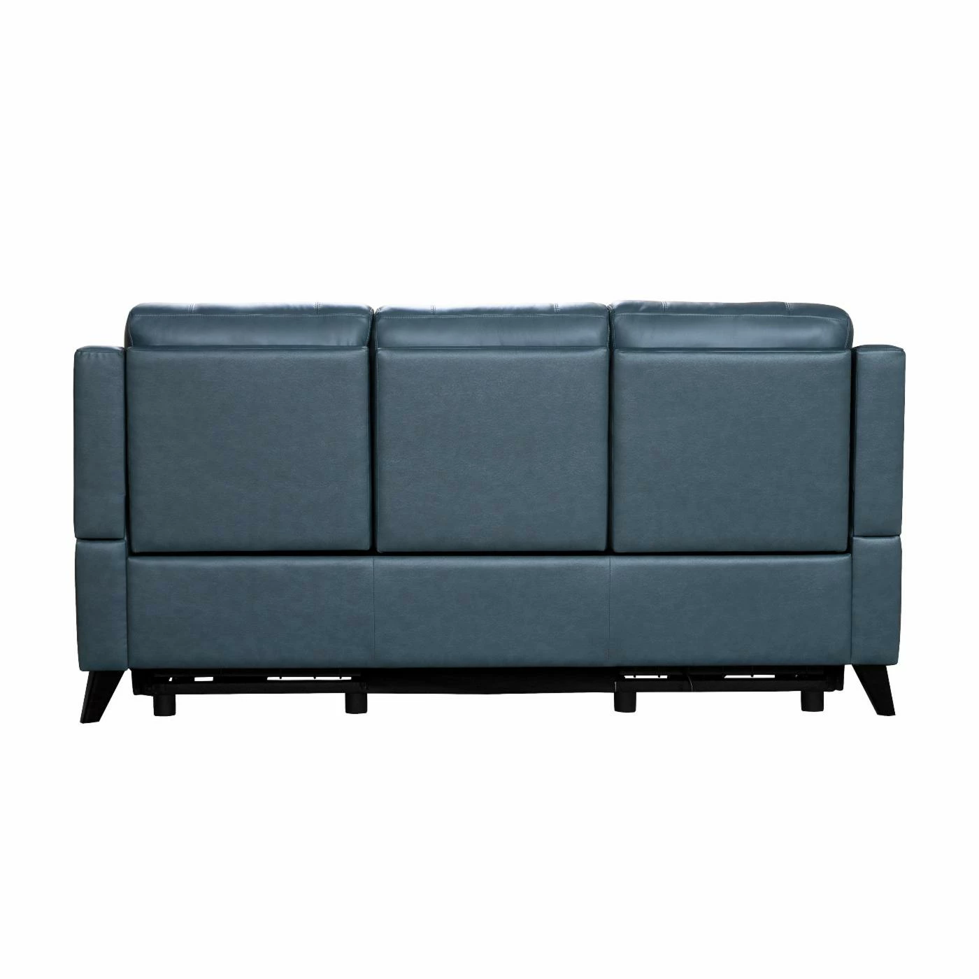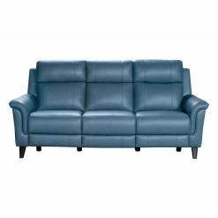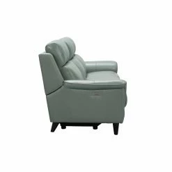 The Barcalounger Kester Leather Power Reclining Sofa is a mid-century modern elevated reclining sofa with power recline and power headrests. This sofa features box seat style pad over chaise seating with pocketed coil springs, tucked pillow arms, and clean line pub backs. Power buttons have USB ports to keep your devices charged. Choose from optional leather color with dark teak finished legs.