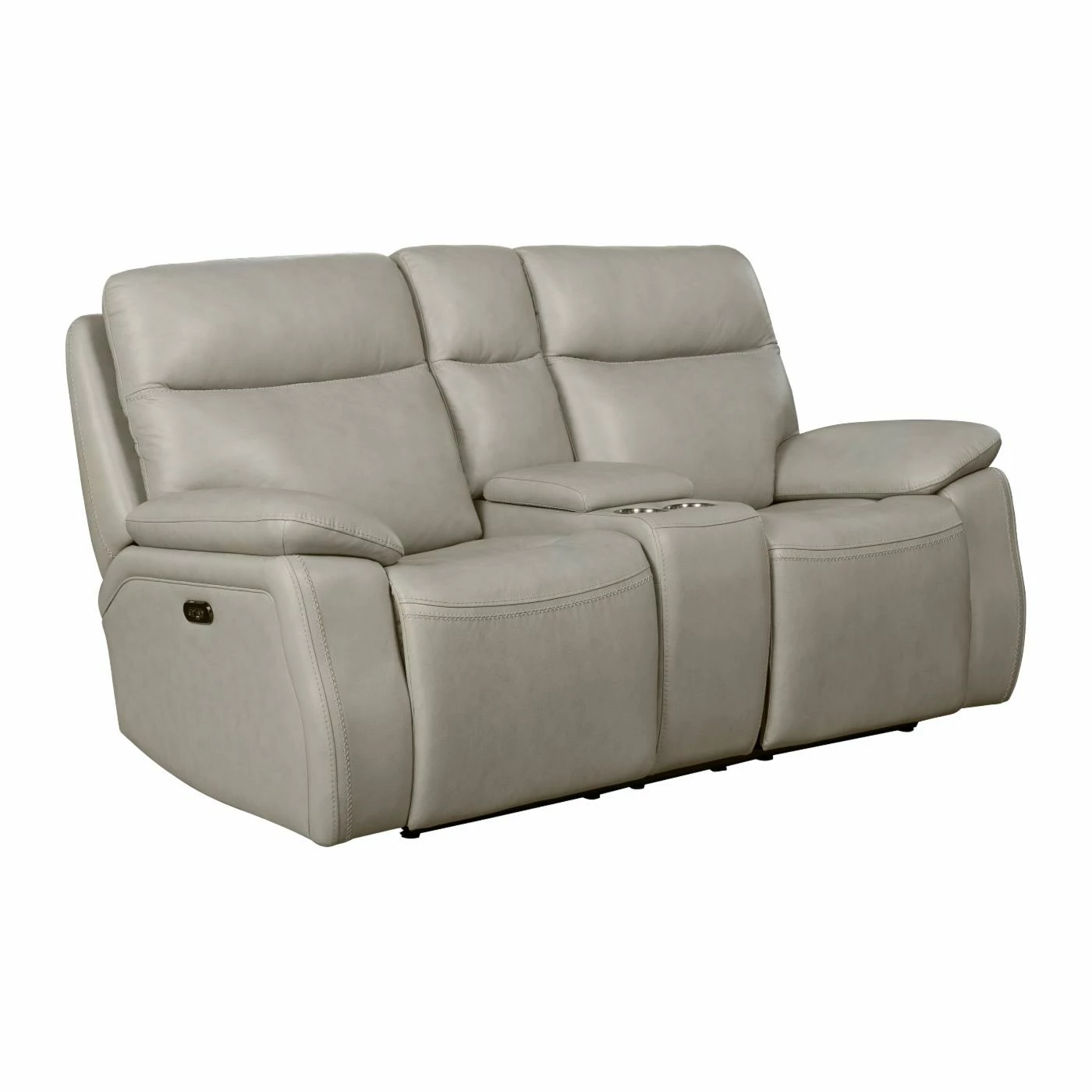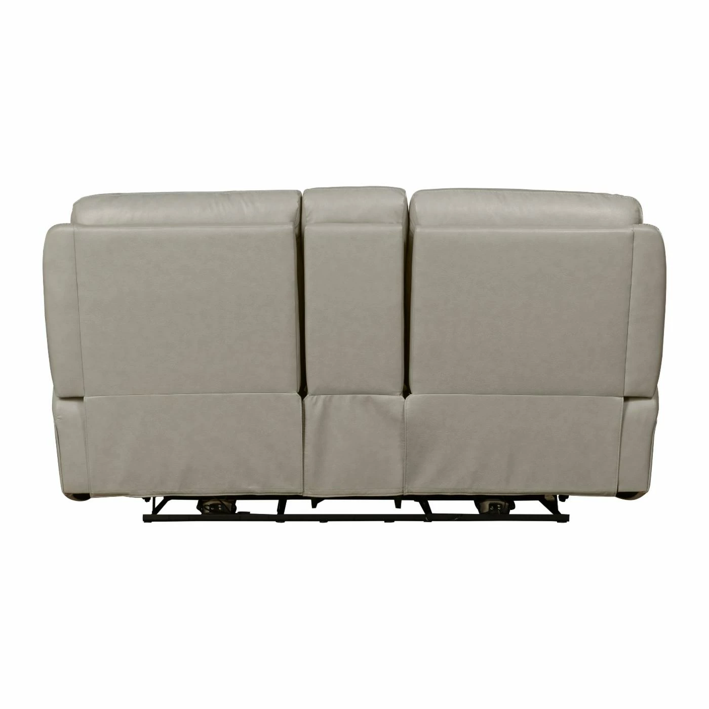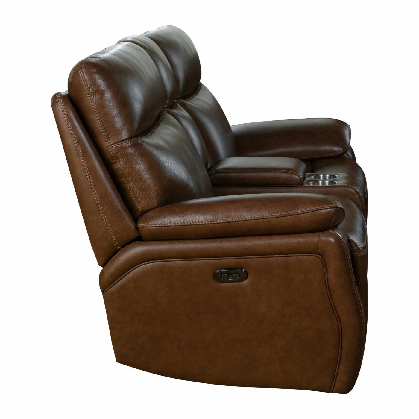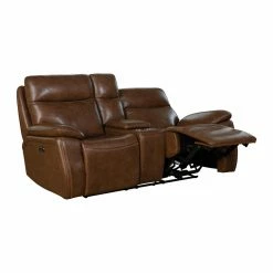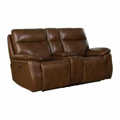 Match your modern sofa with the Barcalounger Micah Console Loveseat for an additional seating option with plentiful user comfort. The two wide seats each boast a powered recline function and headrest, controlled by side-mounted buttons. Plush medium-density foam pads the seats, bolstered by pocket-coil springs in the seats for support. Between the seats is a lift-top console storage area for keeping remotes and two cup-holders for your favorite beverages. Lush leather-match upholstery tops the piece; choose among the available color options. Solid hardwood and steel constructs the frame.