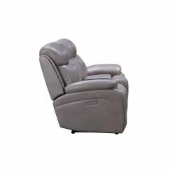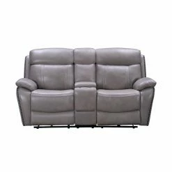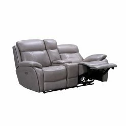 The Barcalounger Sandover Leather Power Reclining Console Loveseat is a blend of casual and transitional styles. It has a power reclining mechanism with a power headrest and added lumbar support. For added comfort, the pocket coil springs feature foam padding. The center console has storage plus 2 USB ports, 2 electrical outlets and 2 stainless steel cup holders. The ?ared track pillow arms are accented with nail head trim, and the plush 42.5 in. high pub back has and added strap detail. Power buttons also have USB ports to keep additional devices charged.