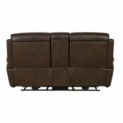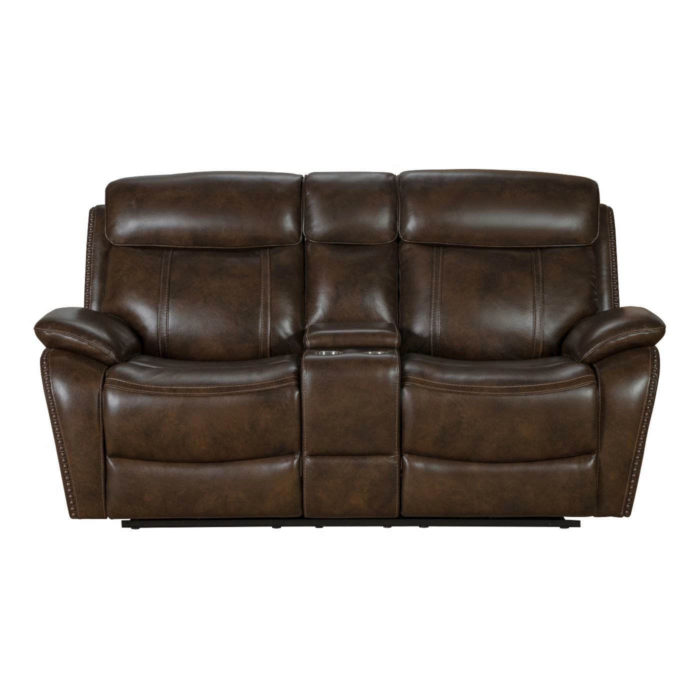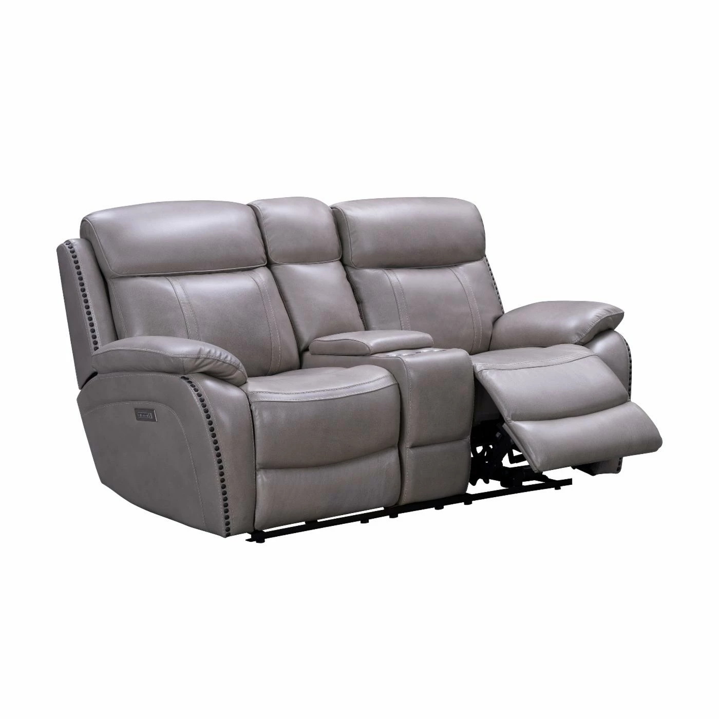 The Barcalounger Sandover Leather Power Reclining Console Loveseat is a blend of casual and transitional styles. It has a power reclining mechanism with a power headrest and added lumbar support. For added comfort, the pocket coil springs feature foam padding. The center console has storage plus 2 USB ports, 2 electrical outlets and 2 stainless steel cup holders. The ?ared track pillow arms are accented with nail head trim, and the plush 42.5 in. high pub back has and added strap detail. Power buttons also have USB ports to keep additional devices charged.