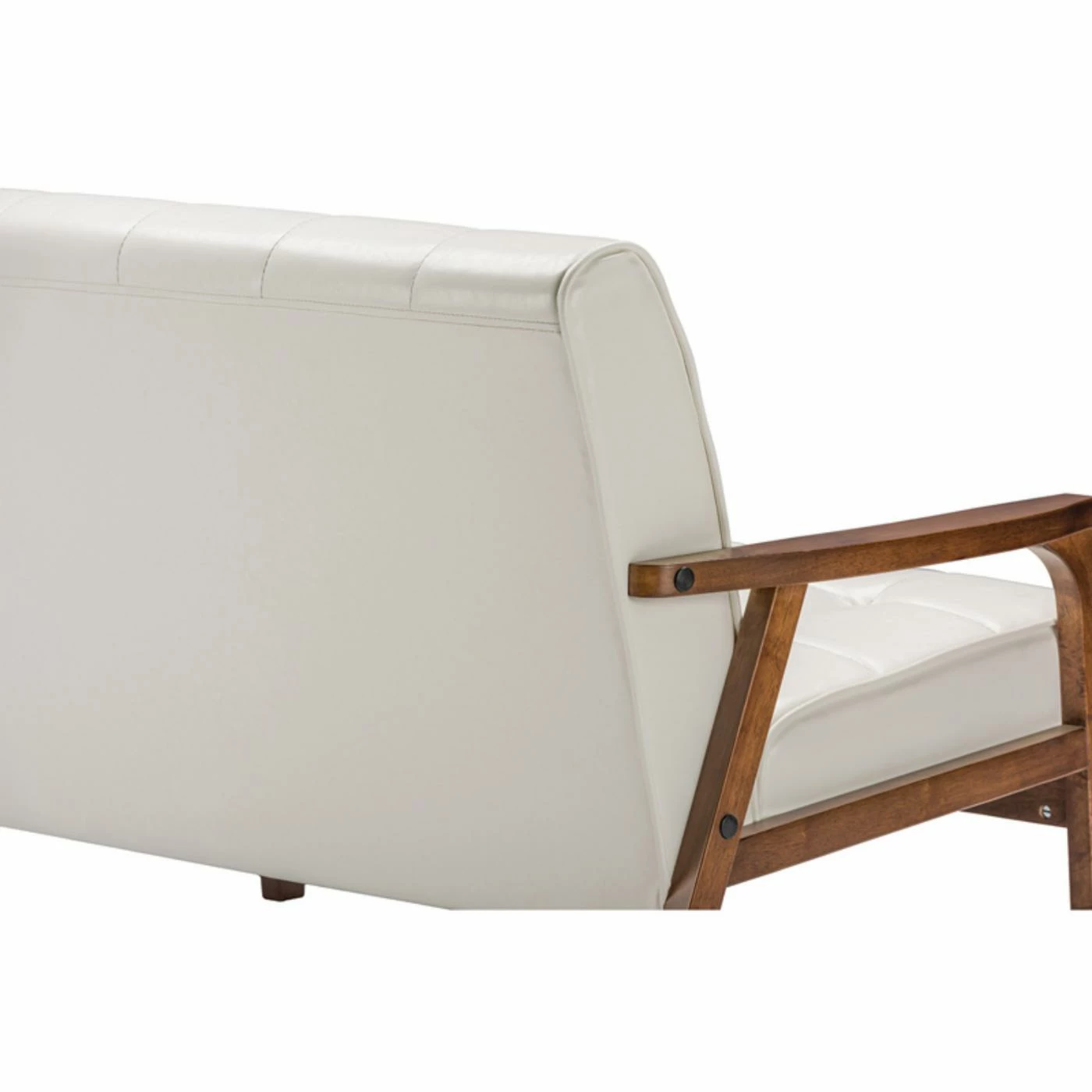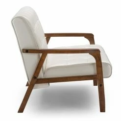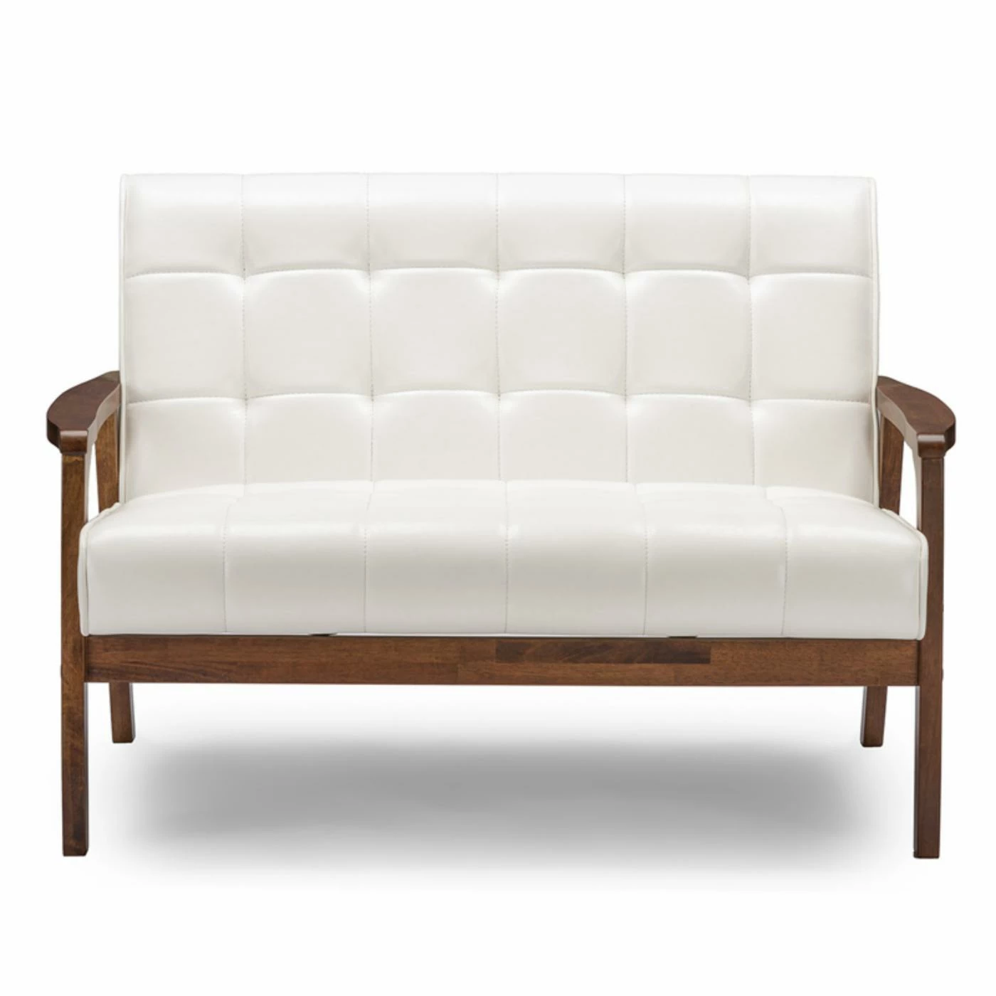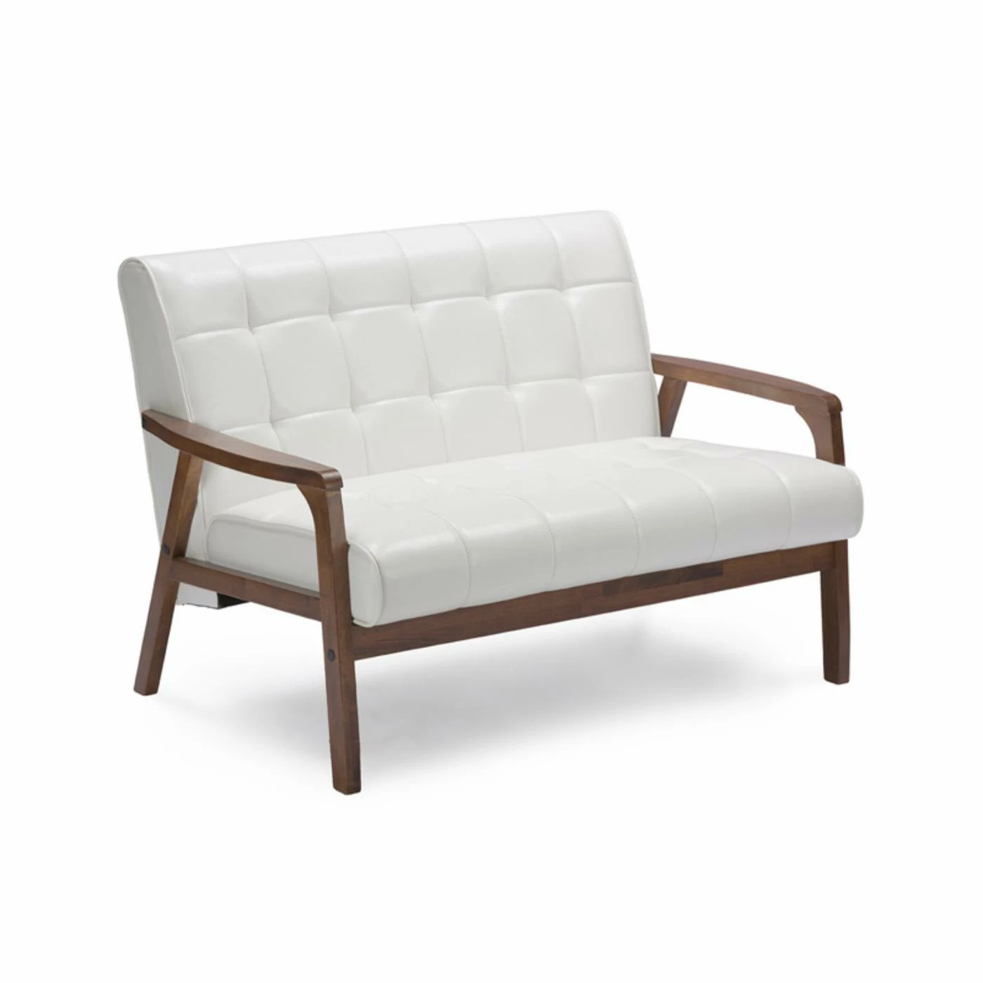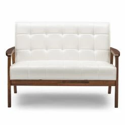 While the Baxton Studio Mid-Century Masterpieces Loveseat has a retro look, it fits perfectly into any modern design aesthetic. This mid-century beauty features a classic A frame made of solid rubberwood in a handsome medium brown wood veneer finish. Its upholstered in bright white faux leather that is luxurious and easy to clean. Comfort lives in the high-density polyurethane foam cushioning on this loveseat. All over grid tufting enhances the vintage vibe.