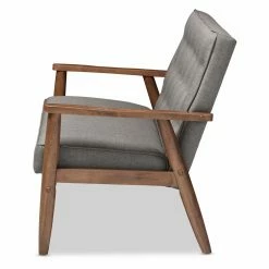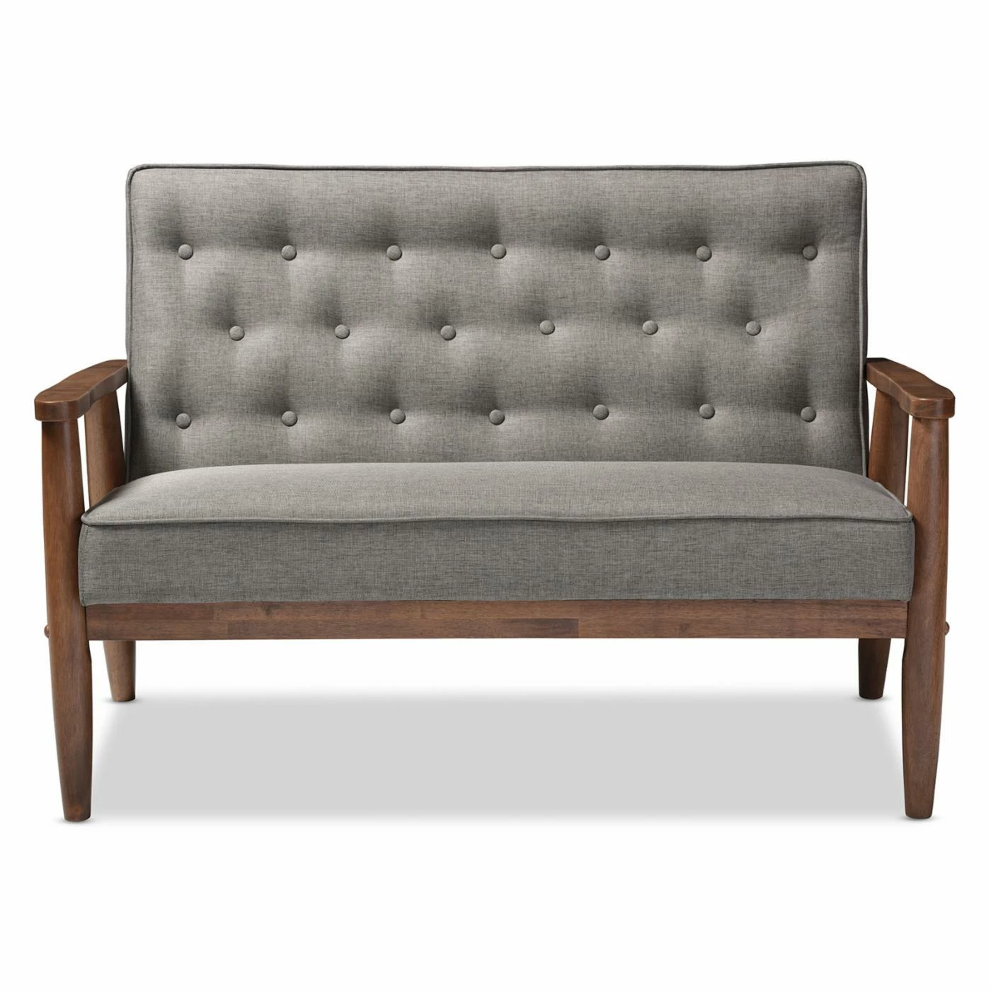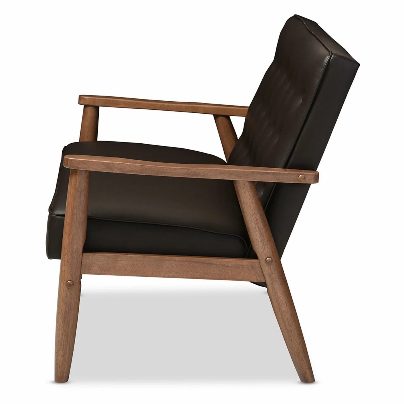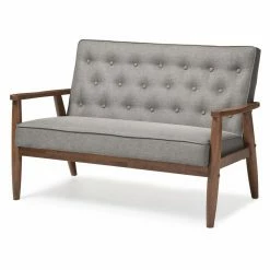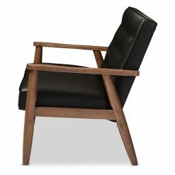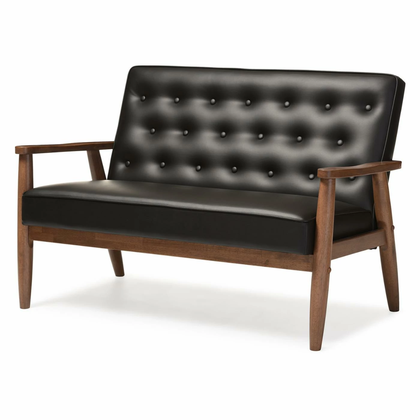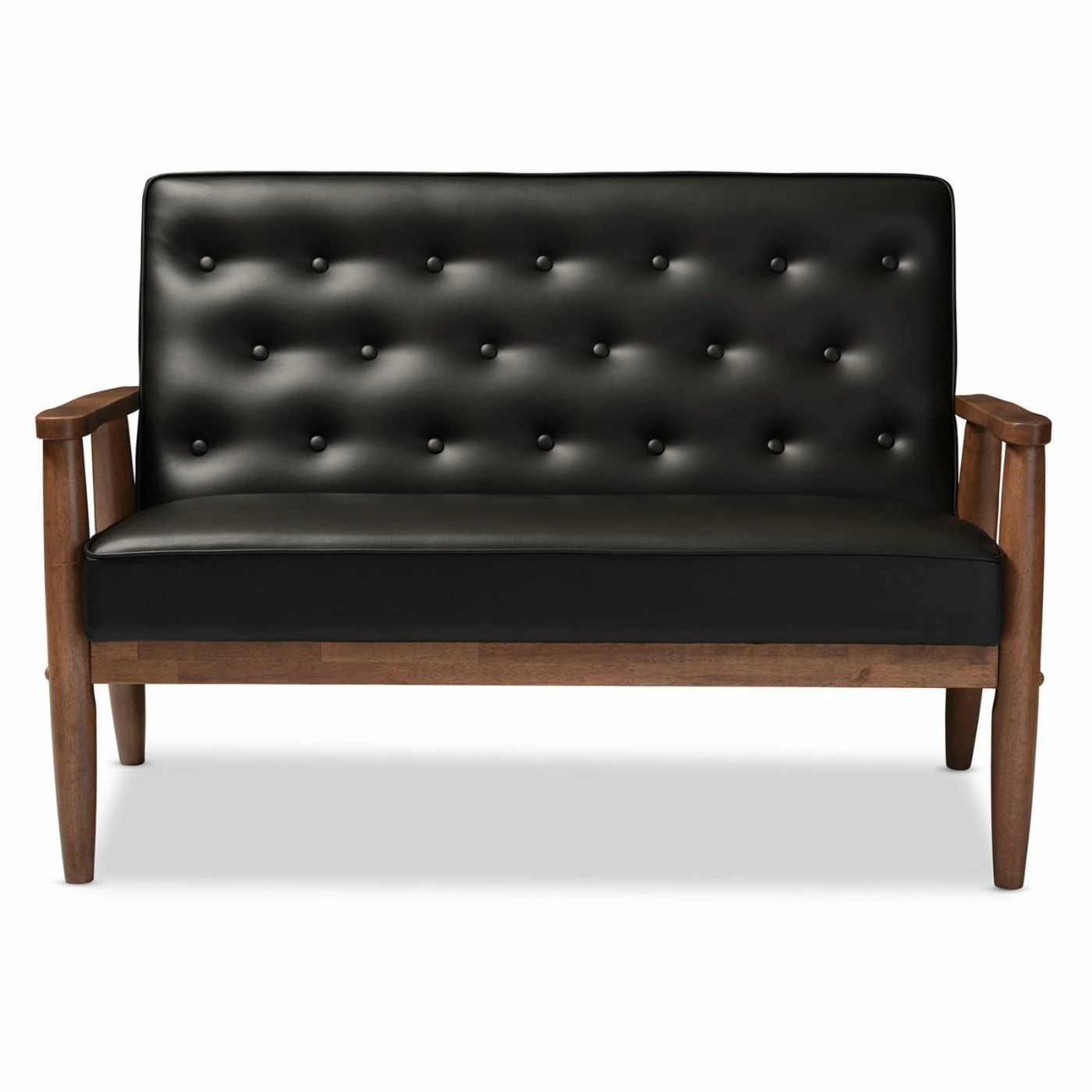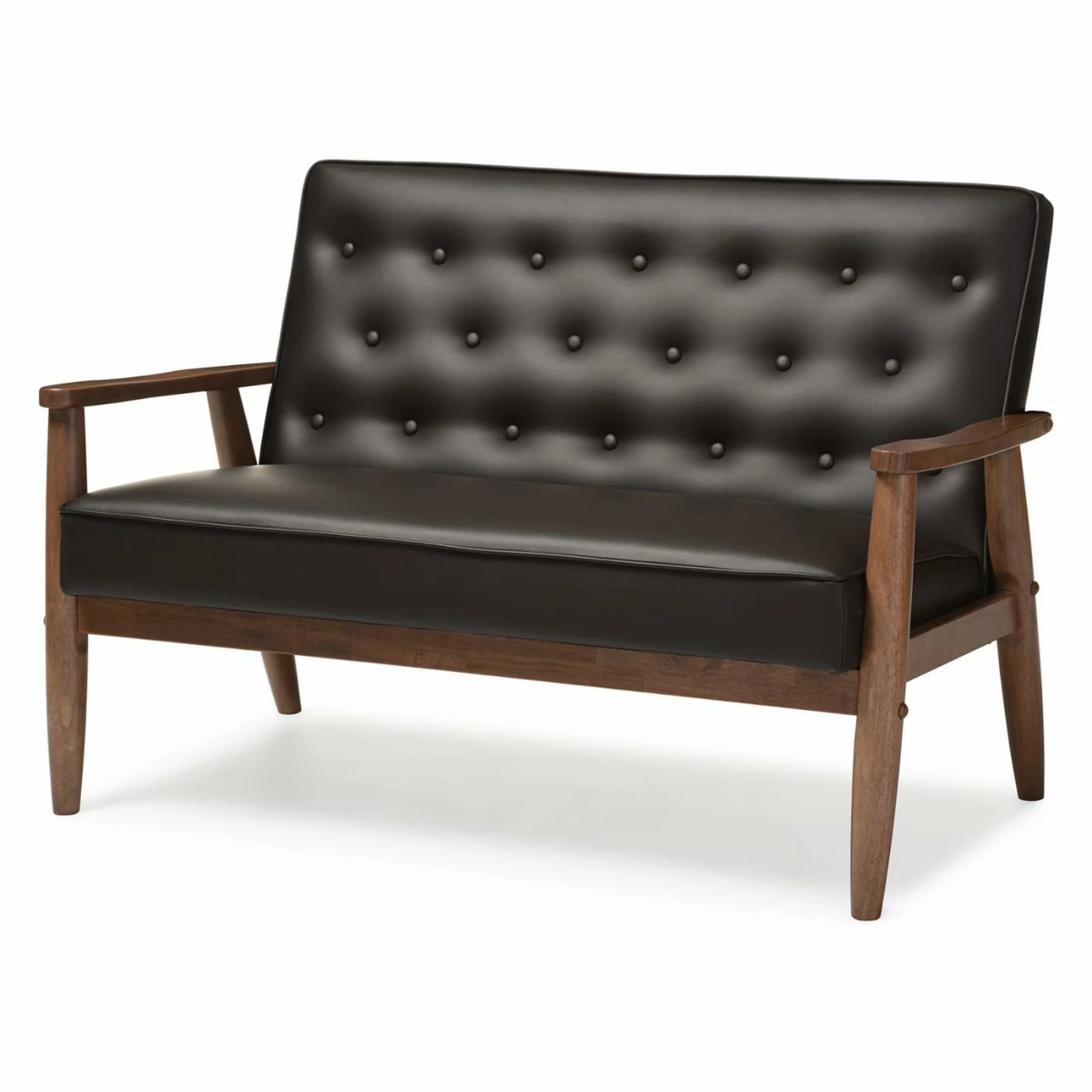 Bring a mid-century modern touch into your home with the Baxton Studio Sorrento Loveseat. A wide frame and sculptural arms add intrigue to this sleek piece, which features faux leather upholstery for a rich touch. Retro touches, including splayed legs and button tufting, complete this loveseat, which can comfortably seat two people.