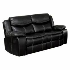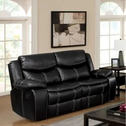 Pillow padding on the seats, headrests, and arms makes the Benzara Gatria Reclining Loveseat a luxurious place to sit while you read, watch TV, or chat with friends. The loveseat is clad in black faux leather upholstery and top stitched for a finely tailored appearance. Equipped with manual mechanisms, both seats smoothly recline to help you relax and unwind.