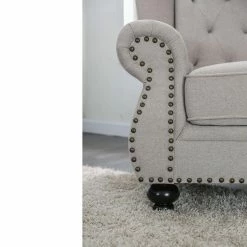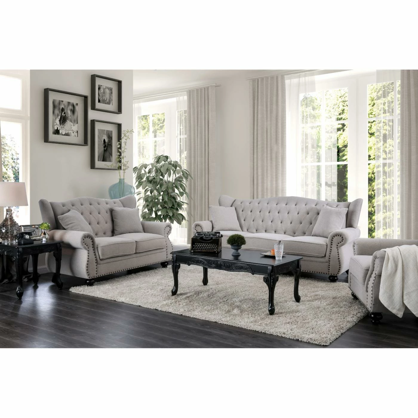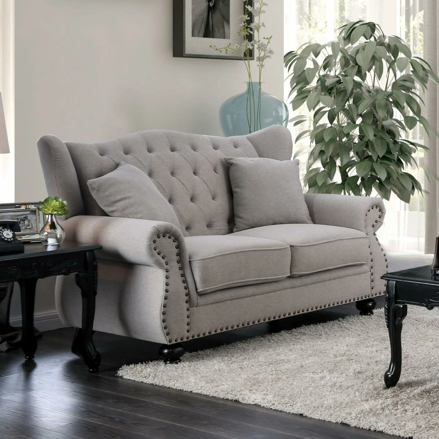 A modern loveseat with a traditional twist, the Furniture of America Allenville Tufted Loveseat offers comfort and class. The wooden frame is covered with a light gray linen upholstery. The rolled arms and tufted wingback bring classic considerations into the modern style. The back is button tufted for comfort and aesthetic. The nailhead trim and round bun feet call back to yesteryear while staying rooted in the present. Pair with the Allenville Tufted Sofa for a complete look.