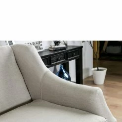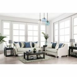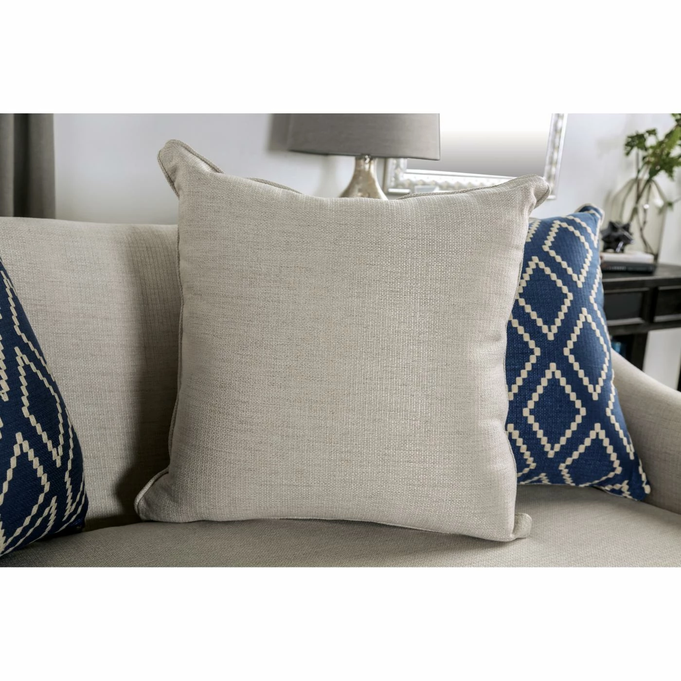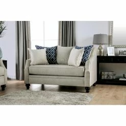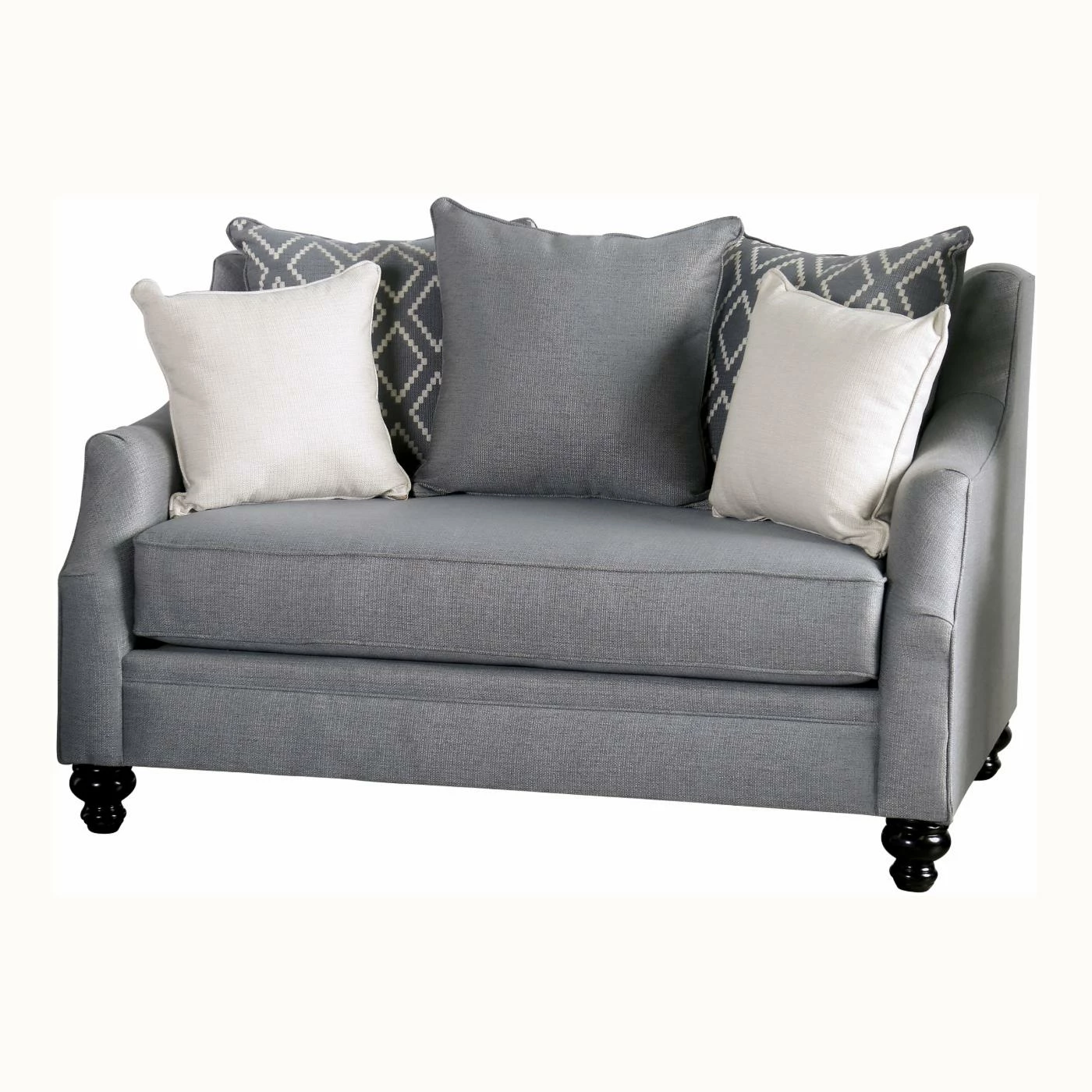 A contemporary couch with traditional accents, the Furniture of America Arundel Sloped Arm Loveseat is just the ticket for a living room upgrade. Woven burlap upholstery sits comfortably a wooden frame. The single seat cushion features medium density foam for your comfort. The sloping arms and turned wooden feet give a nod to traditional craftsmanship. The loveseat comes complete with loose back and accent pillows, patterned for contrast and complement. Pair with the Arundel Sloped Arm Sofa for a complete set. For a customized look, choose from available color options.