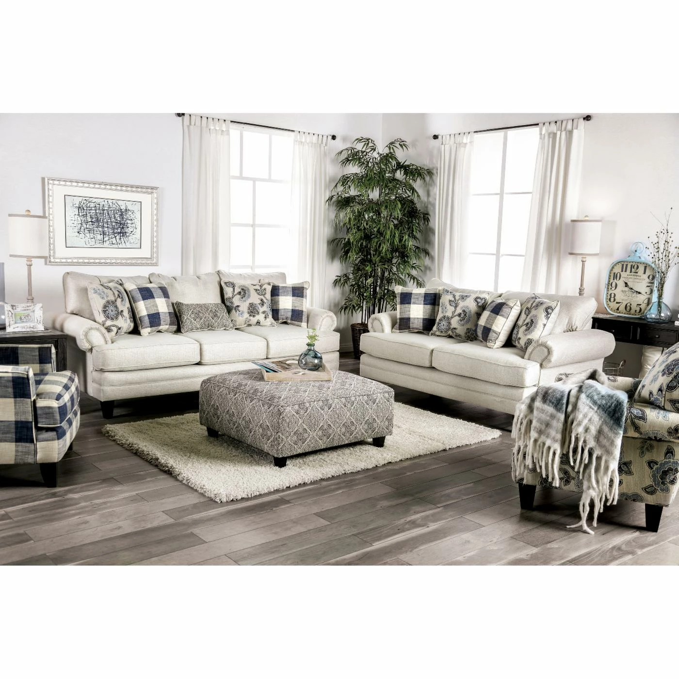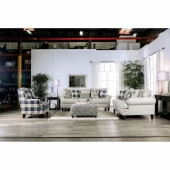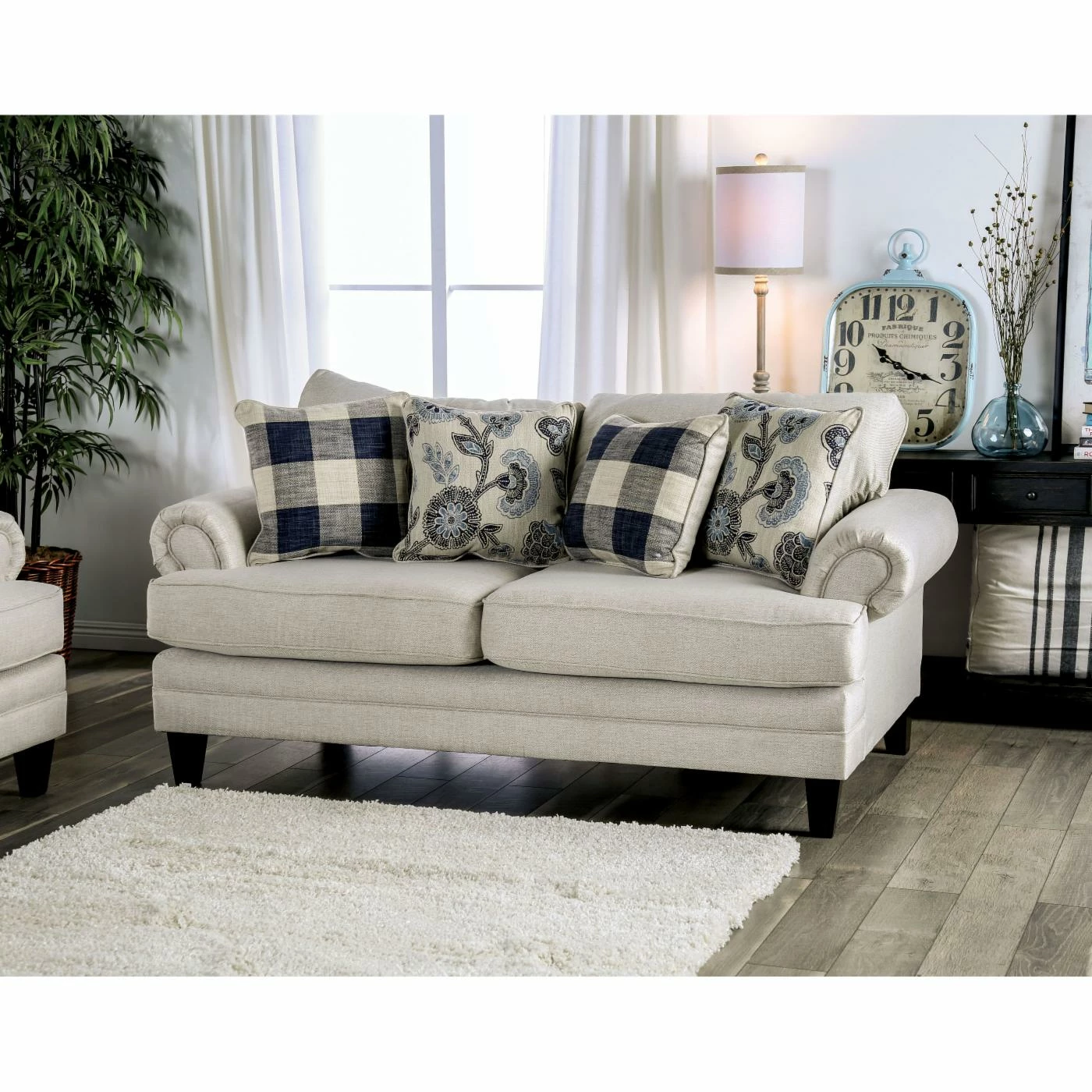It’s easier than ever to bring traditional style into the present with he Furniture of America Deveraux T-Cushion Loveseat. This off-white loveseat is upholstered in a linen-look fabric for a homey, woven feel. Classic rolled arms and T-cushions add to the cozy silhouette of this settee. Accent pillows are included in coordinating ivory and blue patterns, so you don’t have to worry about finding matching pieces. The transitional-meets-traditional look of this loveseat matches most home dΓ©cor, and you can tell any guests with pride that it was made in America.