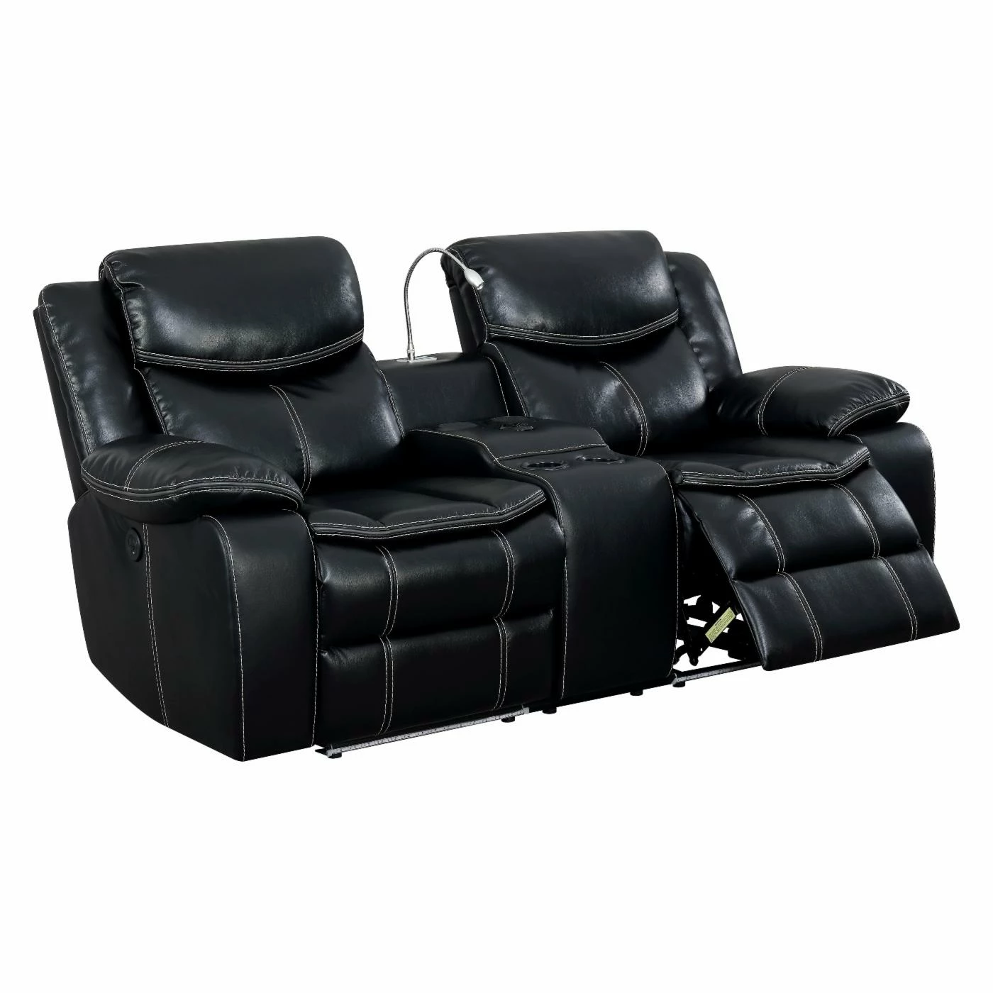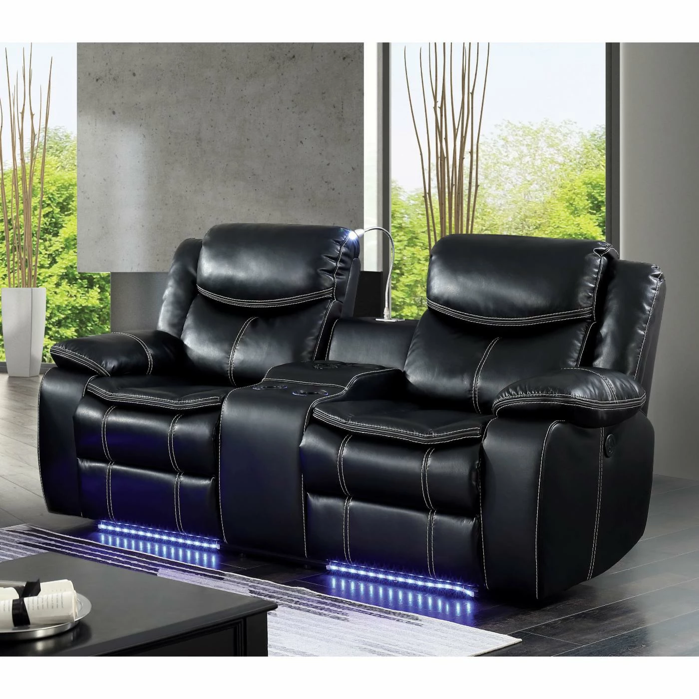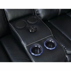 It’s the seats that really make the theater, and the Furniture of America Kristoffer LED Bluetooth Power Recliner Loveseat is going to be the a big part of creating that home-theater experience that you’ve been wanting. This dual-seat loveseat features two deep seats with a built-in console in the center. The jet-black color of the supple leatherette is complemented by the subtle touch of contrast stitching. High-density foam gives form to the split-back cushions, thick seats, and pillow-top arms. At the end you have a recliner that lets you put your feet up at a tug of the lever. Along the lower edge of the front is a row of LED lights that make it easy to see where you’re stepping. Assembly required.