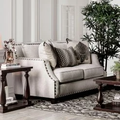 Your new loveseat may only be one part of your living room-makeover to-do list, but the Furniture of America Langston Contemporary Chenille Loveseat is quickly going to be a major player in your new style upgrade. This loveseat combines glamour with flexibility of style. The straight arms and high back add a modern feel, but the pillow-style back and matching accent cushions give it a casual, approachable style. The exterior is covered in super-soft chenille fabric as nailhead trim lines its silhouette. High-density foam is supported by a frame of solid hardwood that’s designed for years of daily love and attention. Choose from available size and color options. Assembly required.