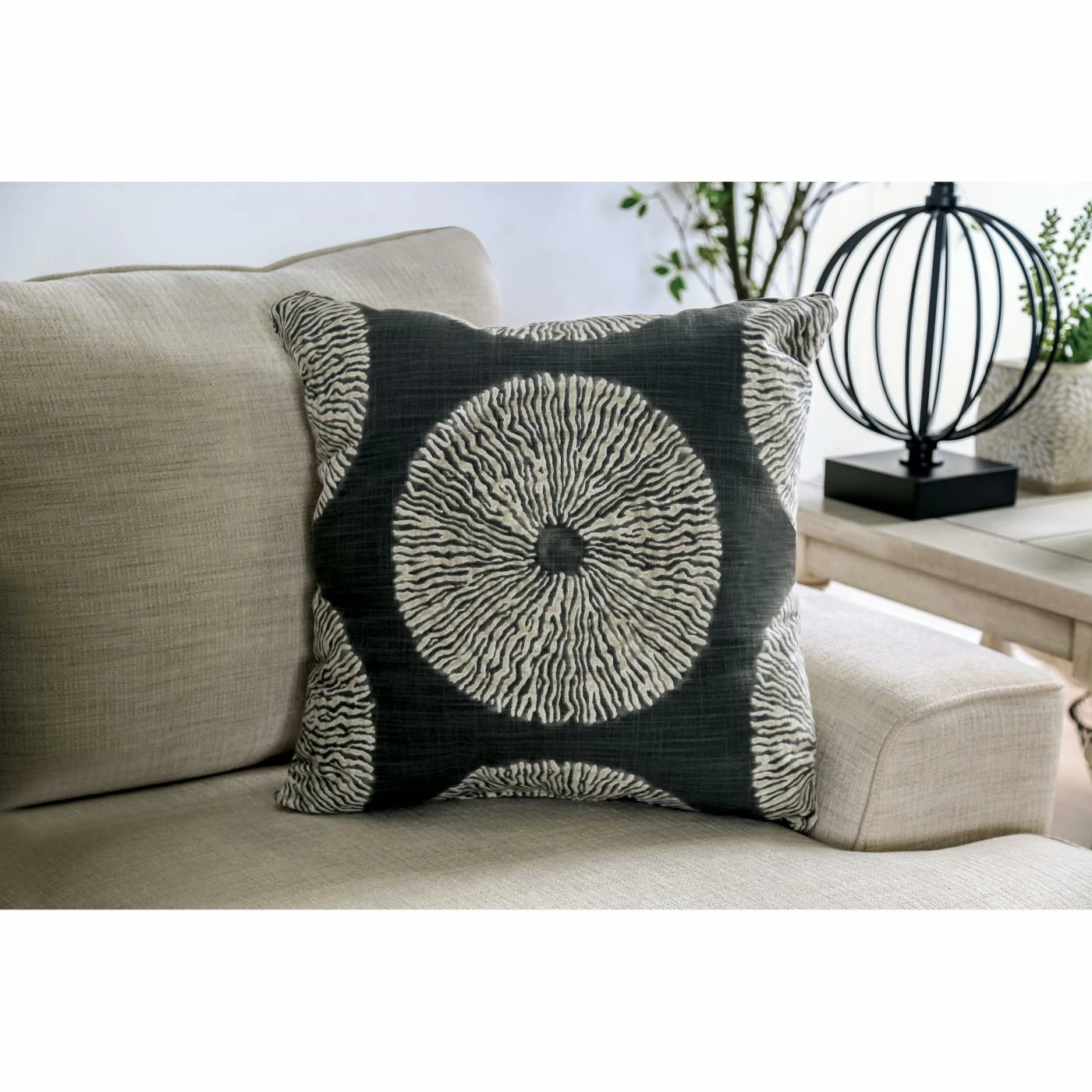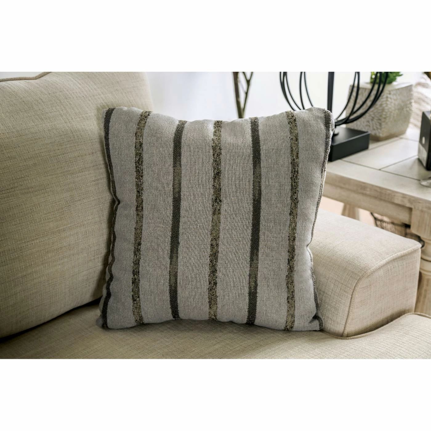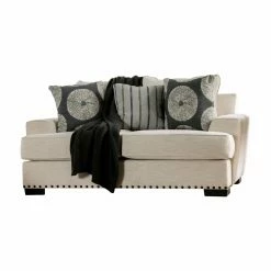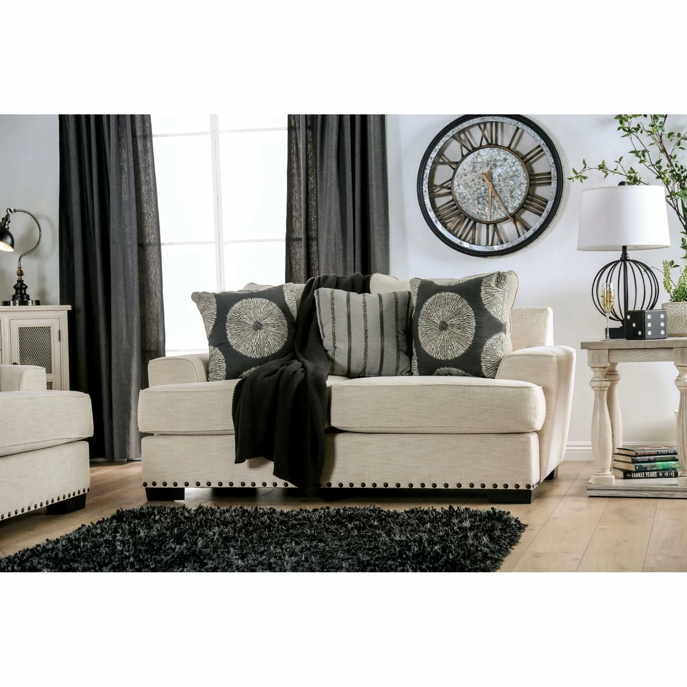 Cuddle up with a buddy on the Furniture of America Lizzie Nailhead Loveseat. Slightly textured ivory chenille covers the entirety of this settee and lends a transitional look to the piece. Accent pillows turn up the drama with charcoal and cream patterns, from stripes to dandelion prints. Around the base of this comfortable loveseat is a bold, sophisticated nailhead trim that adds some traditional edge to your home. Some assembly required.