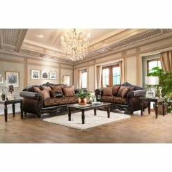 The Furniture of America Maldino Traditional Style Intricate Wood Carved Loveseat creates a bold statement within your home. Pleated arms and intricate carved wood panel details give this loveseat a unique look. Upholstered in two-tone chenille and leatherette, this loveseat features removable cushions and loose back pillows with embossed floral details. Matching accent pillows include.