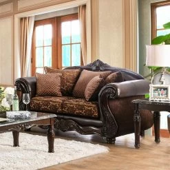 The Furniture of America Maldino Traditional Style Intricate Wood Carved Loveseat creates a bold statement within your home. Pleated arms and intricate carved wood panel details give this loveseat a unique look. Upholstered in two-tone chenille and leatherette, this loveseat features removable cushions and loose back pillows with embossed floral details. Matching accent pillows include.