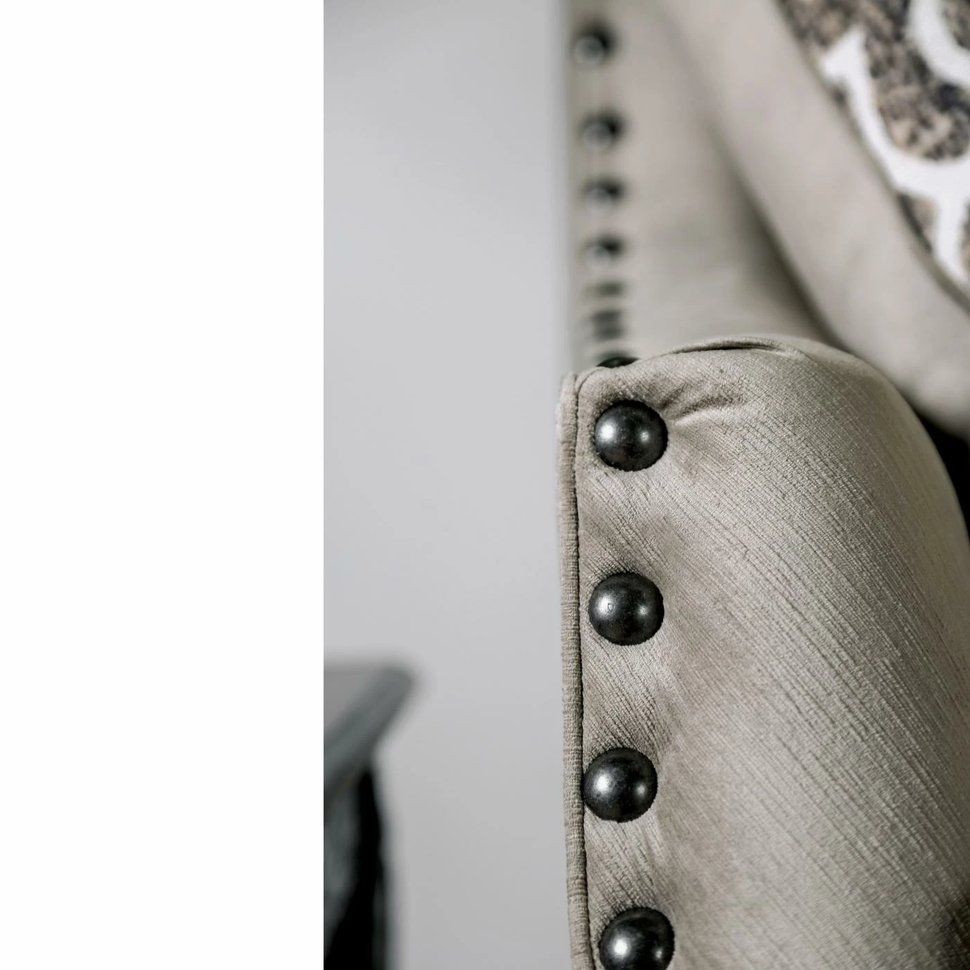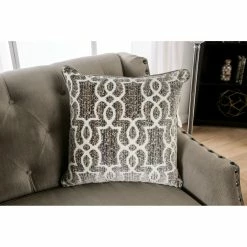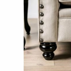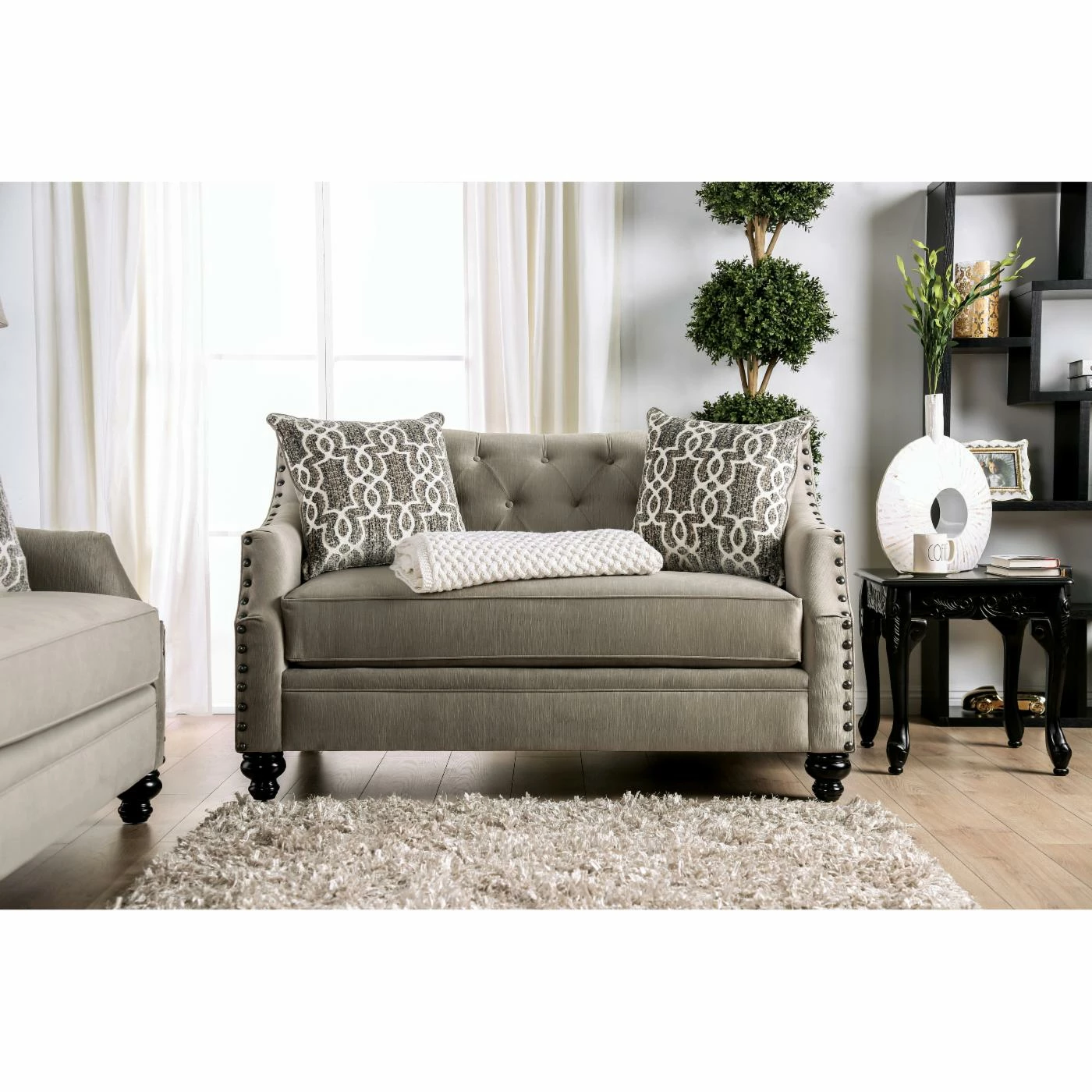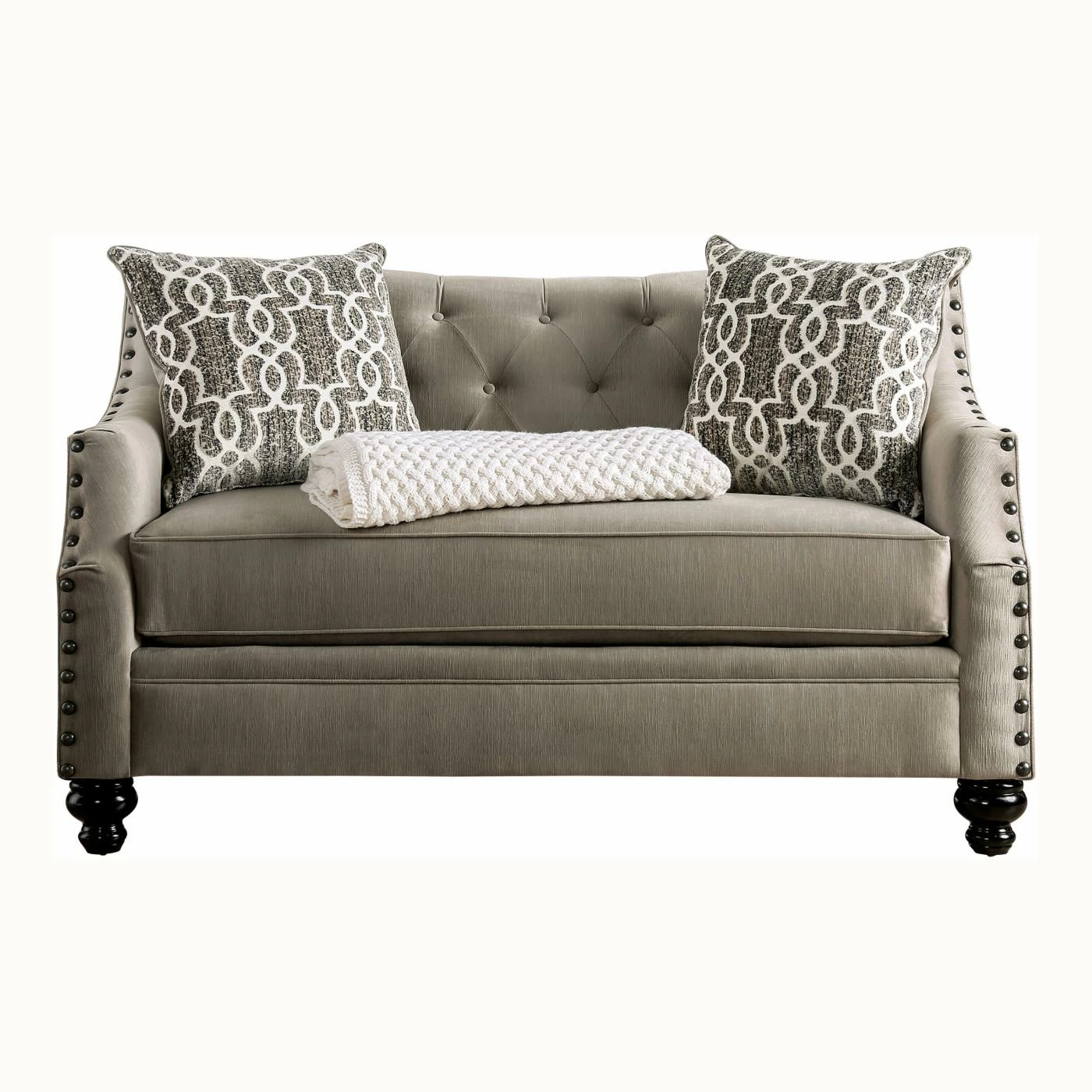Traditional style meets contemporary chic with the Furniture of America Markham Tufted Loveseat. This small weave beige chenille settee boasts bold nailhead trim across the scalloped arms and a richly upholstered button tufted back. A single cushion stretches across this loveseat for a streamlined look, and it comes with two accent pillows which feature an interlocking chain design. Stretch out, relax, and enjoy. Some assembly required.