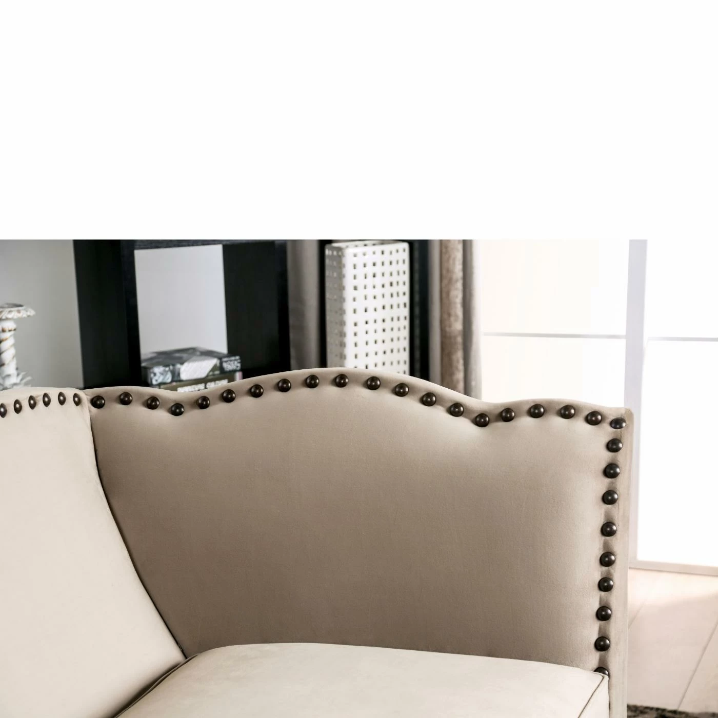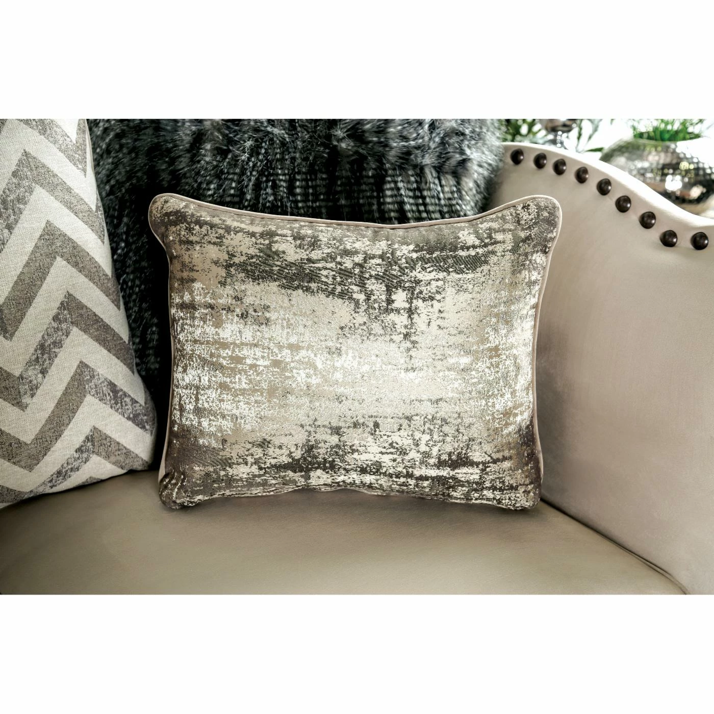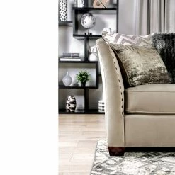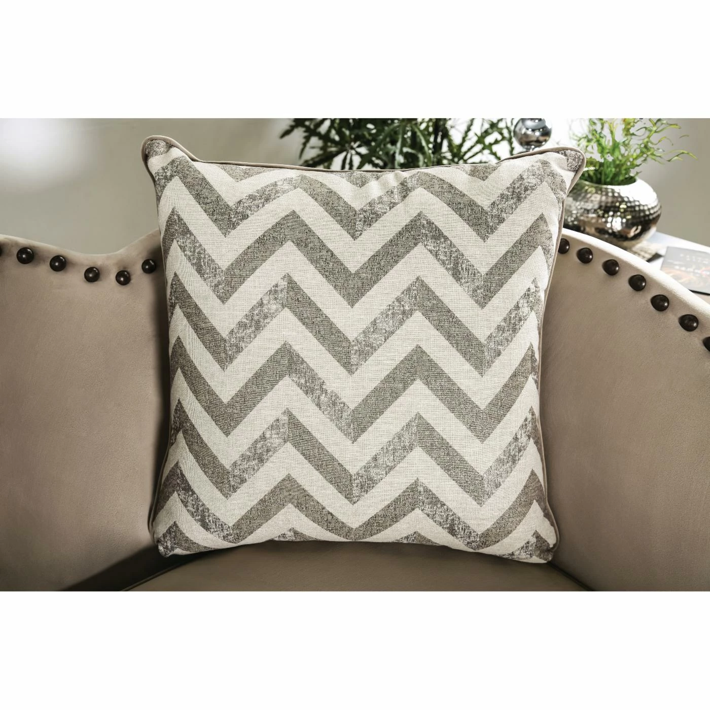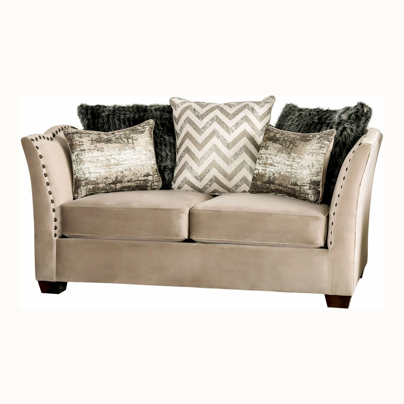 Now you don’t have to decide between boho, glam, or contemporary styles with the Furniture of America McCreery Nailhead Loveseat. This style chameleon features flared camelback armrests for a unique silhouette and is supported on wooden block feet. The soft faux suede fabric is a light neutral that coordinates perfectly with the included accent pillows for a more graphic look. The sophisticated nailhead trim around the arms? Just the icing on the cake. Proudly made in America.