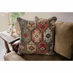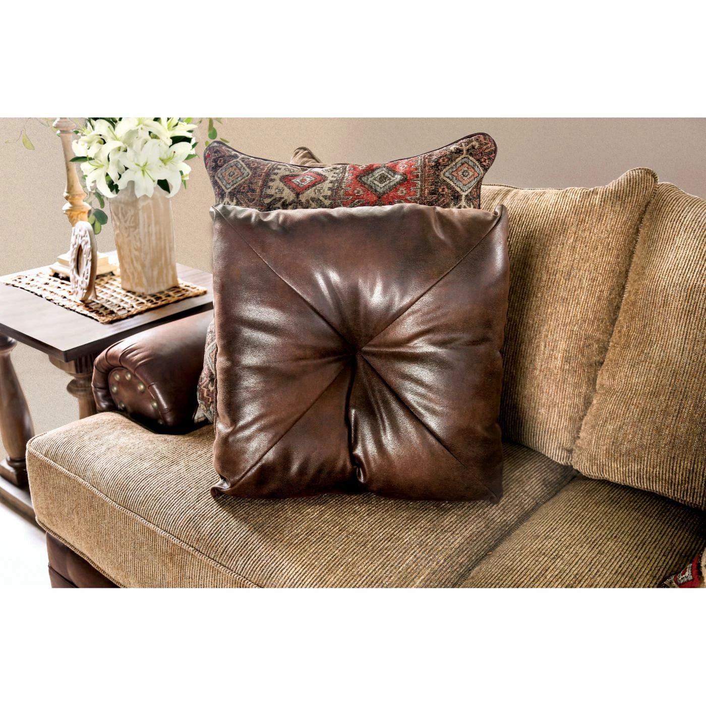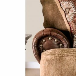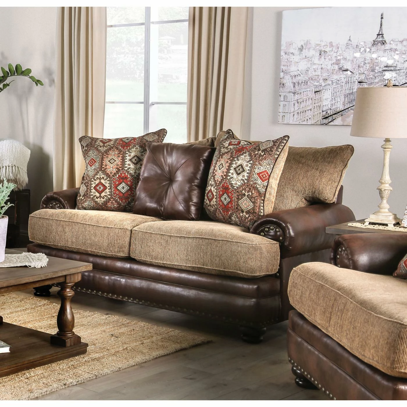 Offer your living room all the comfort and elegance of a European drawing room with the Furniture of America Morgan T-Cushion Loveseat. This loveseat features rolled armrests and bun feet in the traditional style. The frame is built from durable wood with a dark brown finish, padded with plush foam. Dark brown faux leather and beige chenille upholsters the piece, complemented with matching throw pillows (featuring an intricate geometric pattern on the reverse). Antique bronze nailheads trim the piece, emphasizing the timeless elements.