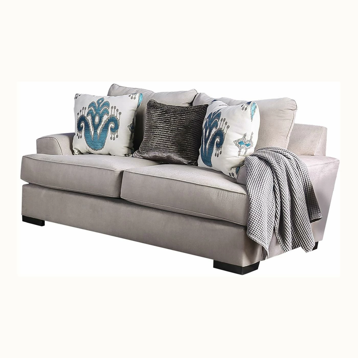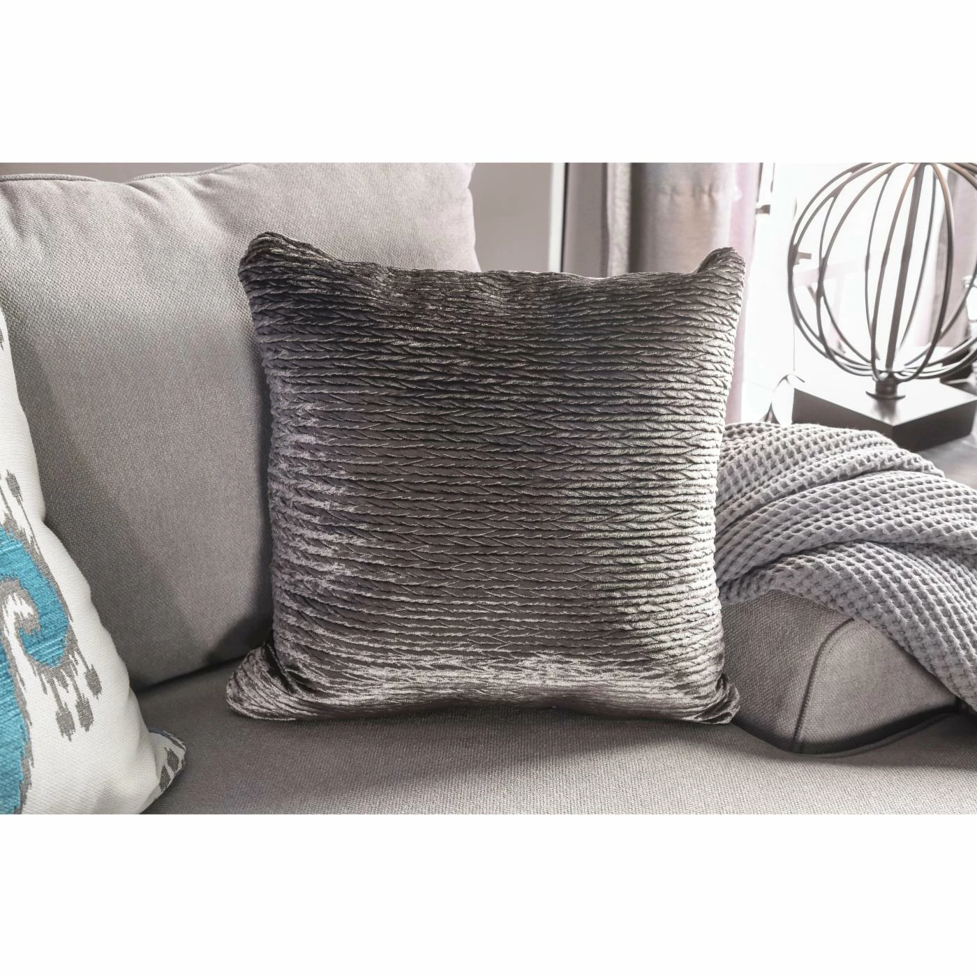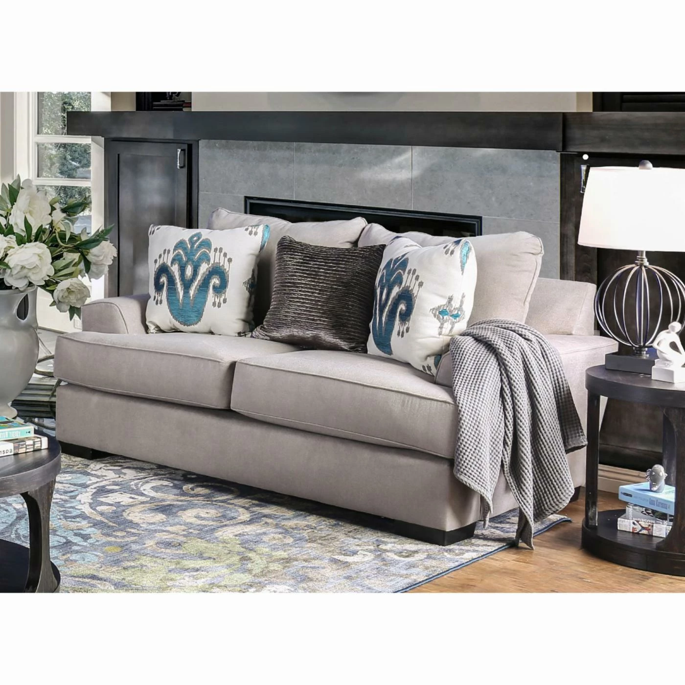 The understated, modern style of the Furniture of America Nicholas Contemporary Light Gray Chenille Loveseat is an ideal choice for both classic and contemporary spaces. A wide, straight-lined body with flat arms are key to the modern shape, yet the pillow-back cushions give it a casual feel. A frame of solid hardwood is wrapped in layers of high-density foam beneath a super-soft chenille fabric. A set of printed accent pillows give it a complete, thoughtful appearance. Assembly required.