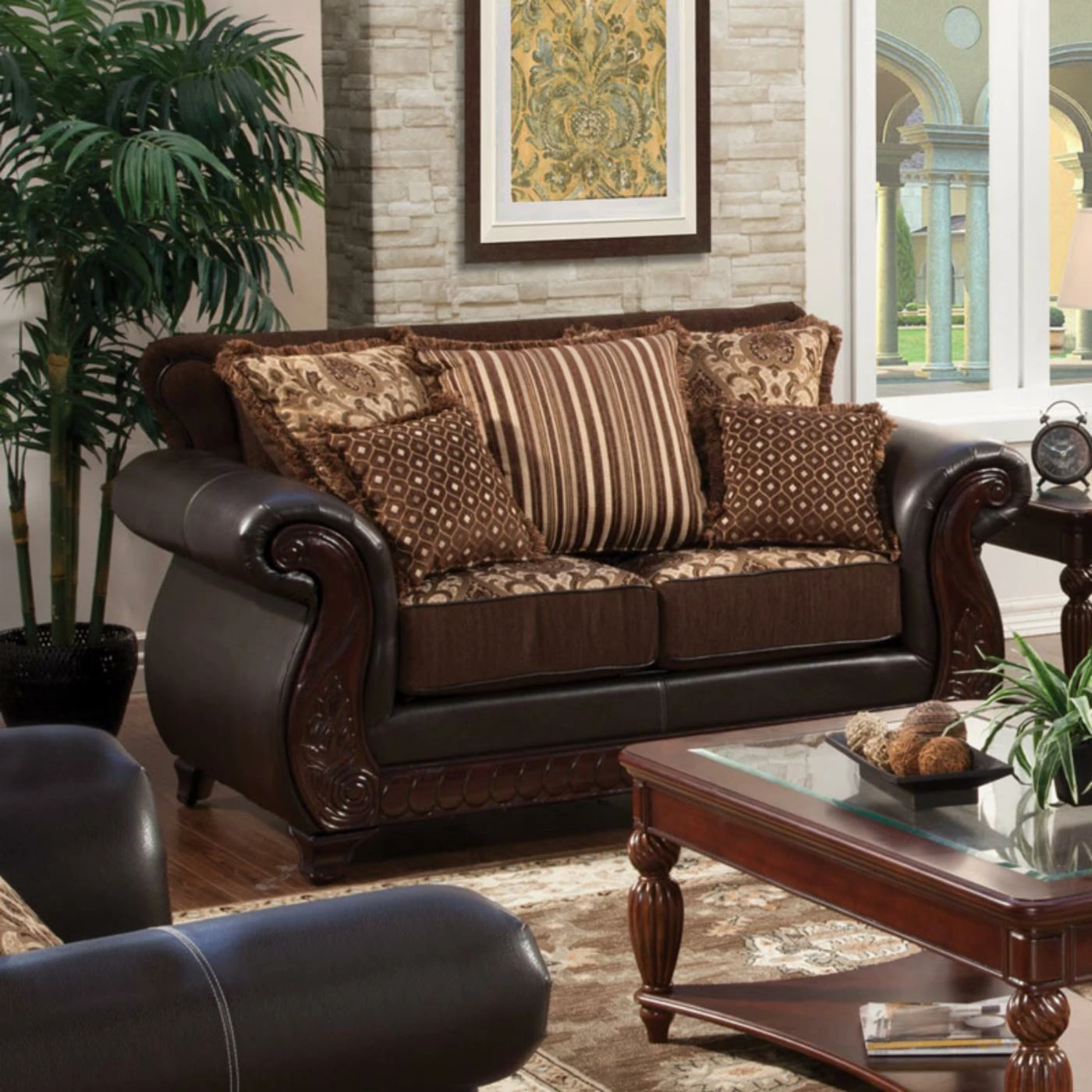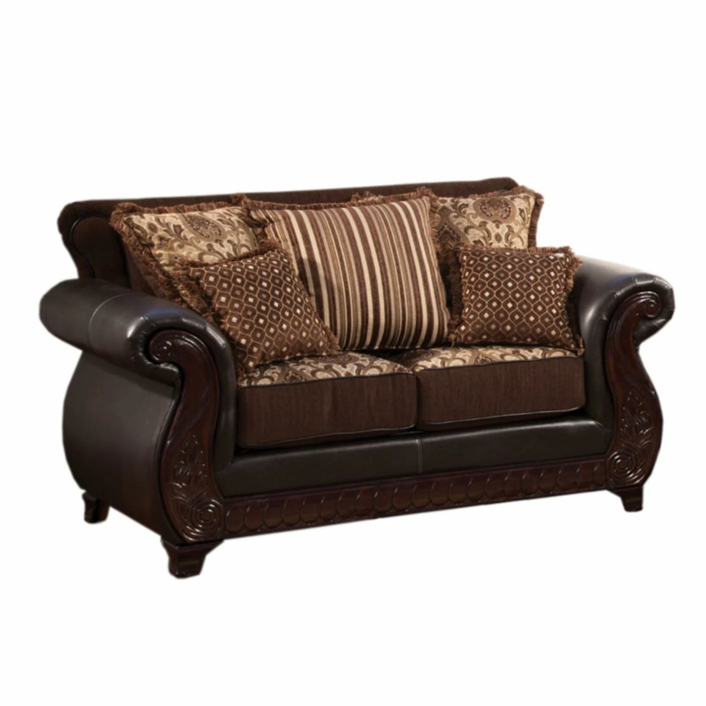 The beautiful traditional design of the Furniture of America Richborough Fabric and Leatherette Loveseat – Dark Brown adds a sophisticated touch to your dΓ©cor. Adorned with rolled arms and an intricate wood trim, this stunning loveseat is upholstered in smooth leatherette in a gorgeous dark brown finish. Its durable solid wood frame is built to last while each floral brown cushion is filled with resilient foam cores that provide uniform seating, lasting support, and comfort. Complementing toss pillows complete the look of this piece.
