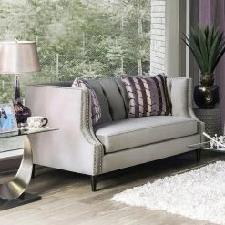 The tall, angular frame of the Furniture of America Selena Contemporary Gray Tuxedo Loveseat gives it a touch of chic elegance that’s going to enhance the vibe of any space. This contemporary sofa offers deep seating bordered by a tall back and arms. The soft upholstery has a button-tufted, panel-style back and settee-style seat cushions. The hardwood frame is wrapped in layers of high-density foam. Silvery nailhead trim wraps around the shape and adds a touch of texture and drama to the design. Tapered hardwood feet with a black finish raise this piece up from the floor. Assembly required.