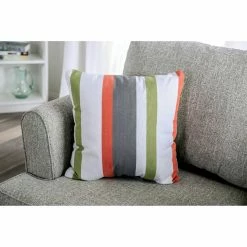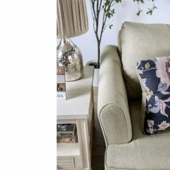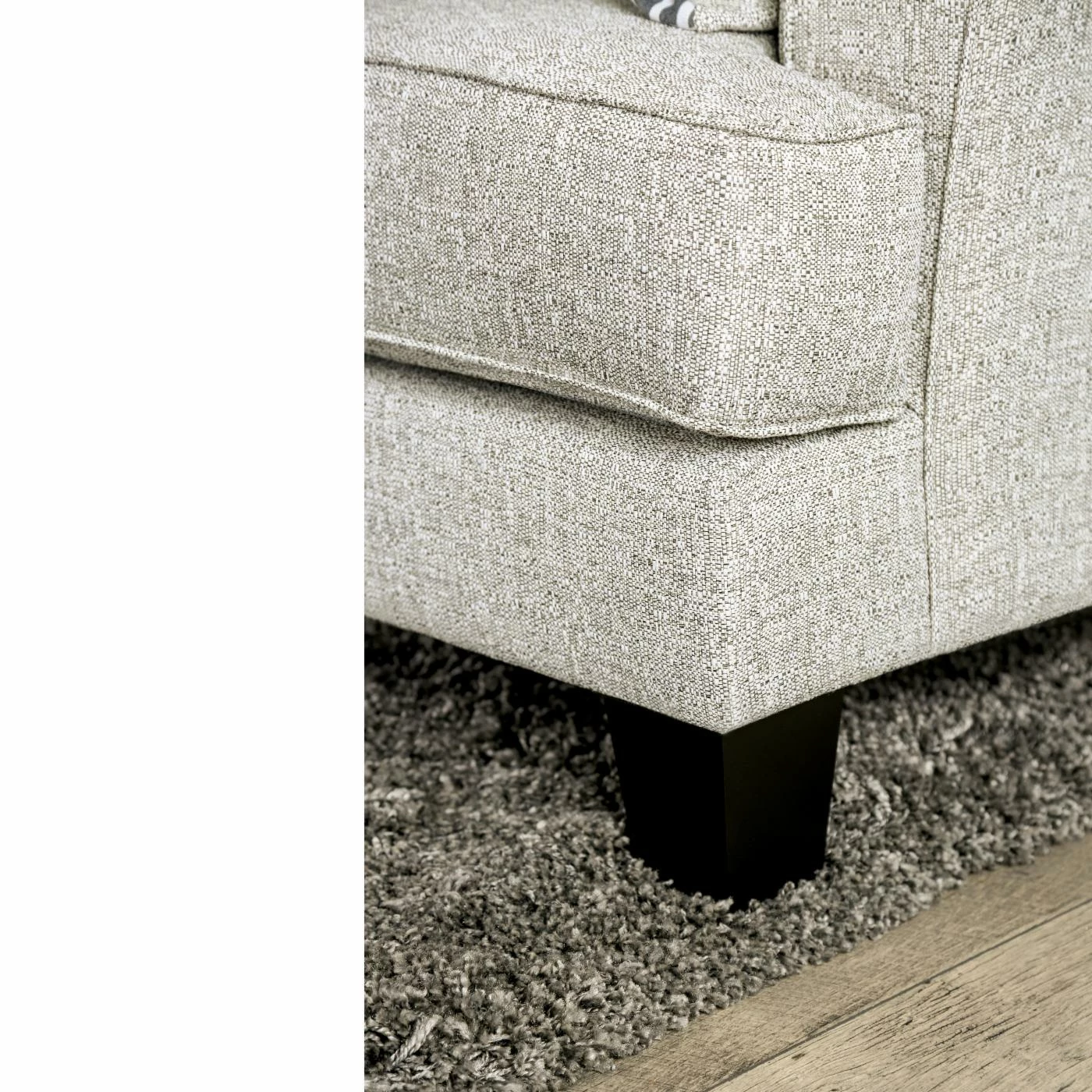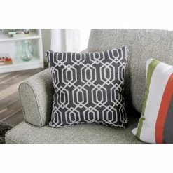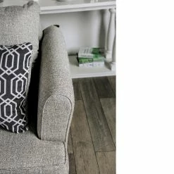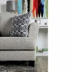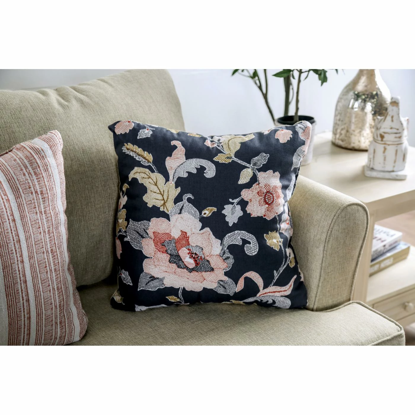 Make the Furniture of America Taylor T-Cushion Loveseat your favorite reading spot with its padded seat and back cushions and three included accent pillows. The burlap weave fabric upholstery covering the solid wood frame comes in your choice of available color, so you may customize this loveseat to your home. The block feet feature a black finish for sleek finishing touch.