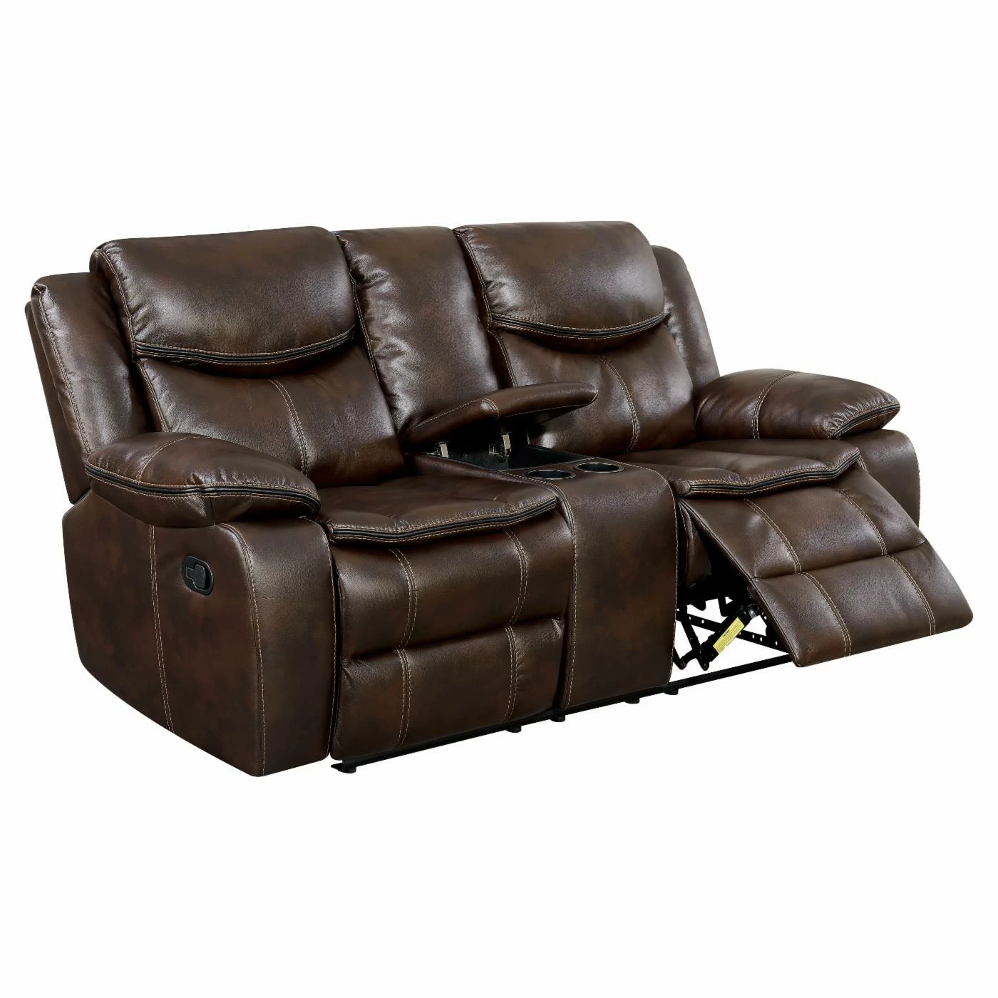 It doesn’t matter if you have a 20-foot projection screen or if you’re just watching Netflix on your phone, because the Furniture of America Westfield Breathable Leatherette Loveseat Recliner with Console can make any room into a home theater. This deeply indulgent loveseat gives you two chairs, each with it’s own independent reclining mechanism. In the center you have a built-in console with covered storage and a pair of integrated cup-holders. The strength of this piece starts with a frame of solid hardwood that’s wrapped in layers of high-density foam. Over that supportive foam is an exterior of breathable, supple leatherette in a classic shade of brown. Pillow-top arms and a padded headrest support you while you relax, and when you recline you get that same padding from your feet all the way up. A bit of contrast double-stitching adds a high-end finish to the design.