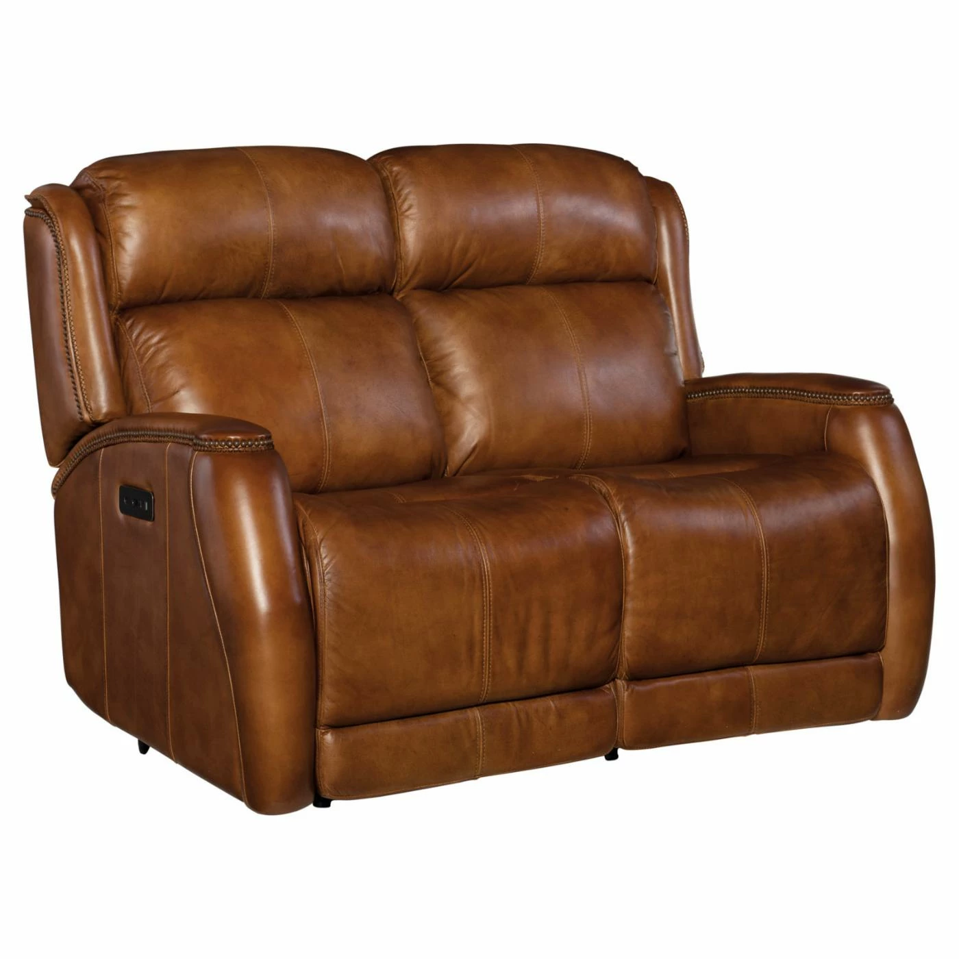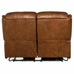 Cuddle up with a loved one on the Hooker Furniture Emerson Upholstered Power Recliner Loveseat with Power Headrest and Nailhead Trim. This comfortable loveseat is full of plush foam and is upholstered in rich brown leather. The stylish nailhead trim around the front and arms adds some sophisticated detail to this piece, and the center stitching down each cushion neatly streamlines the leather. Several horizontal buttons work the electric reclining mechanism, so you can easily sink into comfort no matter which side you’re sitting on. No assembly required.