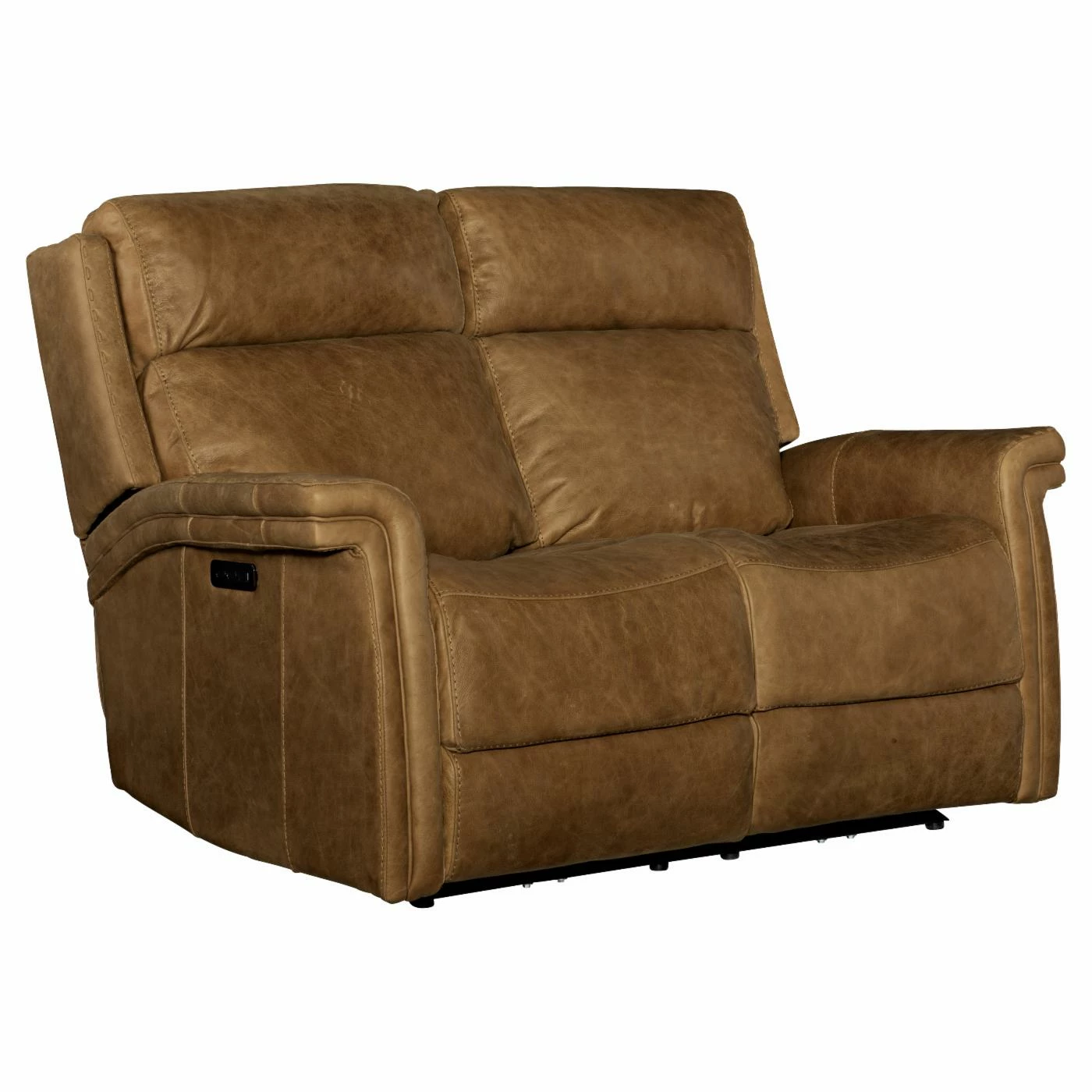 Give your living room or family room an upgrade – the Hooker Furniture Poise Power Recliner Loveseat with Power Headrest. This reclining loveseat comes in a warm coffee colored leather over a frame made from kiln-dried wood and metal. The square English rolled arms give this loveseat a streamlined, elegant look that’s matched by the quality of the leather and the silhouette of the cushions. The power recline function is just a cherry on top; now, you can relax in top-tier comfort. Some assembly required.