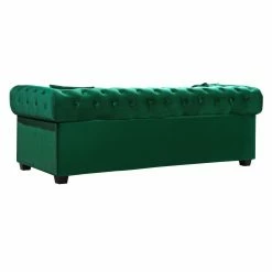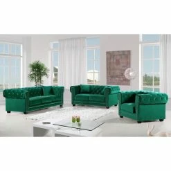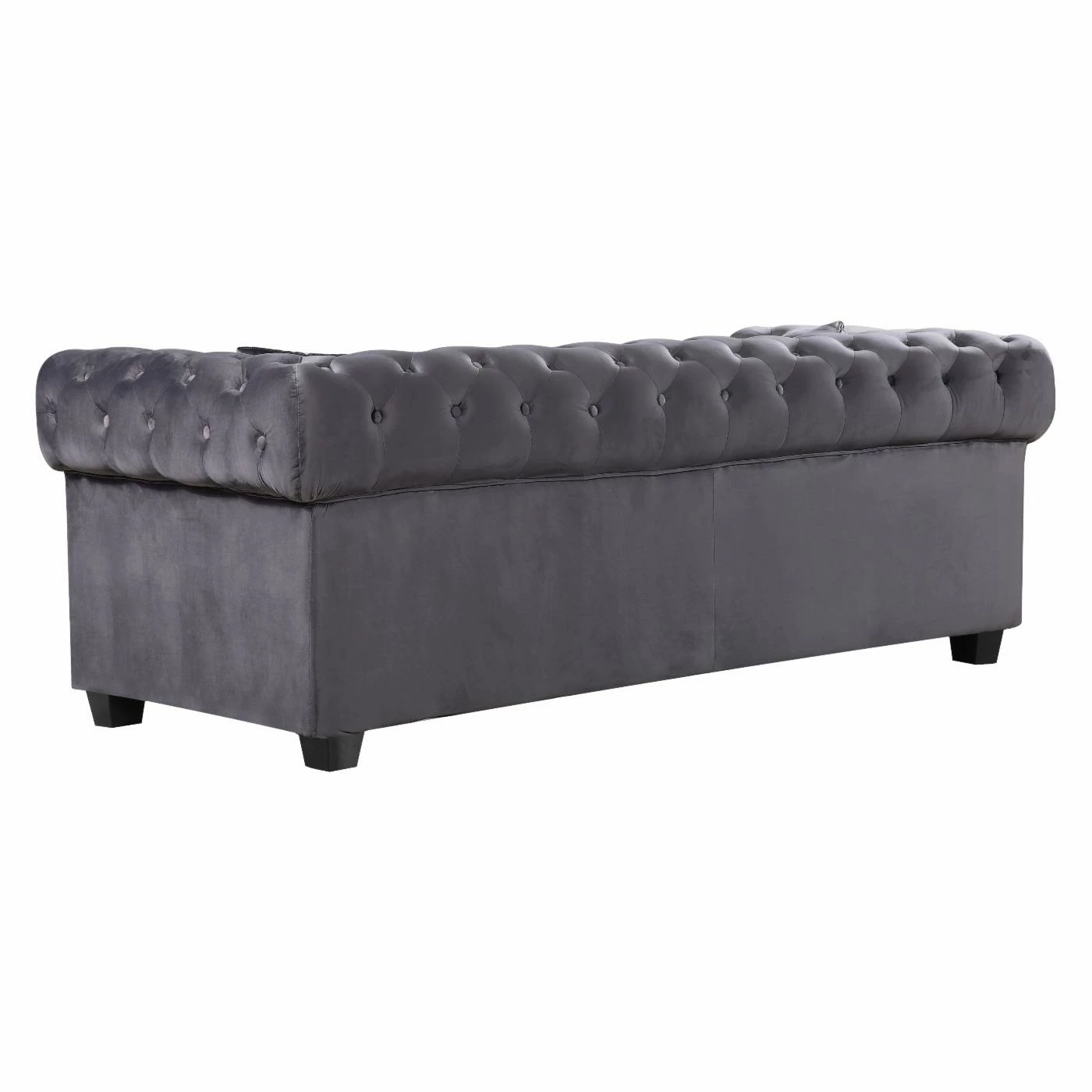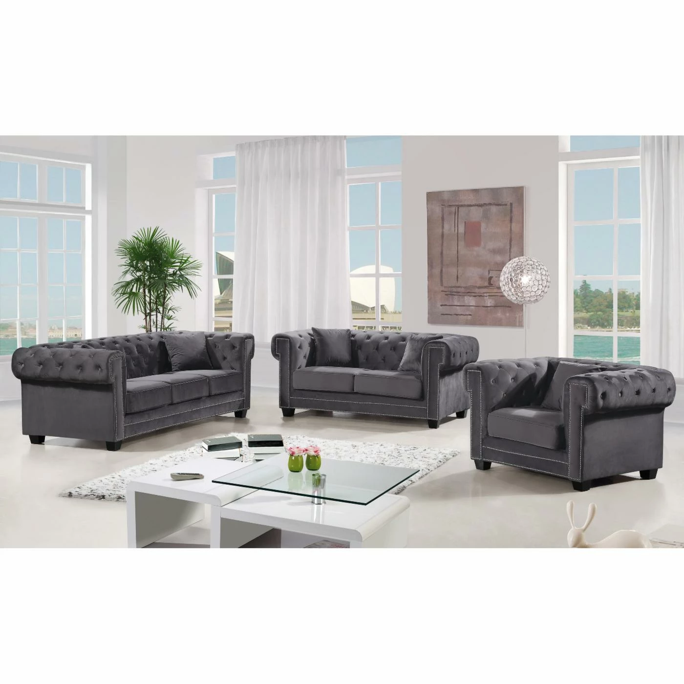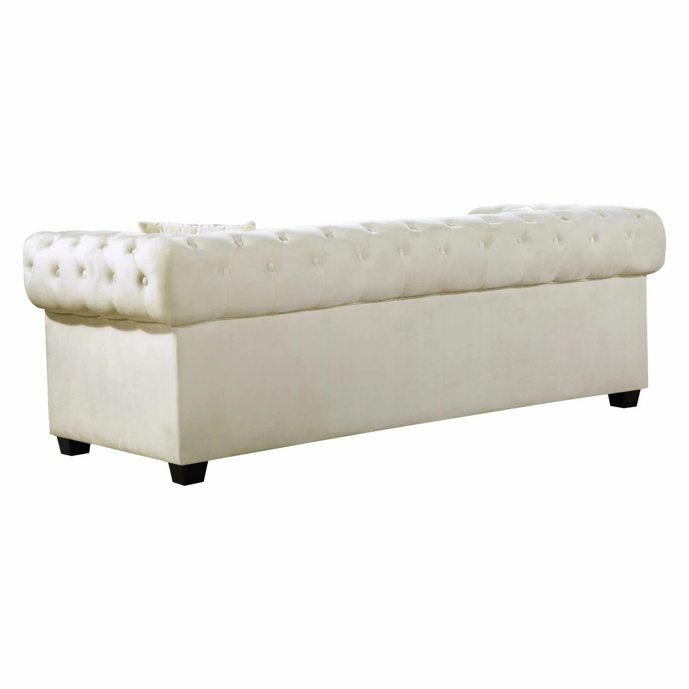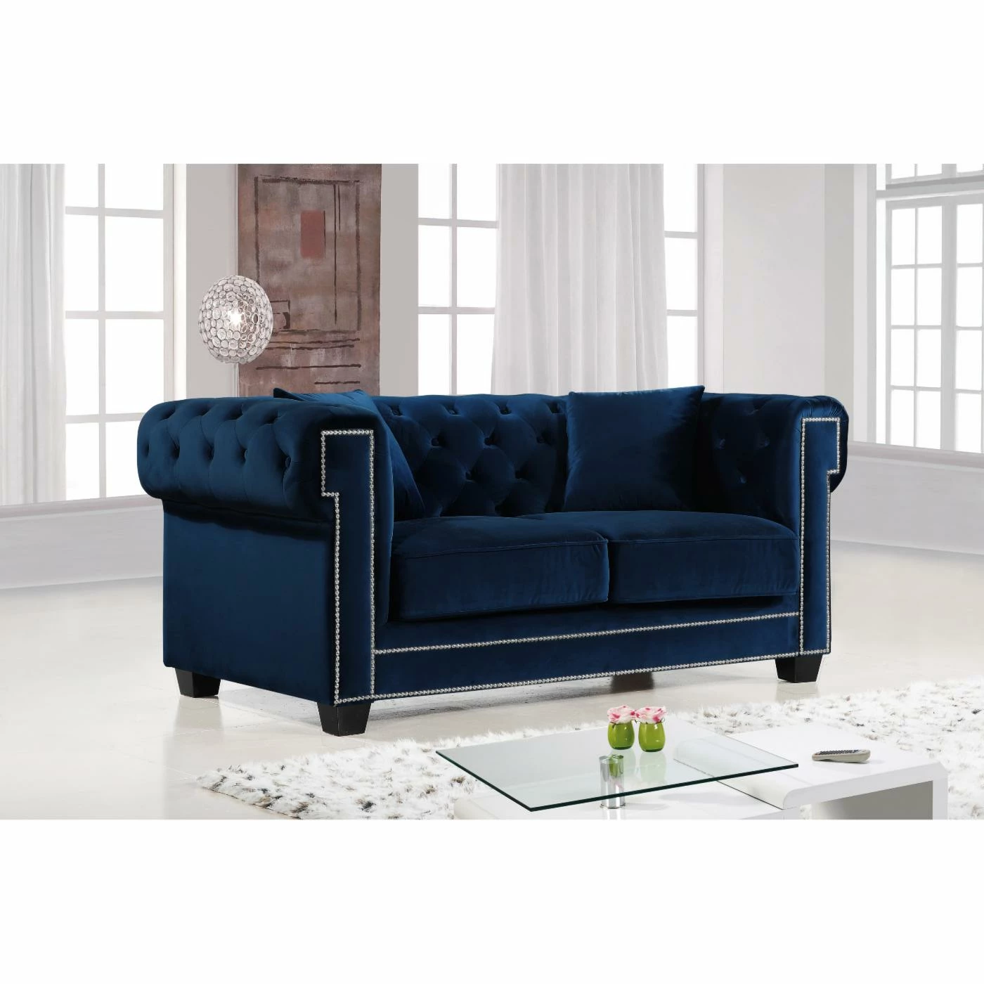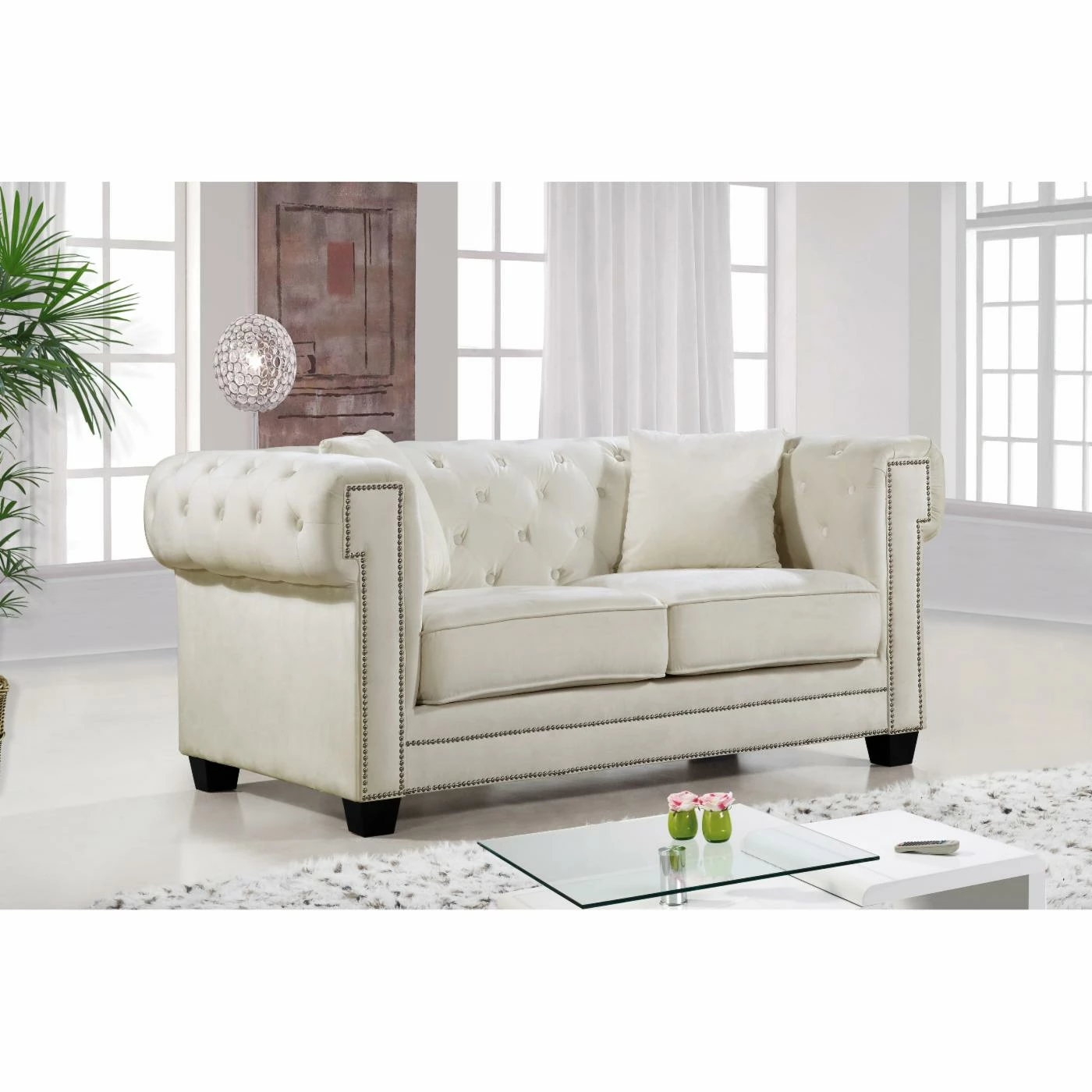 The Meridian Furniture Inc Bowery Velvet Loveseat adds classic style elements to its modern design. With button tufting, rolled arms, and chrome nailhead trim, this loveseat is an elegant addition to any living room. Custom wood legs accent the soft beauty of the velvet upholstery, which comes in your choice of available colors. The robust metal frame is strong and durable, making this loveseat ideal for everyday living. The included throw pillows perfectly match whichever color you choose. This item matches other pieces in the Meridian Furniture Inc Bowery Collection.