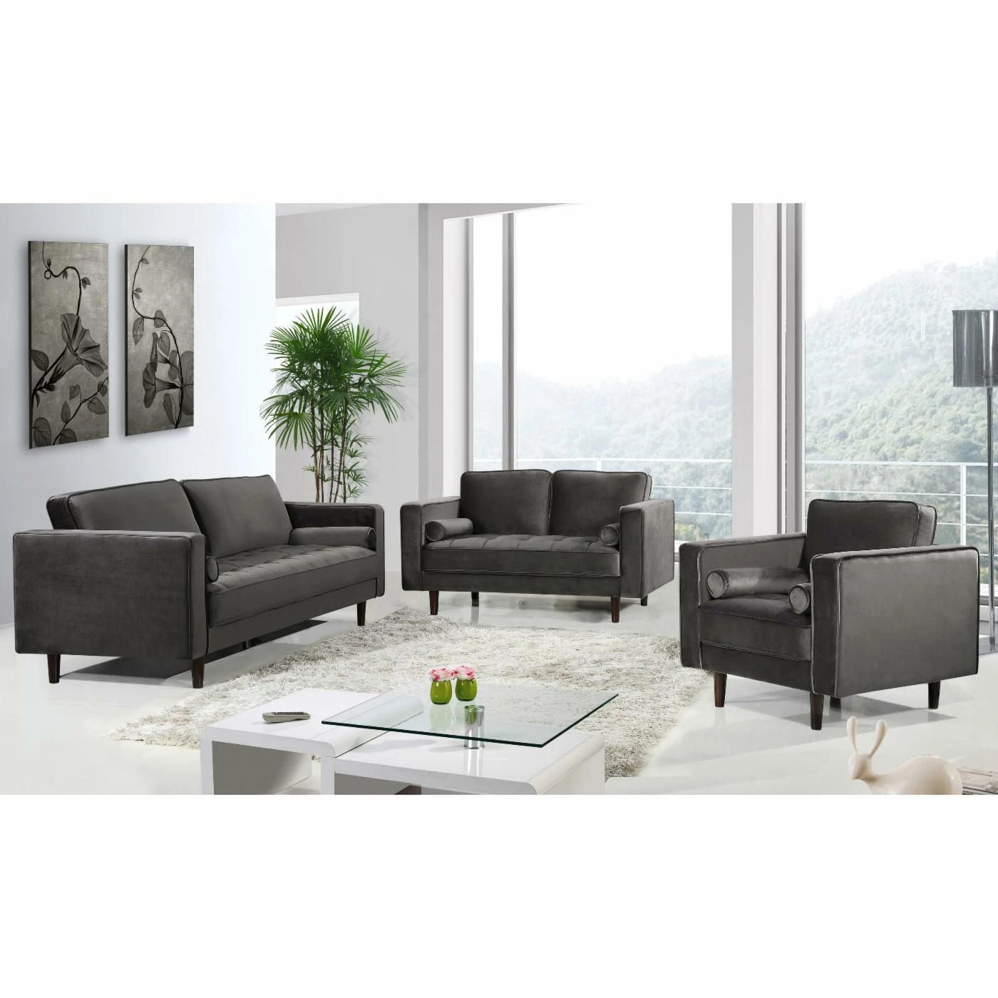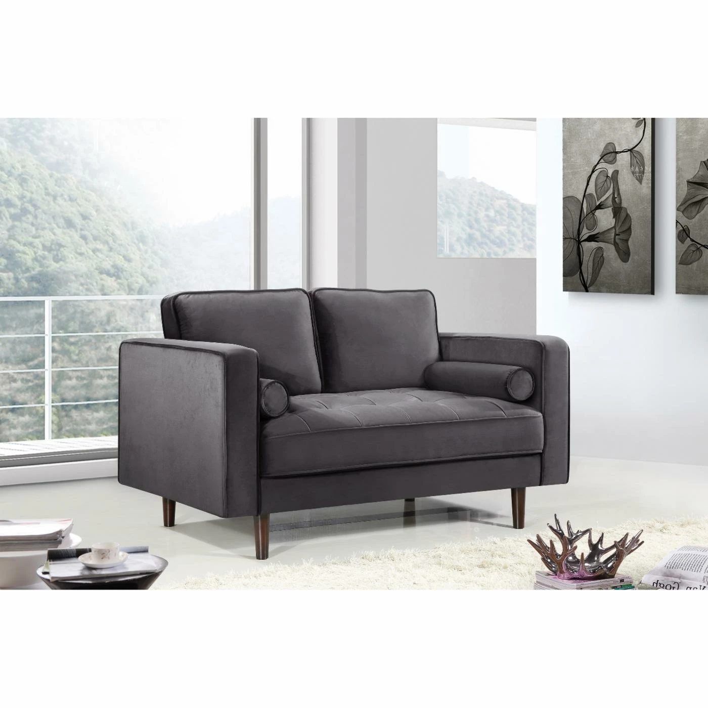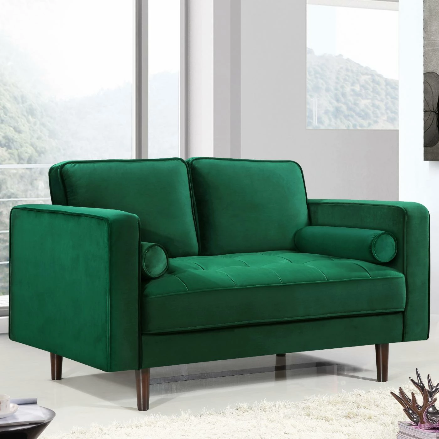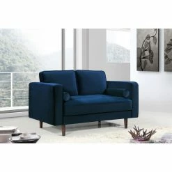 Cozy and inviting, the Meridian Furniture Inc Emily Velvet Loveseat shows just how comfortable modern style can be. Plush cushions upholstered in velvet and two roll pillows create the ideal seat for relaxing after a long day. Deep button tufting and thin wooden legs add a mid-century flair to this contemporary piece. With your choice of available fabric colors, youโll have the perfect loveseat picked out in no time. This item matches other pieces in the Meridian Furniture Inc Emily Collection.
