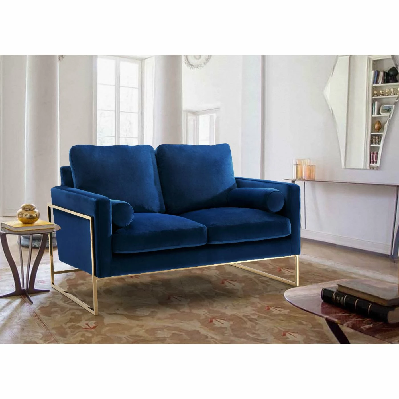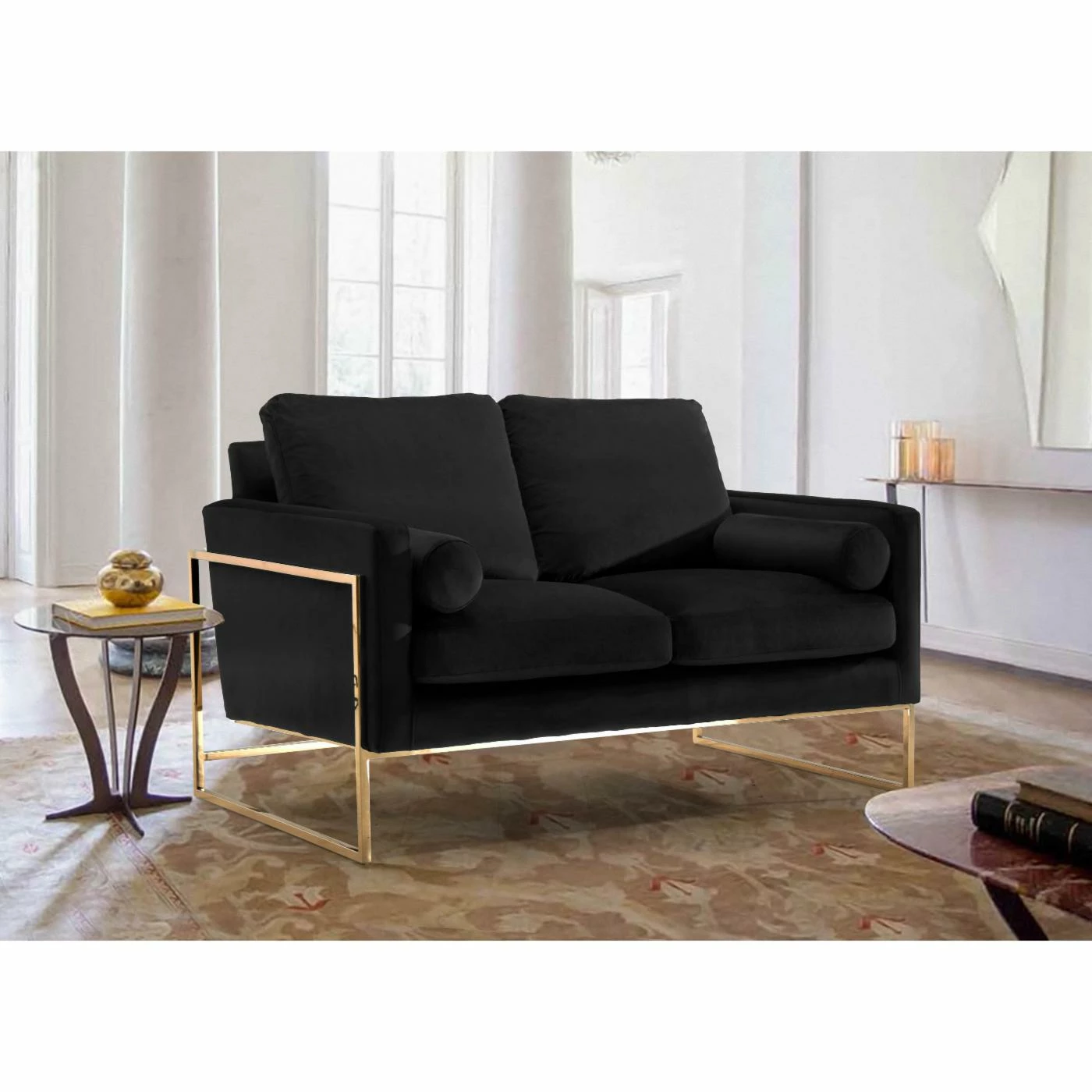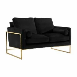 Like you, the Meridian Furniture Inc Mila Upholstered Loveseat was inspired by mid-mod furniture. Its look includes an open sled style stainless steel frame in rich polished gold finish. You’ll love the soft velvet upholstery, which comes in a choice of available colors. Plush cushions and rolled accent pillows add glam finishing touches to this loveseat.