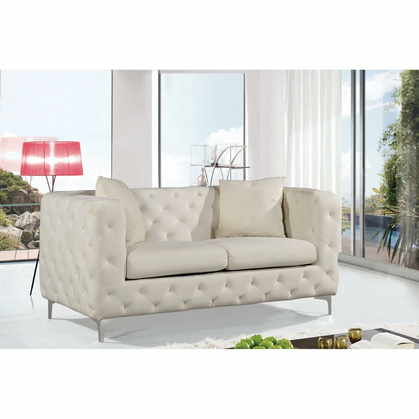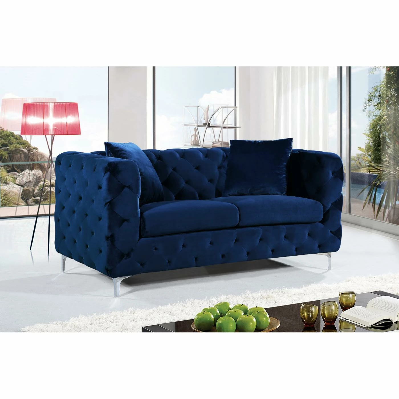 Add comfortable seating space and modern design to your home with the Meridian Furniture Inc Scarlett Velvet Loveseat. Great for relaxing, this loveseat features plush cushions upholstered in soft velvet to give you a seat youβll never want to leave. Chrome legs and button tufting add a retro flair youβll love. The durable metal frame is crafted to last, while the upholstery comes in your choice of available colors to complement any home in a winning fashion. This item matches other pieces in the Meridian Furniture Inc Scarlett Collection.