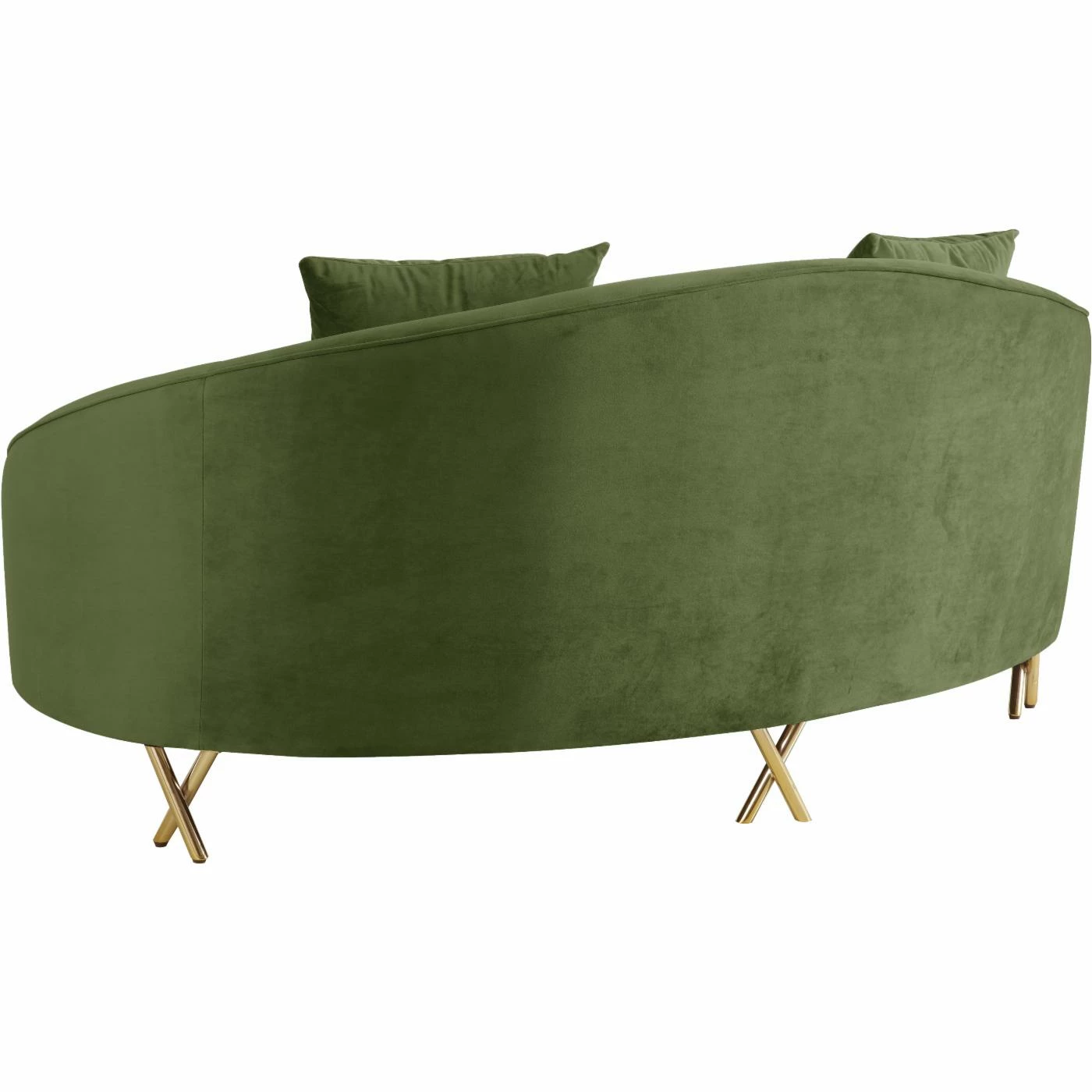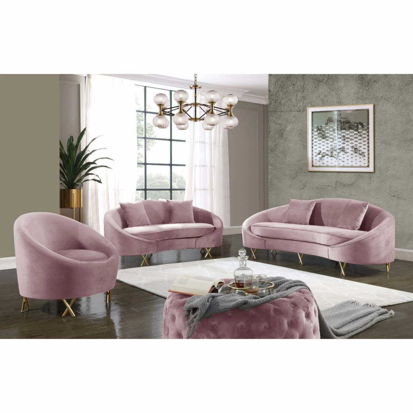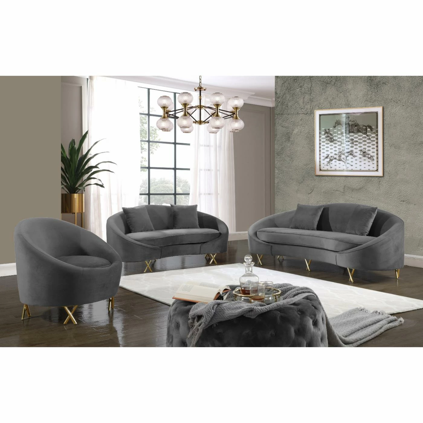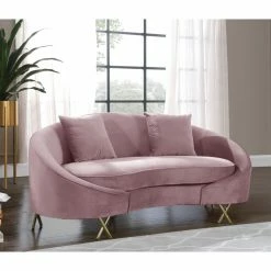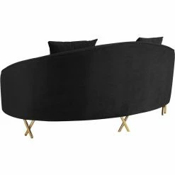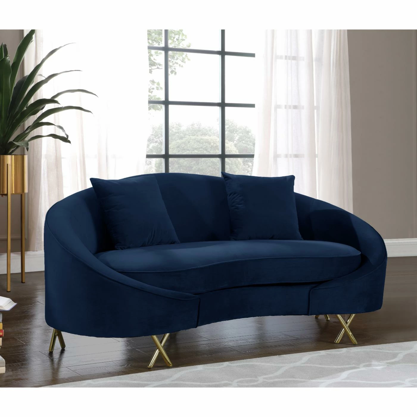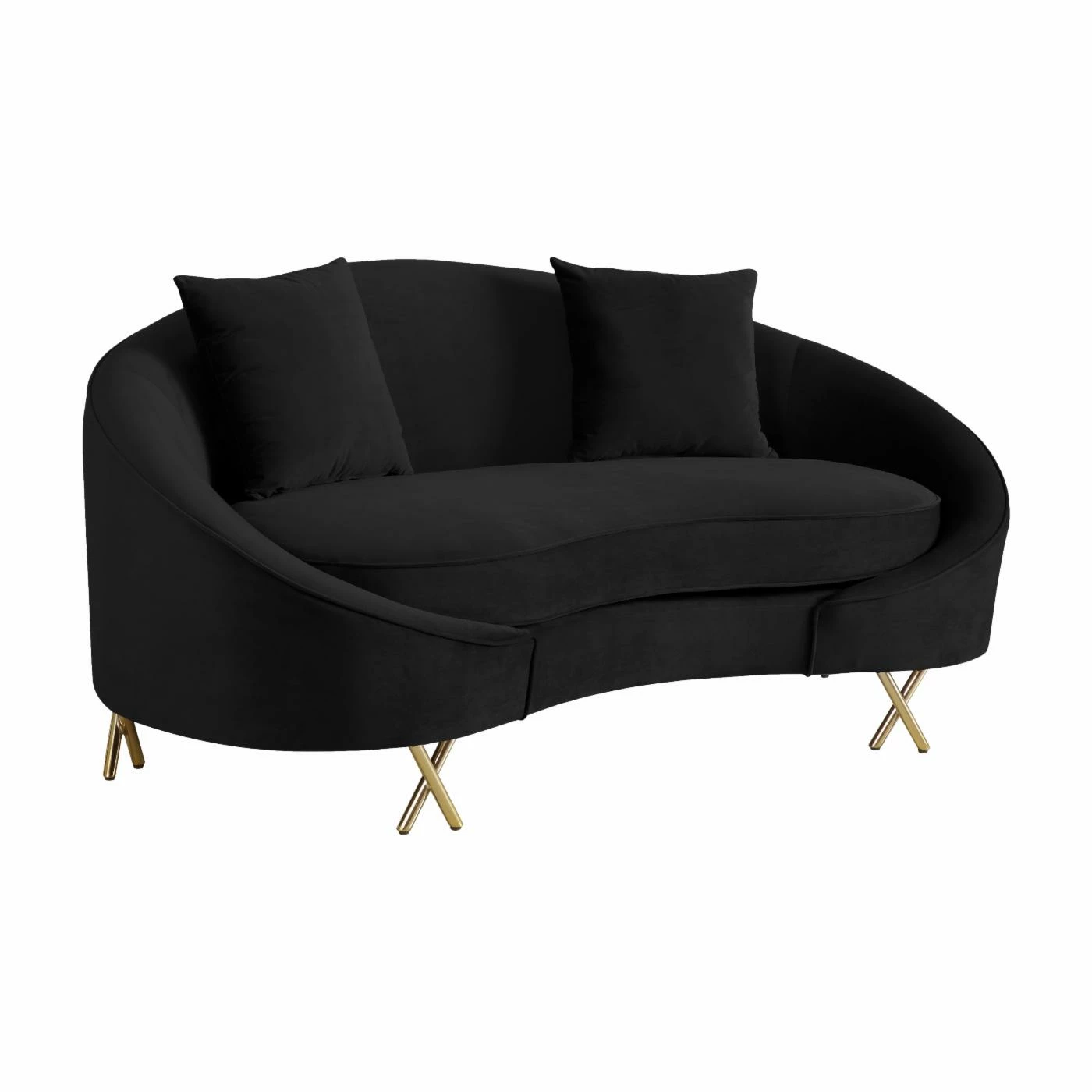 The modern and elegant Meridian Furniture Inc Serpentine Upholstered Loveseat features a curvaceous backrest with swoop arms. Rich velvet upholstery and crossed steel legs in gleaming gold add a Hollywood Regency vibe. Customize the luxury of this loveseat by choosing from available velvet colors. Matching velvet accent pillows add that perfect finishing touch.
