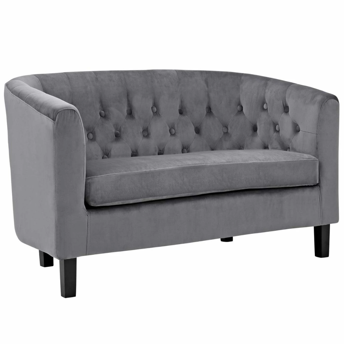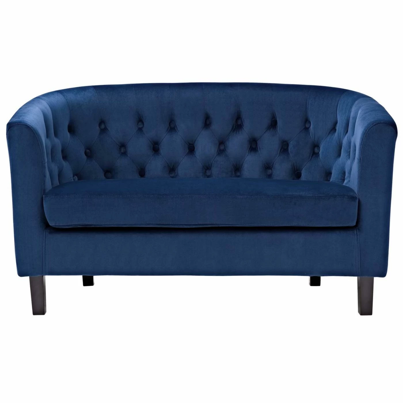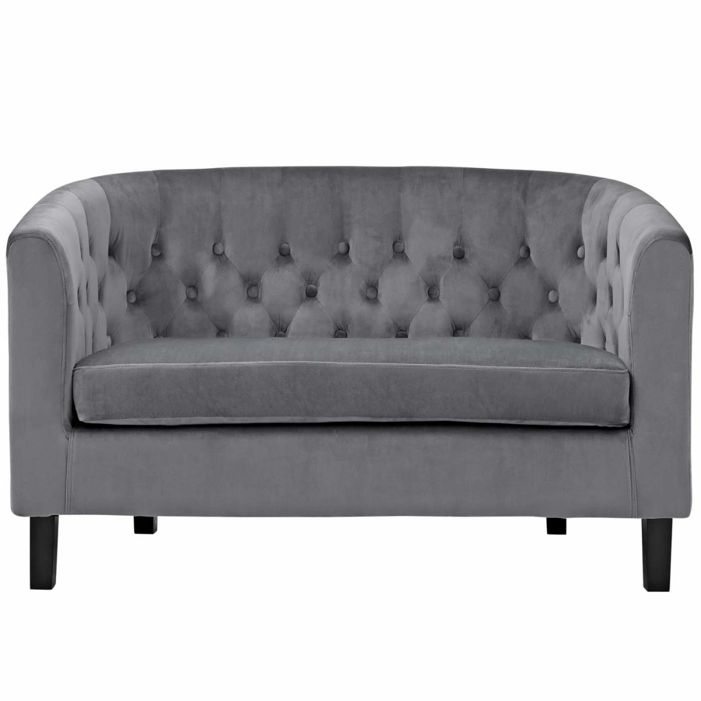 Update your seating arrangement with the elegant Modway Prospect Velvet Loveseat. With its curved back and plush foam padding, this compact loveseat offers formal style and comfortable seating for your guests. This handsome piece is upholstered in soft velvet polyester fabric with three rows of tufted buttons. Plastic foot glides on the espresso-stained wood legs make it easy to move this loveseat around without marking your floors or snagging the carpet.