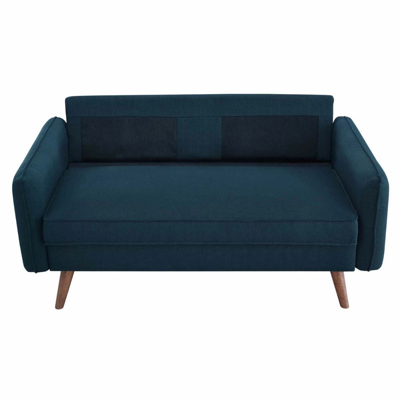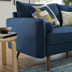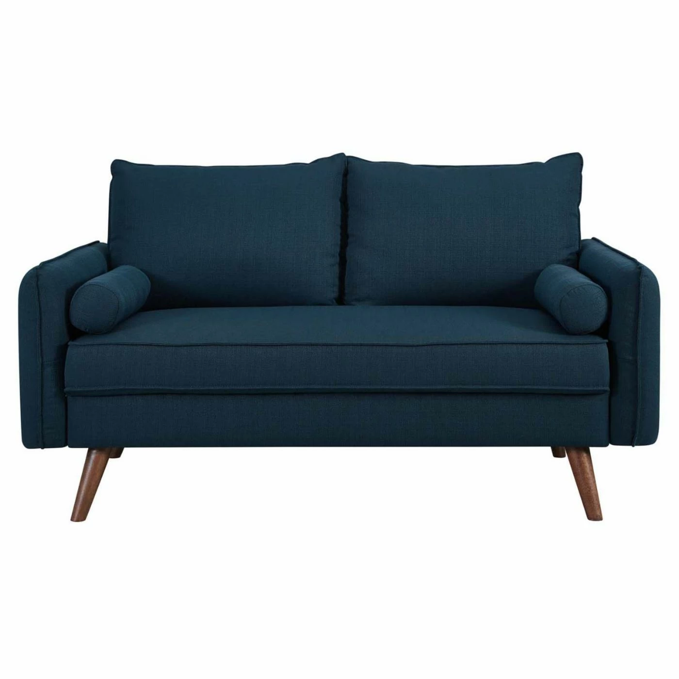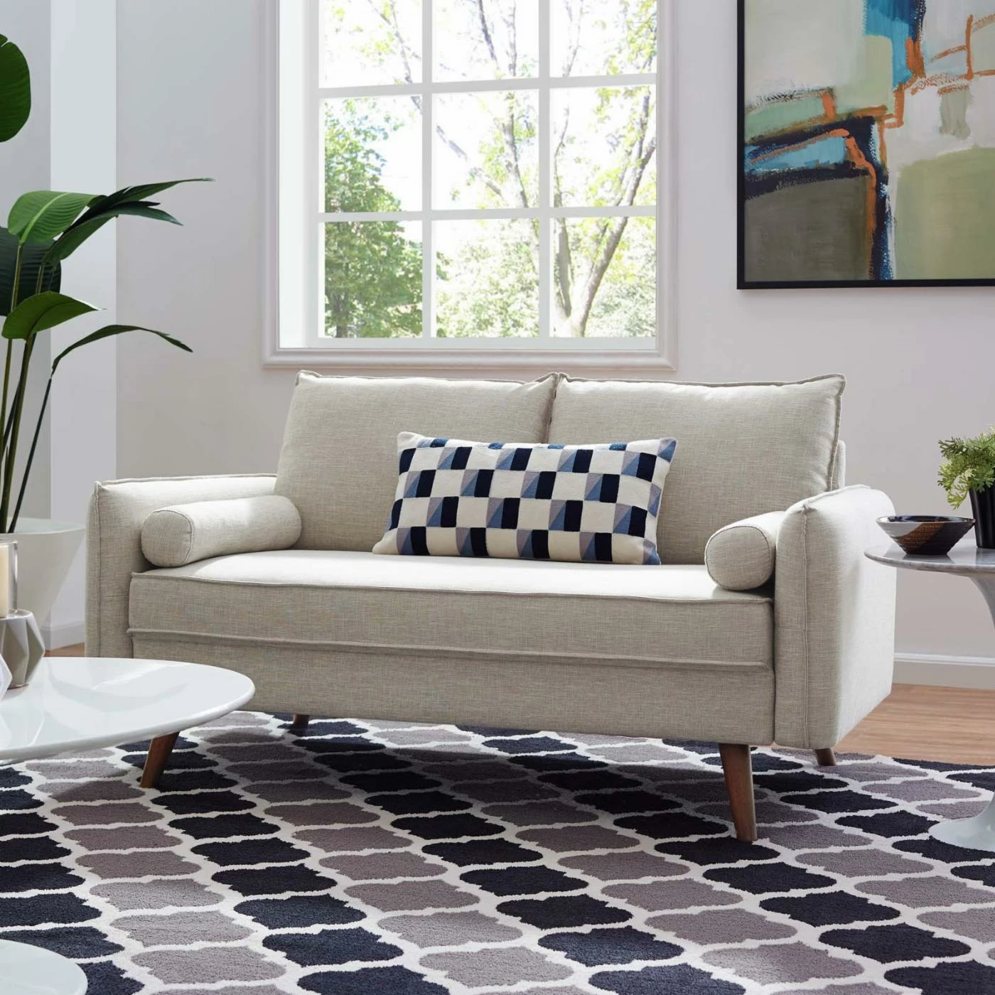 Enjoy modern style in any room with the Modway Revive Upholstered Fabric Loveseat, crafted in a tailored profile complete with two bolster pillows. This contemporary loveseat features fabric upholstery with your choice of available color, while seamed stitching gives it a touch of sophisticated style. Resting on splayed wood legs, this loveseat is sure to lend your home an updated look.