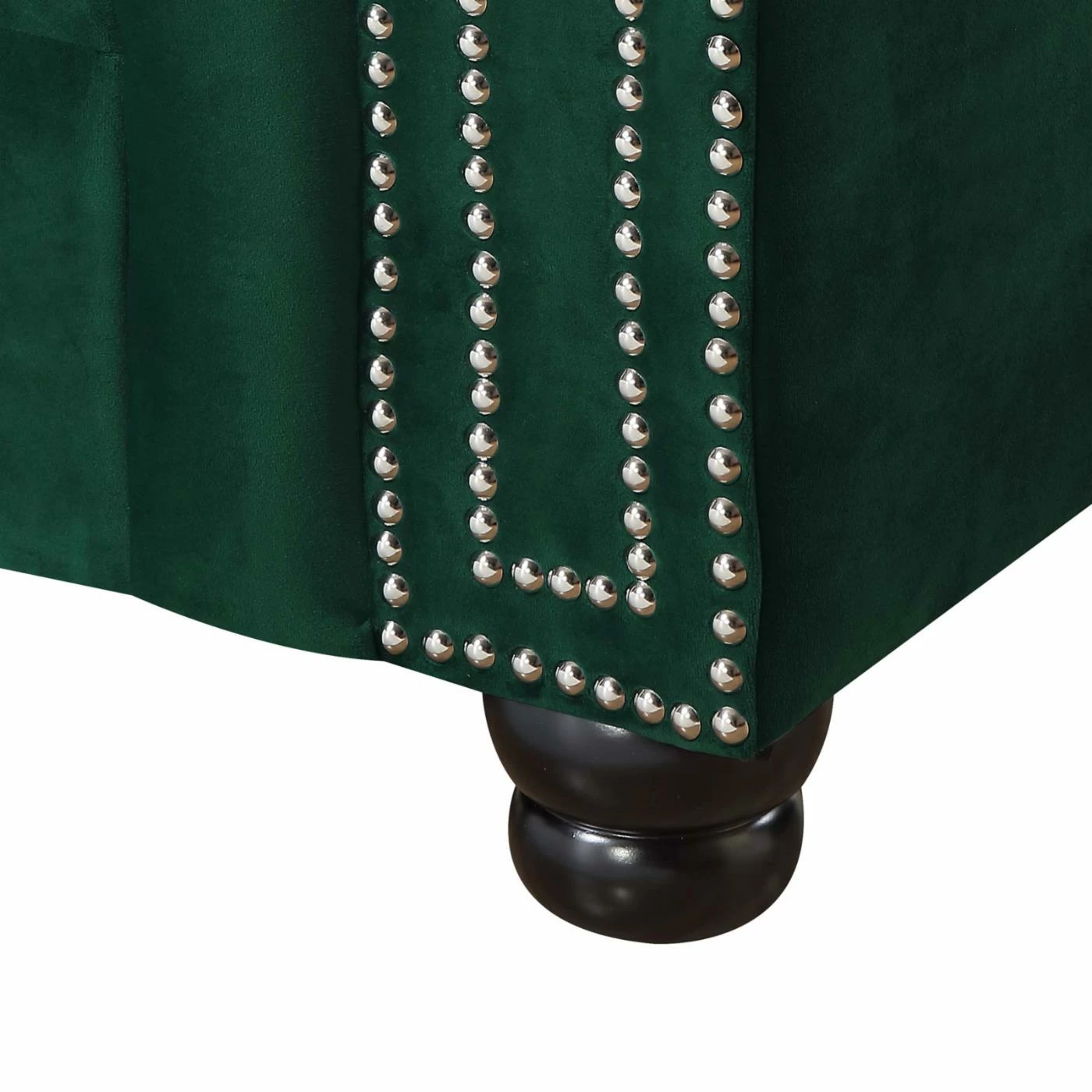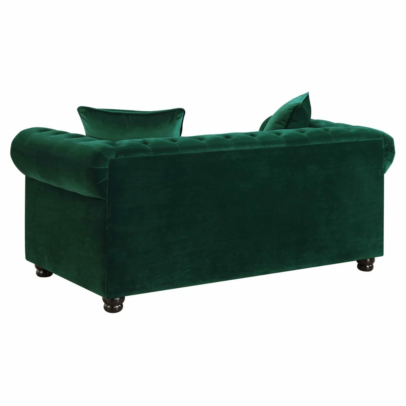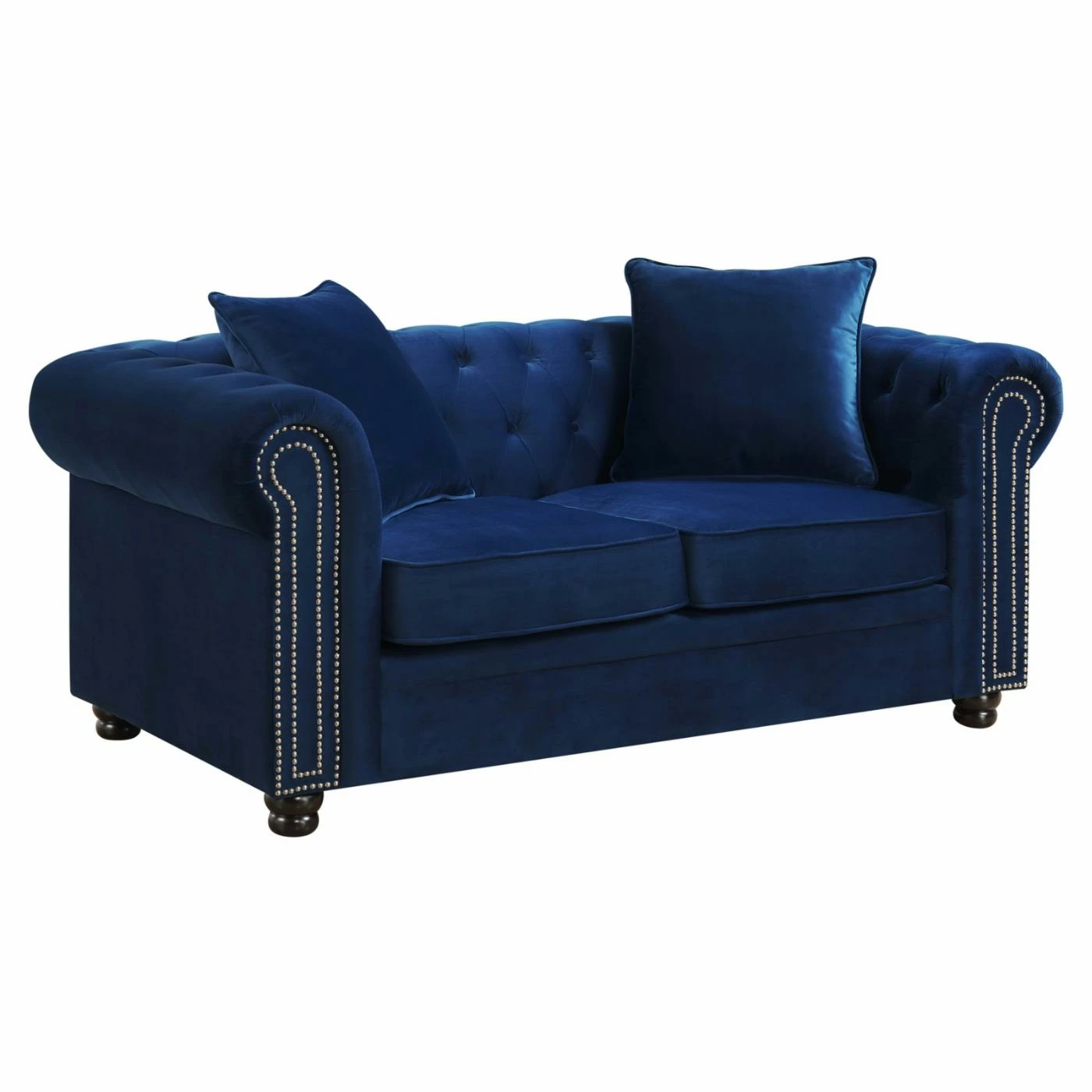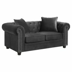 Sink into comfort with the Picket House Furnishings Gramercy Loveseat. The classic diamond tufting on the back of this piece adds an air of sophistication and elegance. The two coordinating pillows bring the look together. The classic nailhead trim on the front of this loveseat nicely complements the round turned feet. Choose from available colors. Some assembly is required.