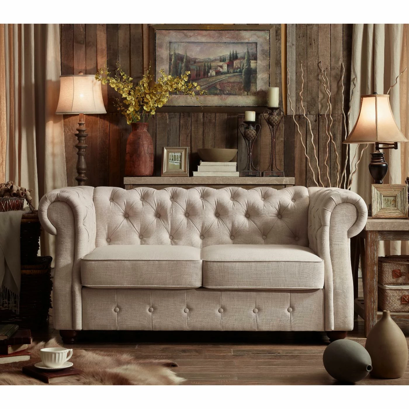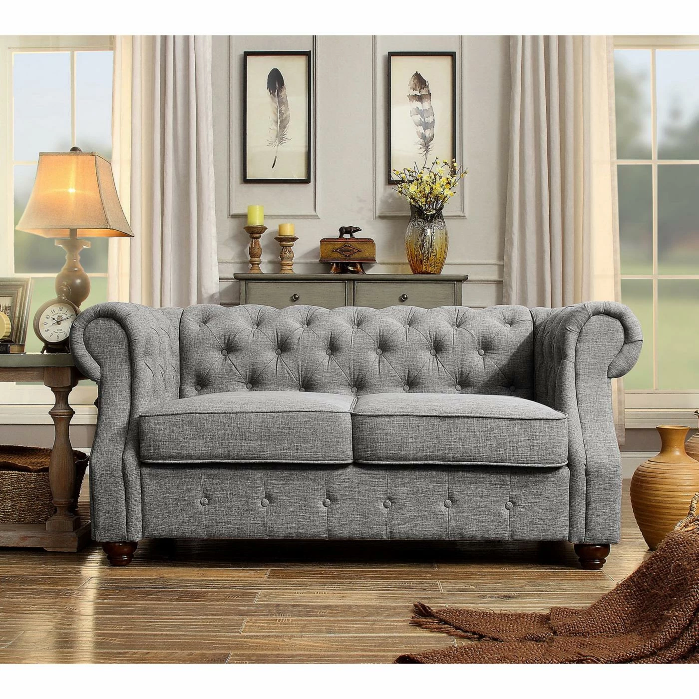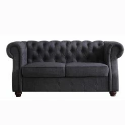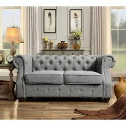 The Rosevera Evart Tufted Chesterfield Loveseat will add polish and comfort to your living space. This loveseat features elegant linen fabric complemented by your choice of available colors. Its button tufting and bun feet enhance its sophisticated style. Generous cushioning means reliable support, making this loveseat a perfect marriage of form and function.