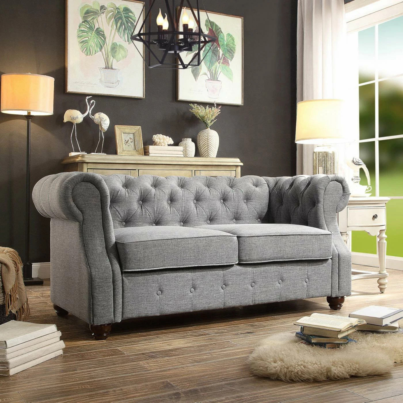 - Features button-tufted accents and bun feet
