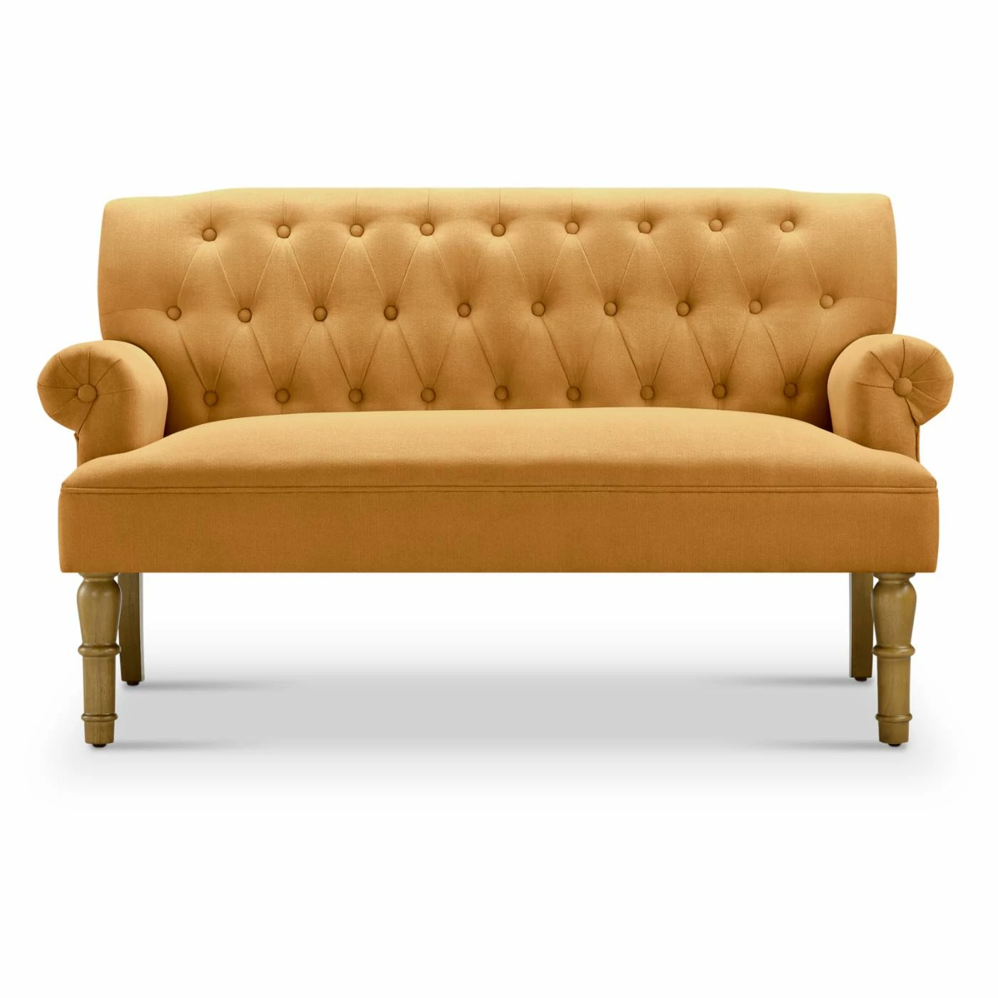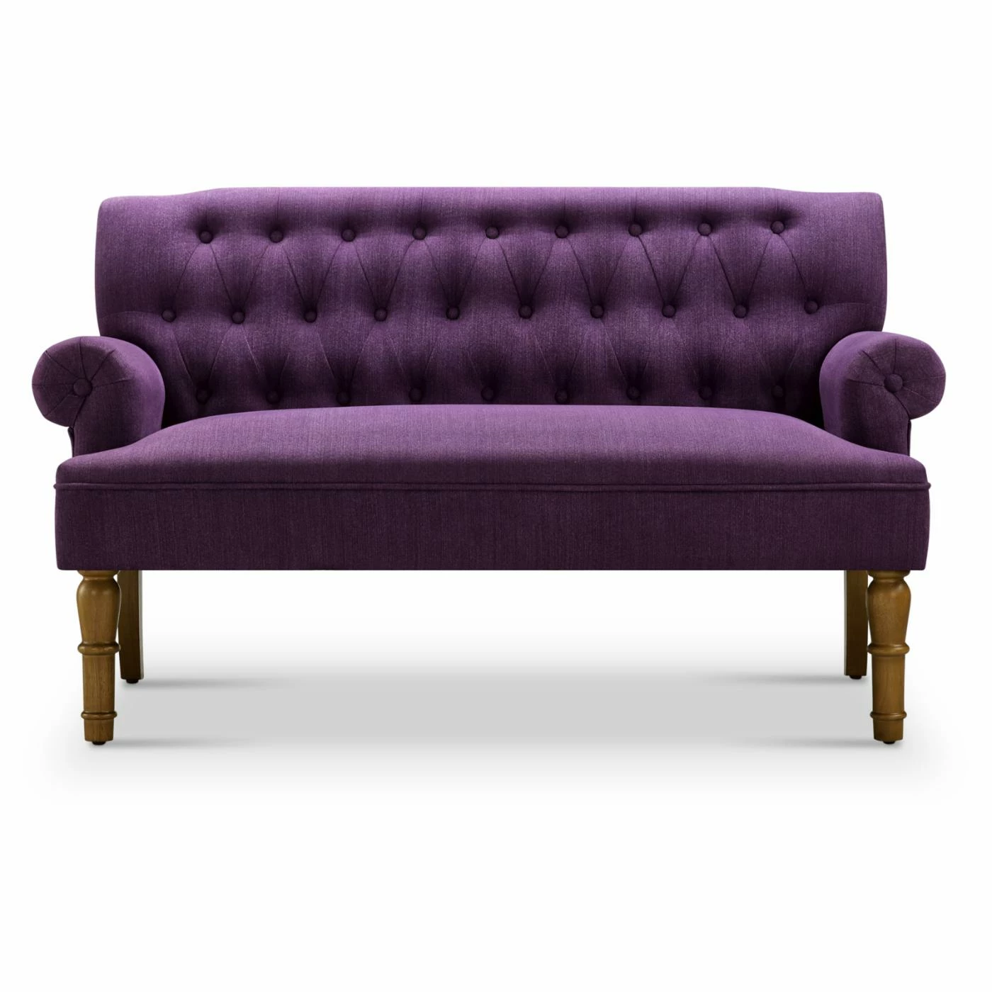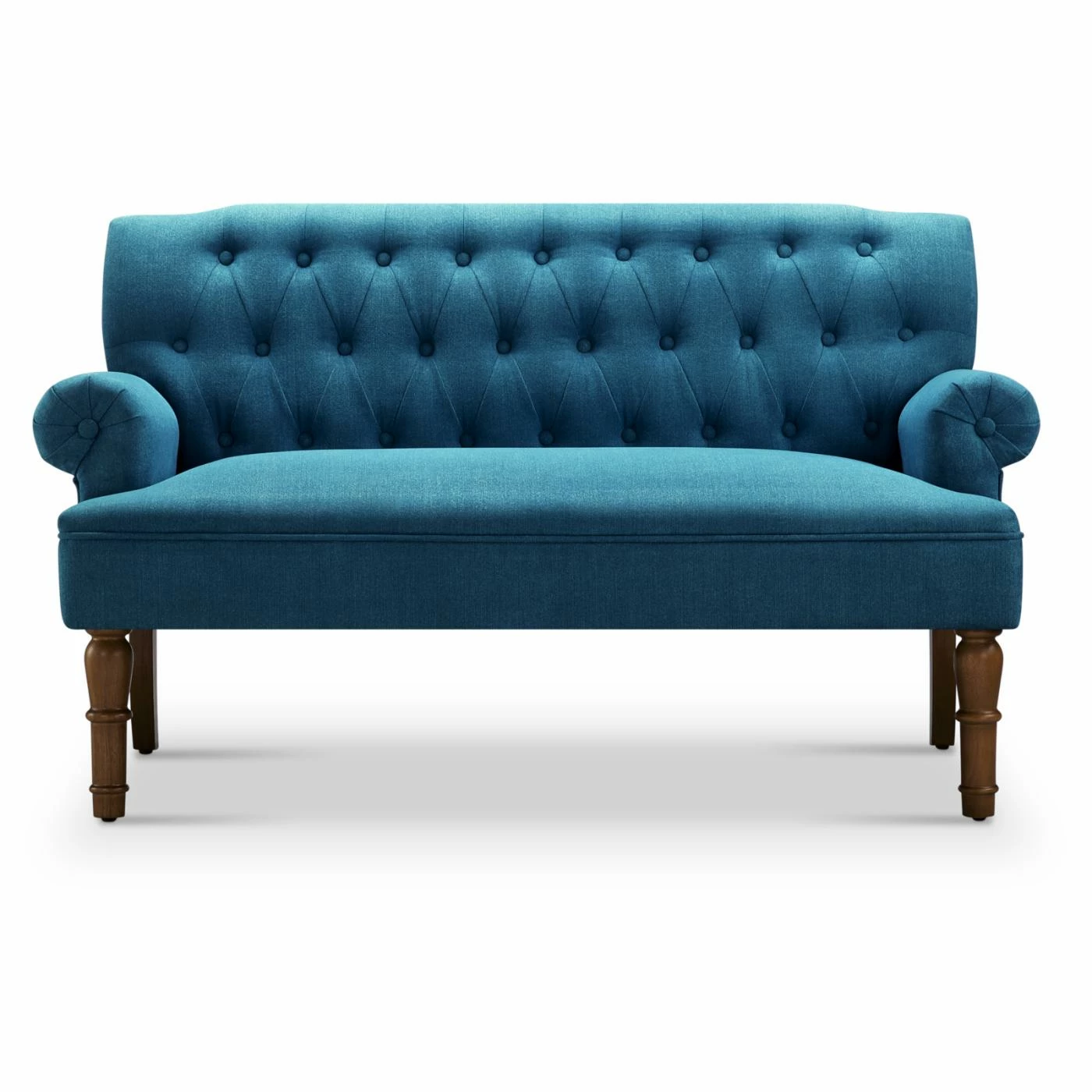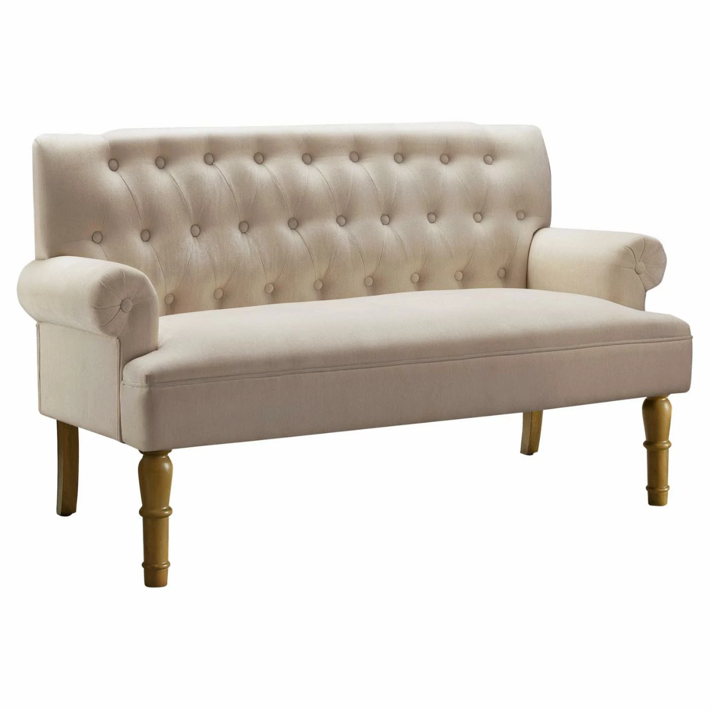 - Rolled armrests and button tufting on back