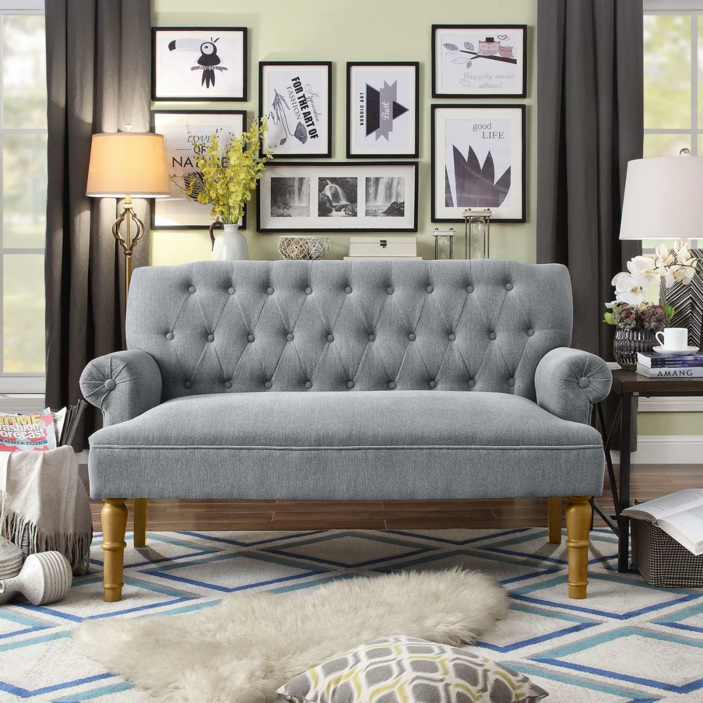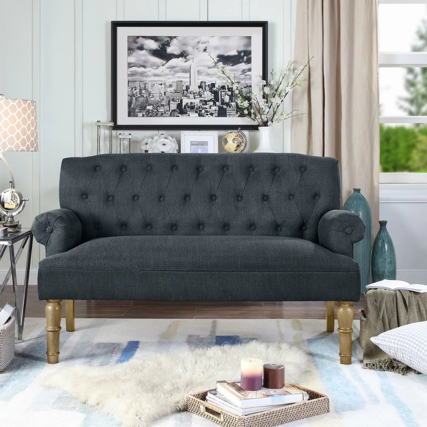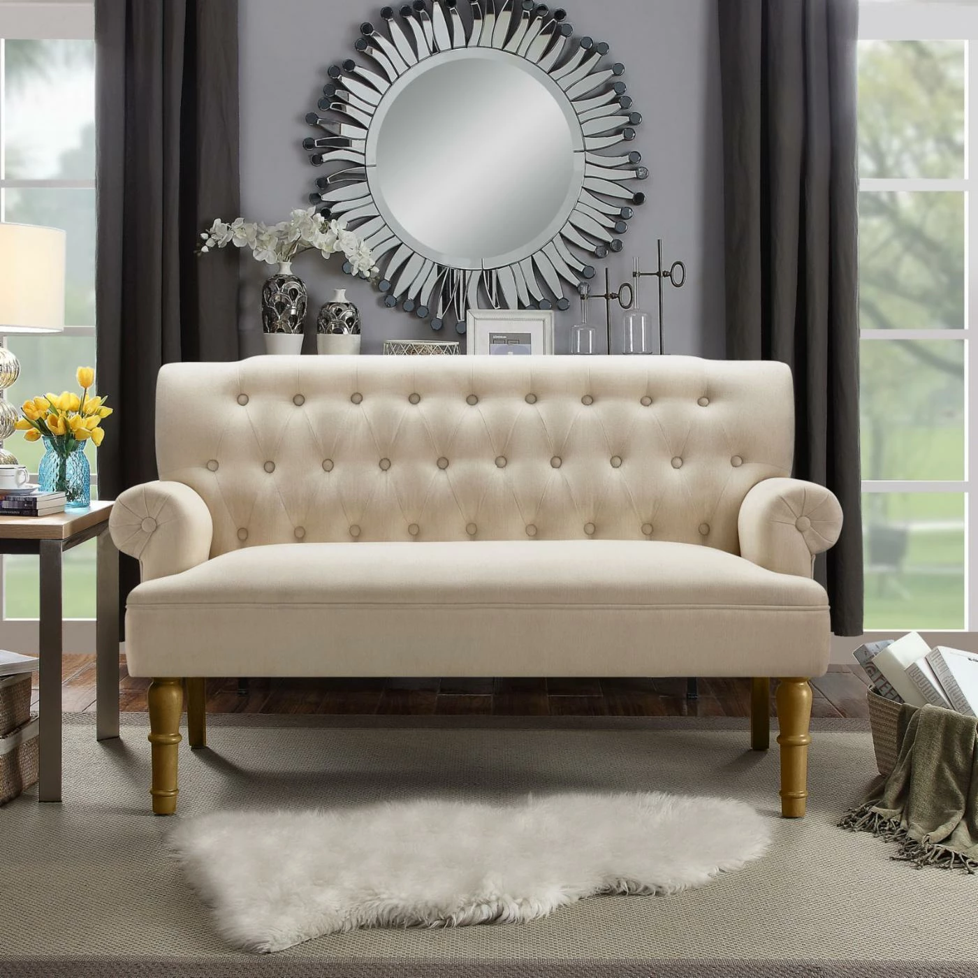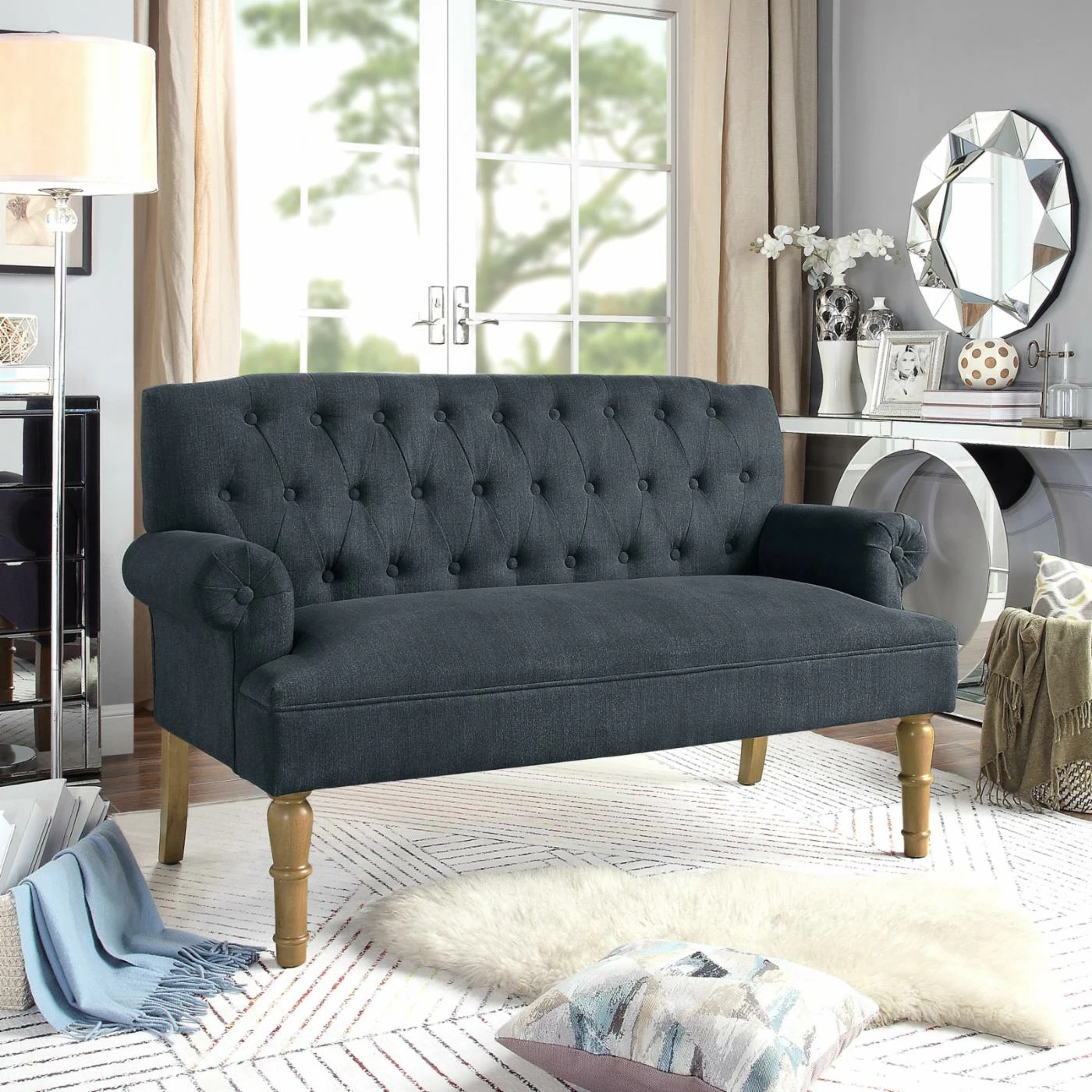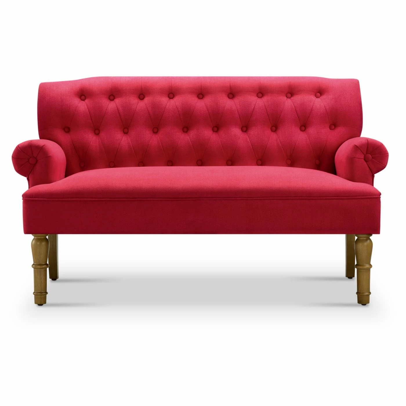 - Rolled armrests and button tufting on back