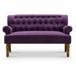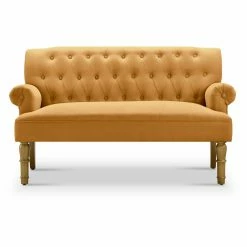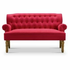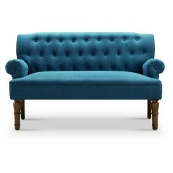The Rosevera Serena Tufted Velvet Settee Loveseat is luxe and elegant, yet understated. The settee loveseat draws from traditional inspiration with button tufting, rolled armrests, and turned-style front legs. A little luxury is added with soft velvet upholstery in your choice of available color. The fabric is complemented by the warm brown glaze finish on the legs. Web suspension and S springs in the seat provide support and foam padding adds comfort. Add this loveseat as part of an inviting area in your entryway or use as seating in your living area.