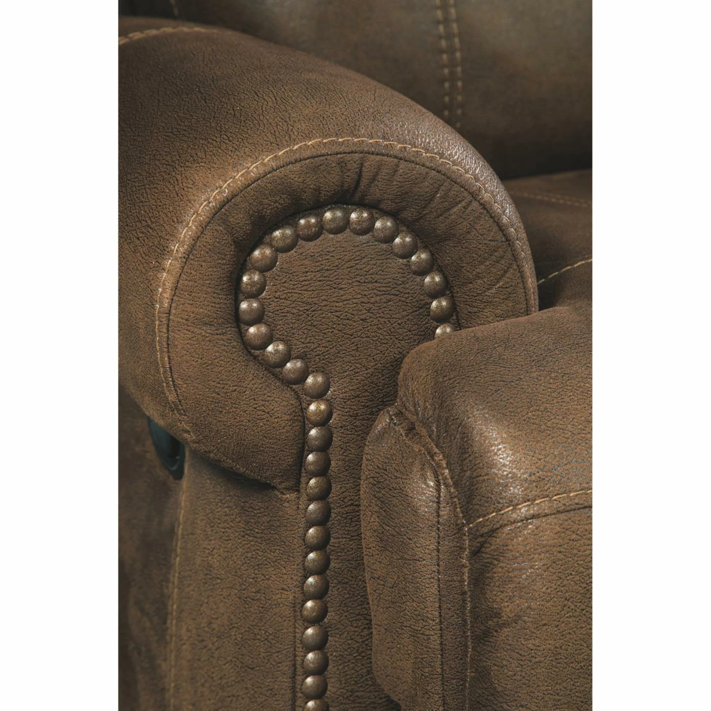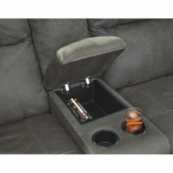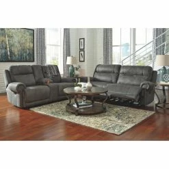 Upscale elegance meets comfort and convenience in the design of the Signature Design by Ashley Austere Double Reclining Loveseat with Console. Both foam-cushioned seats of the faux leather-upholstered loveseat deeply recline with an easy-to-use pull-tab mechanism. Dual cup holders manage your drinks, and a lift-top console keeps reading materials and remote controls neatly organized. Constructed out of solid wood and reinforced with metal through the seats, the frame is durable enough to hold up to years of daily use.
