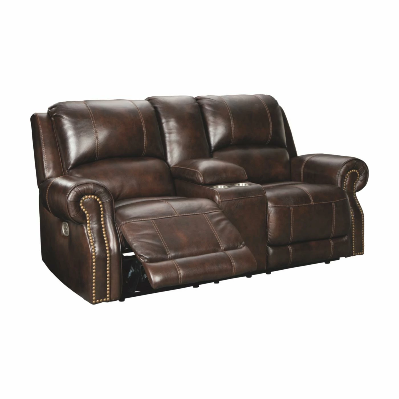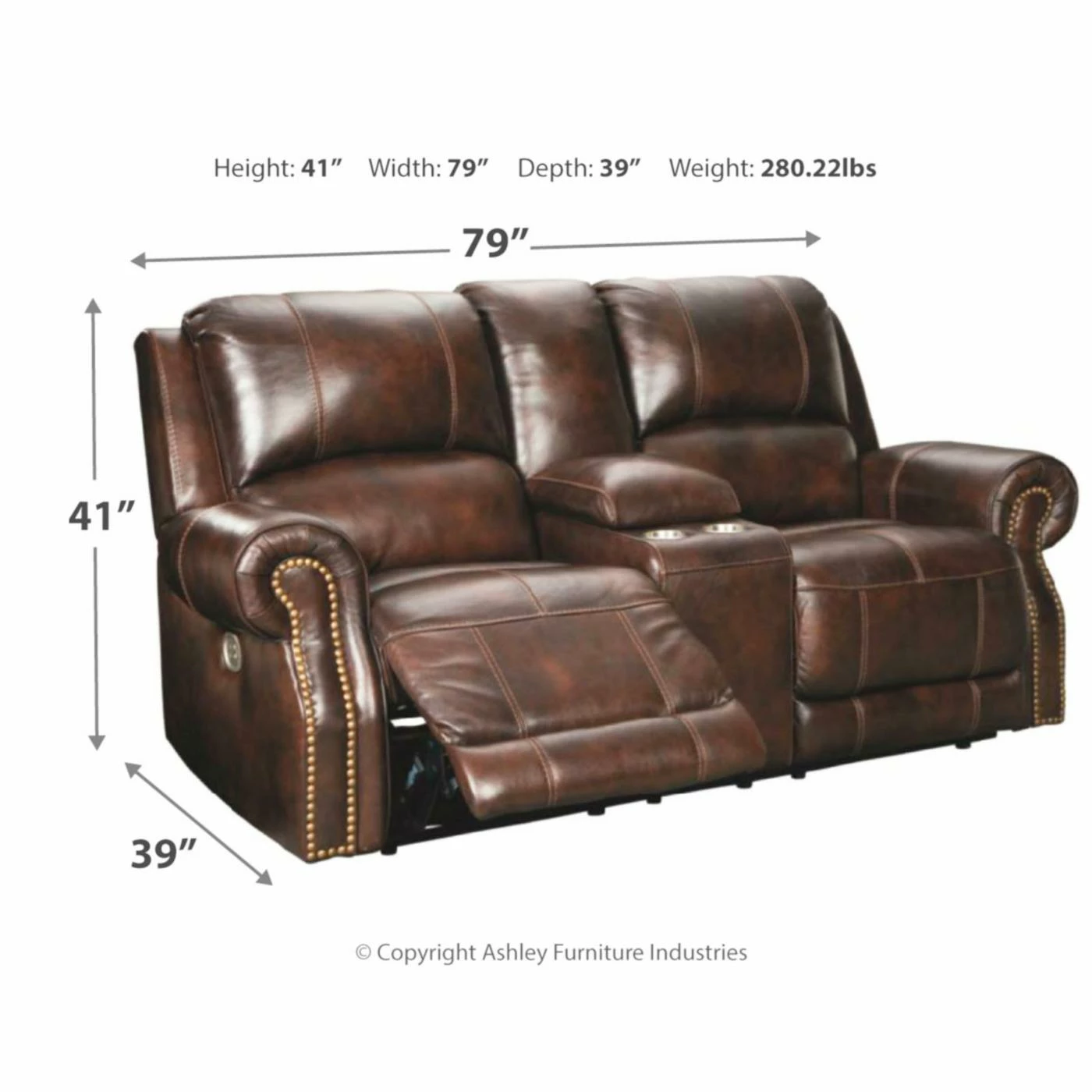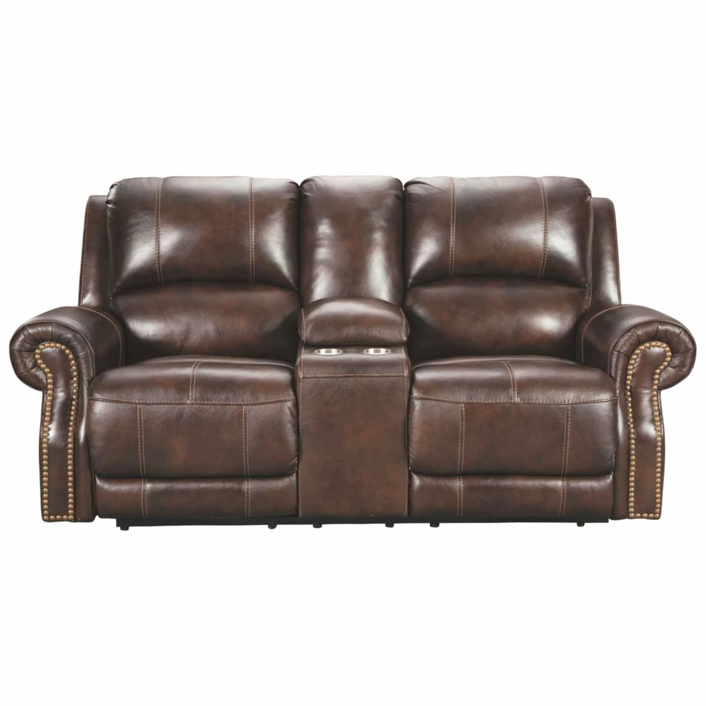 Old meets new with the Signature Design by Ashley Buncrana Power Reclining Loveseat with Console and Adjustable Headrest, which combines traditional design details (nailhead trim and rolled arms) with modern conveniences (USB ports and power reclines). Heavyweight leather upholsters the seat cushions, interior back cushions, and armrests, while faux leather covers the back and sides for affordability. A lift-top storage console between the two seats reveals a hidden storage area for holding remote controls, movies, and charging cords. Slow-close hinges help prevent fingers from accidentally being pinched. There are also two cupholders to give you easy access to your favorite beverage while you relax in front of the television or with guests.
