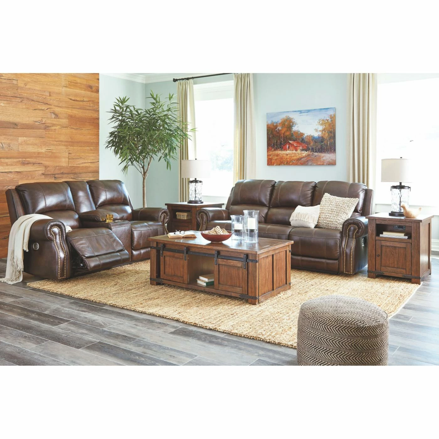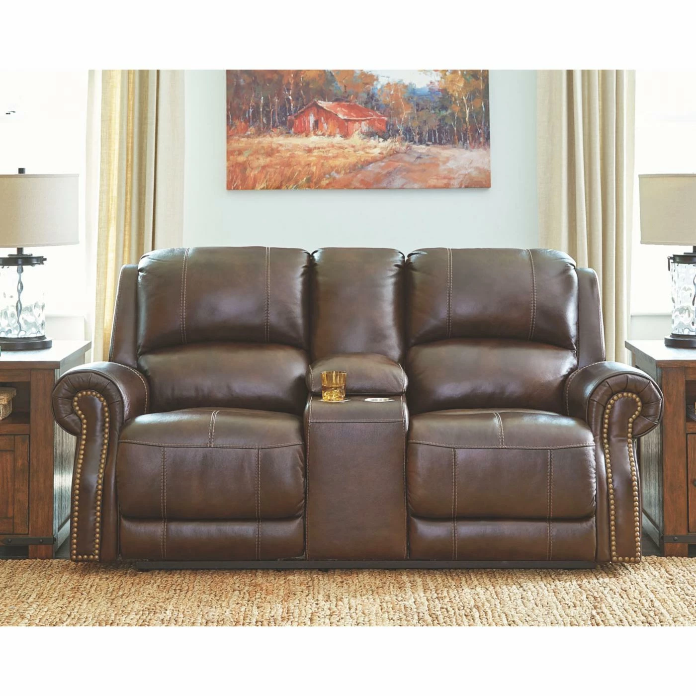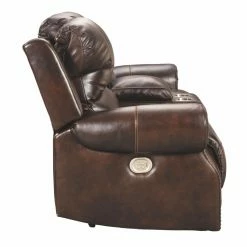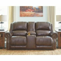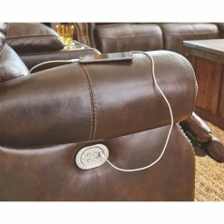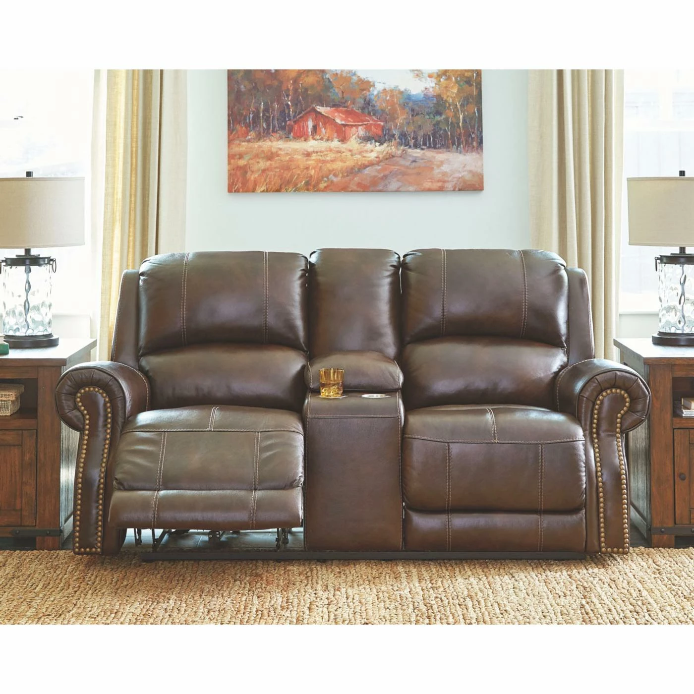 Old meets new with the Signature Design by Ashley Buncrana Power Reclining Loveseat with Console and Adjustable Headrest, which combines traditional design details (nailhead trim and rolled arms) with modern conveniences (USB ports and power reclines). Heavyweight leather upholsters the seat cushions, interior back cushions, and armrests, while faux leather covers the back and sides for affordability. A lift-top storage console between the two seats reveals a hidden storage area for holding remote controls, movies, and charging cords. Slow-close hinges help prevent fingers from accidentally being pinched. There are also two cupholders to give you easy access to your favorite beverage while you relax in front of the television or with guests.