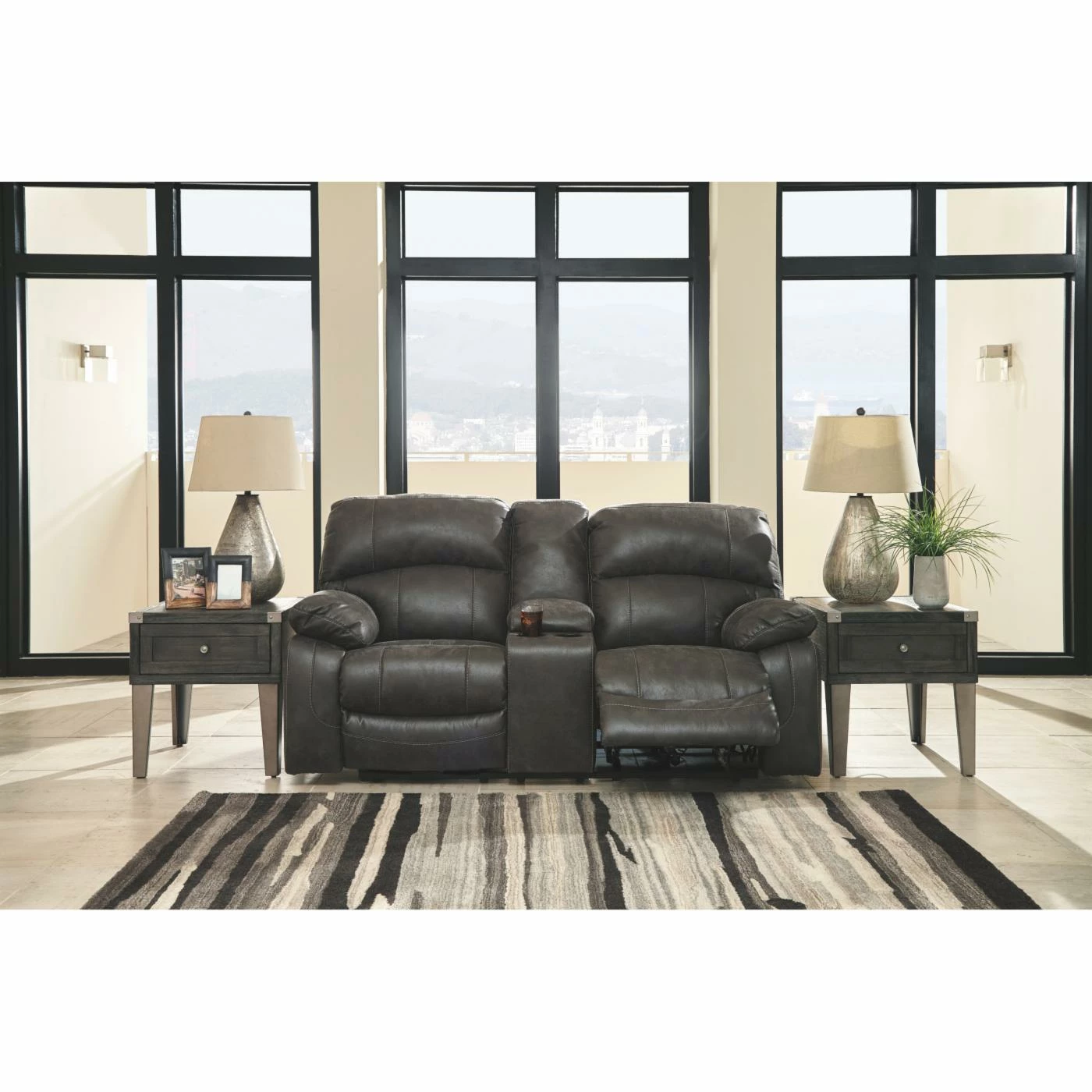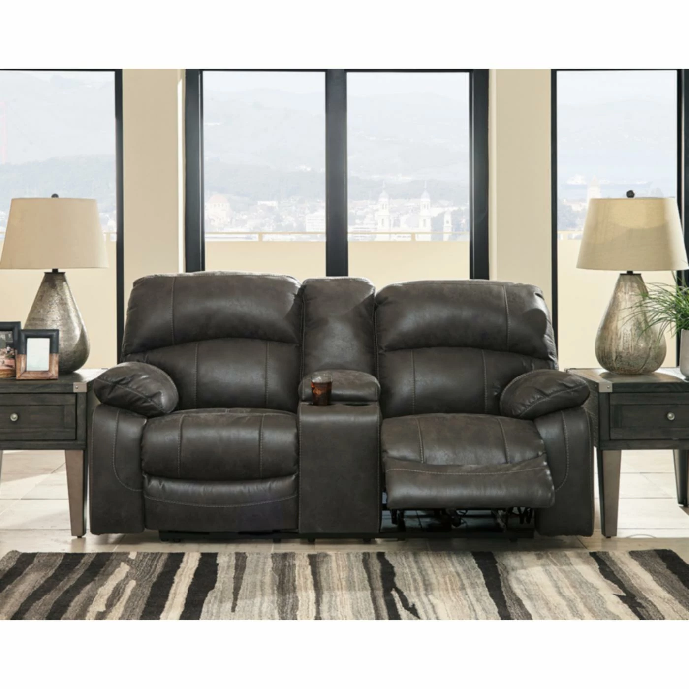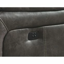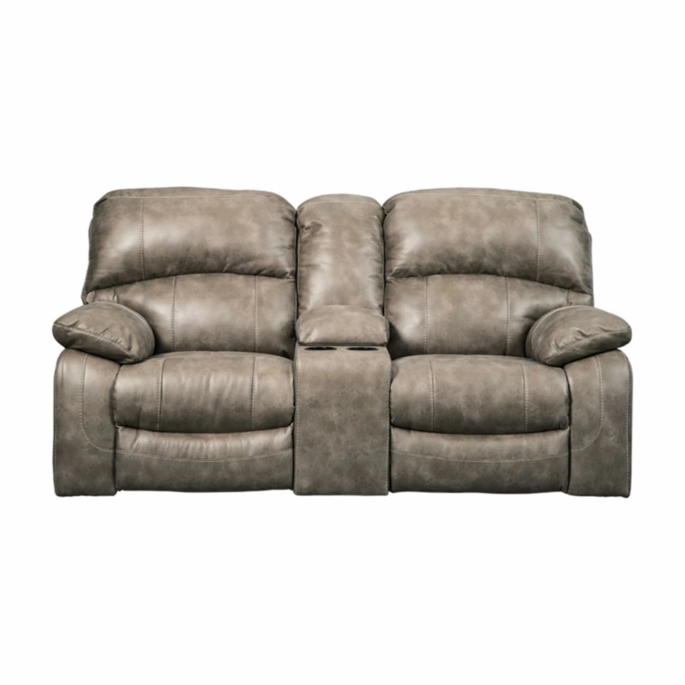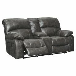 The Signature Design by Ashley Dunwell Power Reclining Loveseat is perfect for your living room, game room, or home theater. Dual reclining seats feature one-touch power controls to adjust the reclining position and headrests. Overstuffed armrests and high-resiliency foam cushions wrapped in a thick polyfill invite you to settle in for even the longest movie marathons. Enjoy the supple softness of the faux leather upholstery, in your choice of available colors. A convenient lift-top center console provides a place to store remotes and boasts two cup holders to keep your beverages handy. This stunning loveseat is constructed on a corner-blocked wood frame with reinforced metal seats.